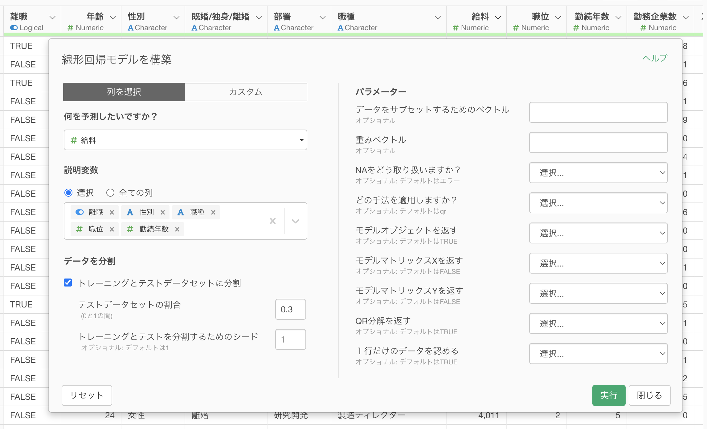 すると以下のように線形回帰の予測モデルを構築するためのダイアログが表示されるので、必要な設定を行い実行します。