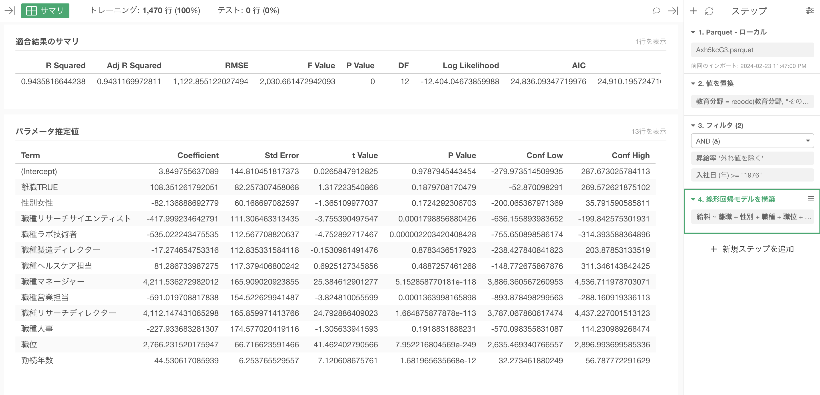 すると、予測モデルの場合は以下のような予測モデルのサマリ情報が表示されます。この結果はアナリティクスビューで表示される「サマリタブ」と「係数表」と同等の情報です。