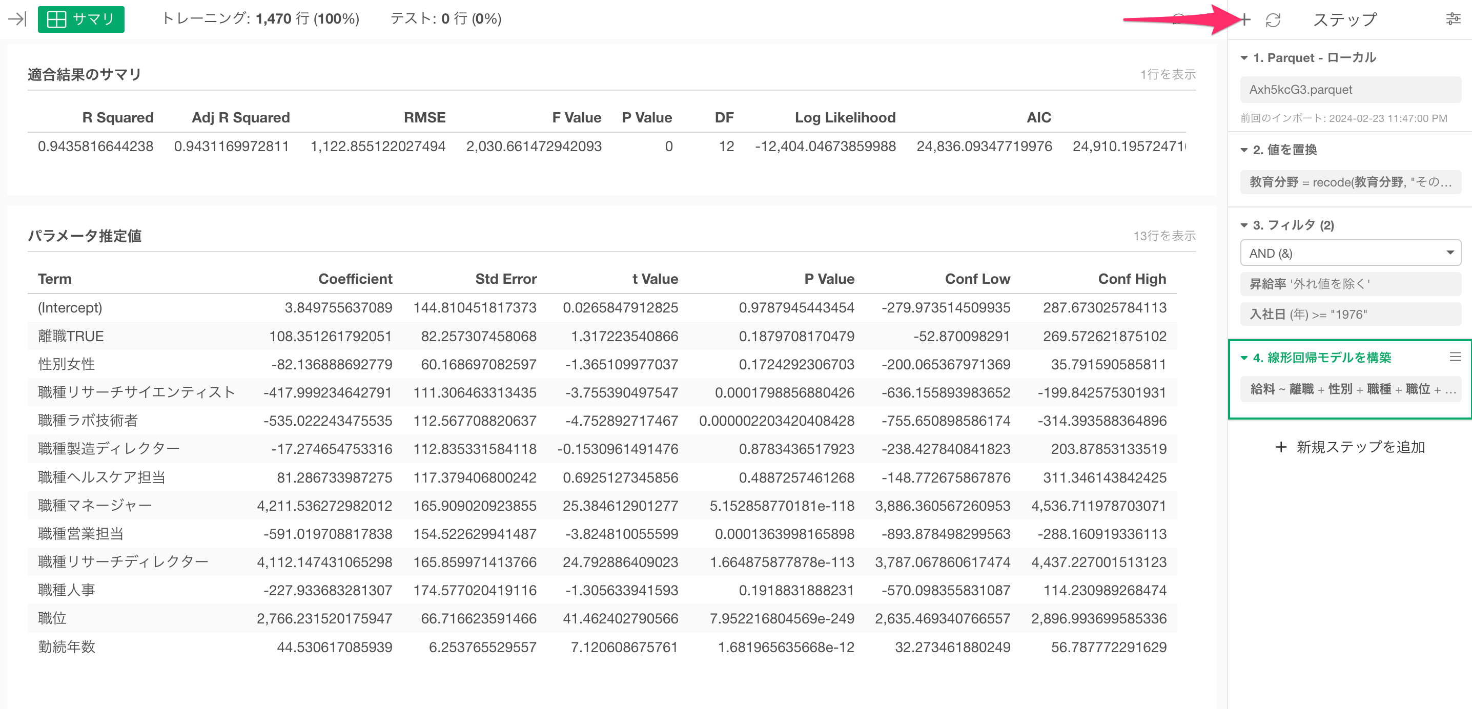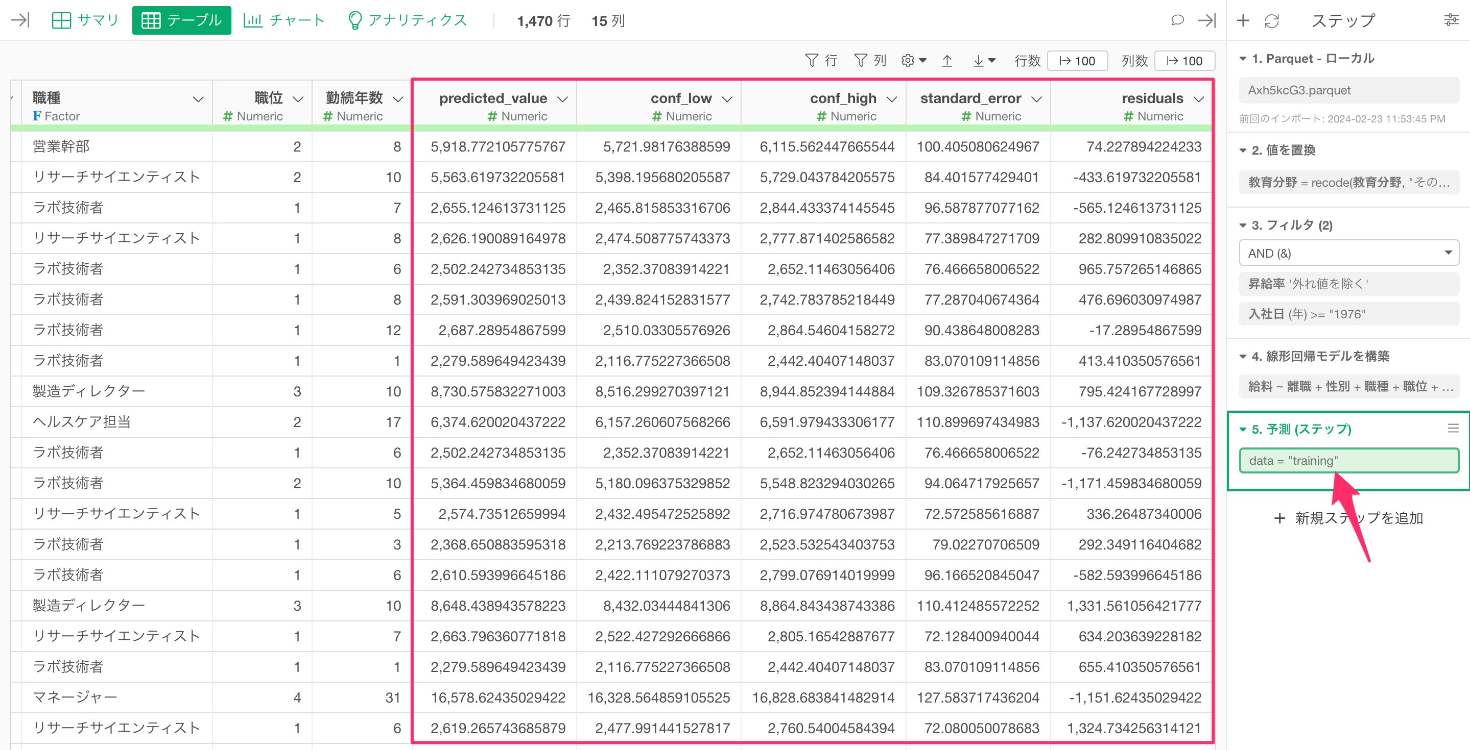 例えば、「トレーニングデータで予測」をクリックして実行すると、以下のように、トレーニングデータに対する予測のステップが追加され、各行に対する予測結果の情報が列として追加され、これらのデータを使った可視化などが可能になります。