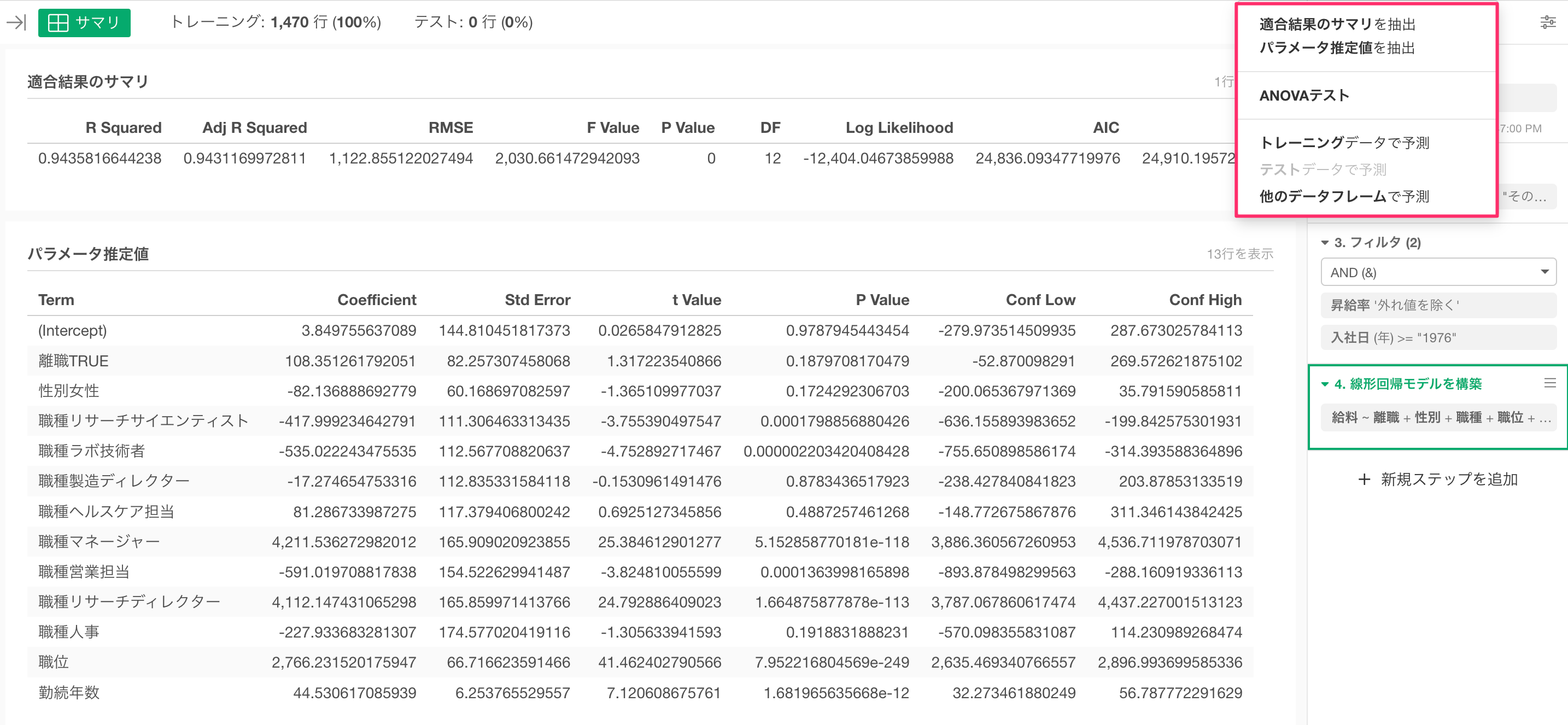 そして、モデルのサマリのステップのステップメニューからはいくつかの後続の処理の選択が可能です。