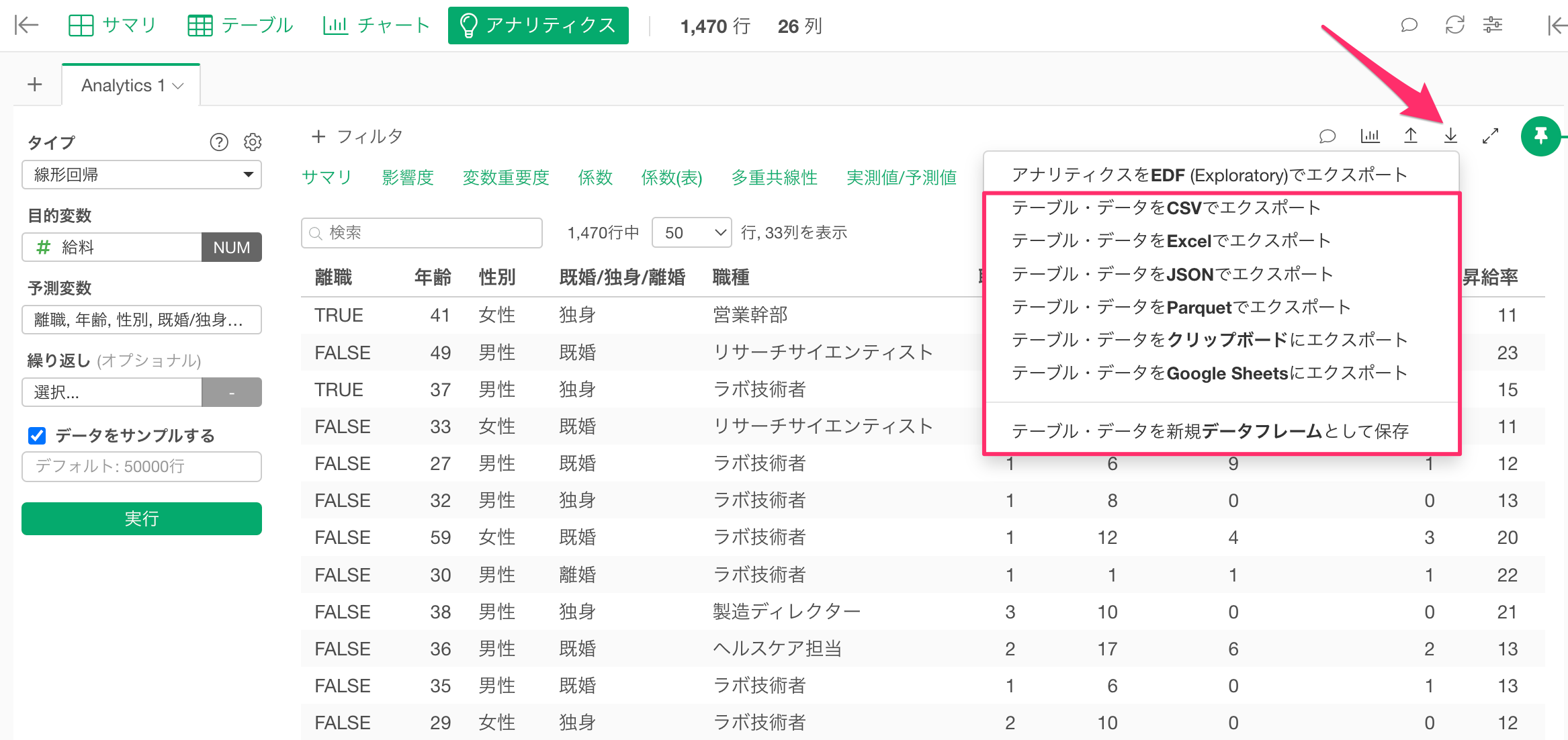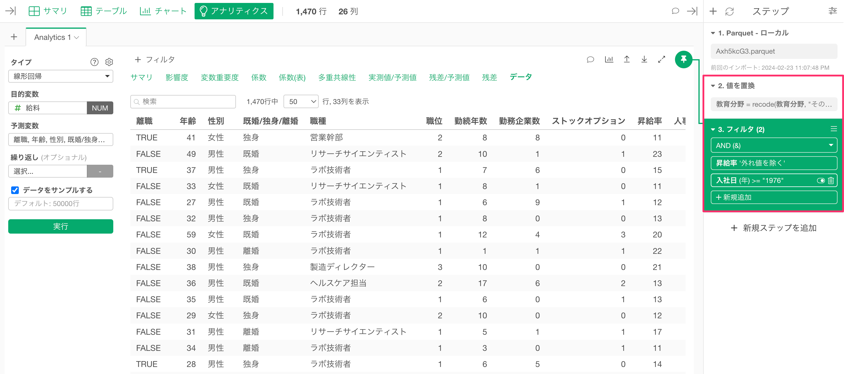 今回は「線形回帰」を例に、ステップでアナリティクスを実行していきます。