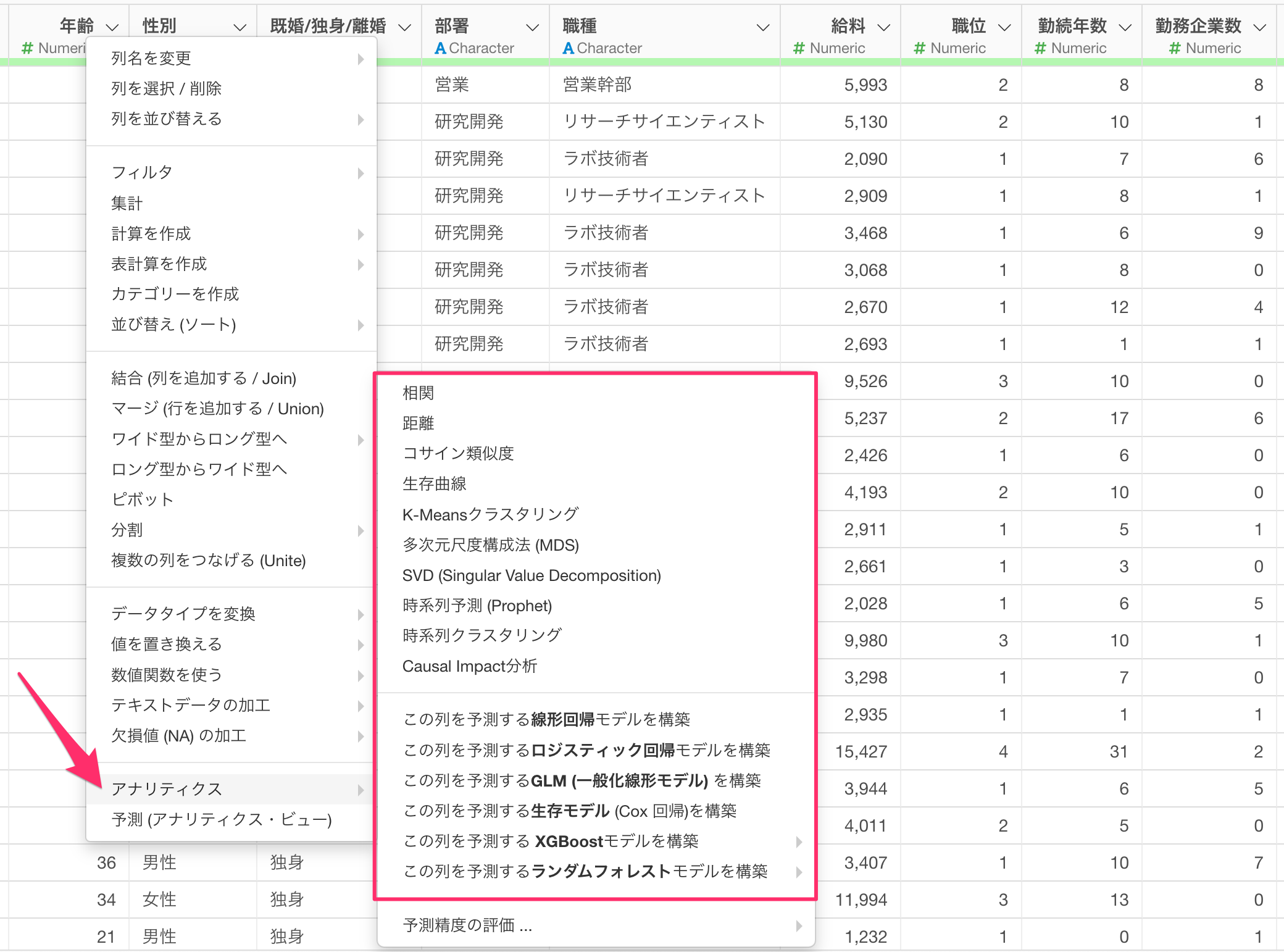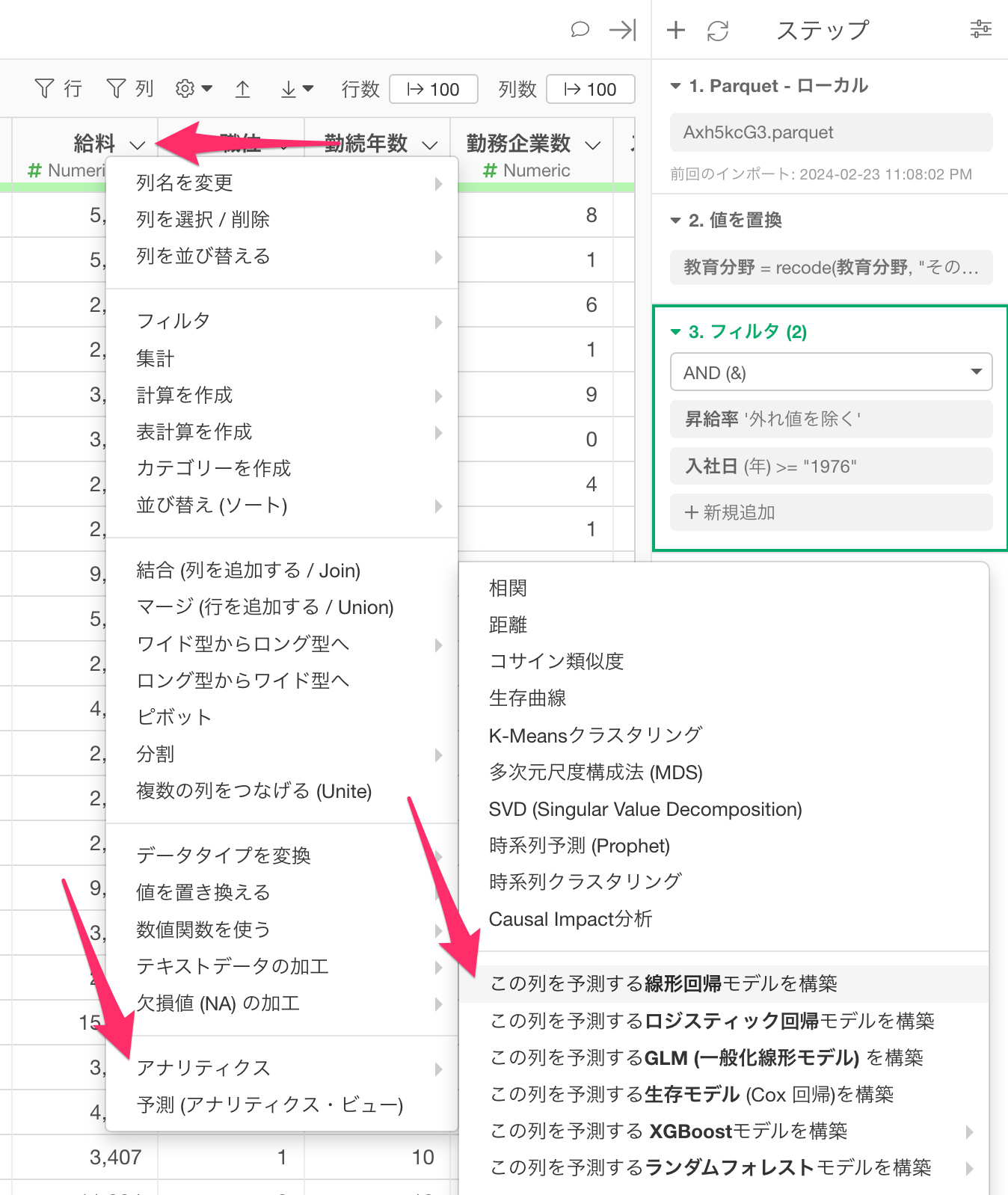 このデータを使って「線形回帰」を使って「給料」を予測したいときには、目的変数である「給料」の列ヘッダーメニューから、「アナリティクス」の「この列を予測する線形回帰モデルを構築」を選択します。