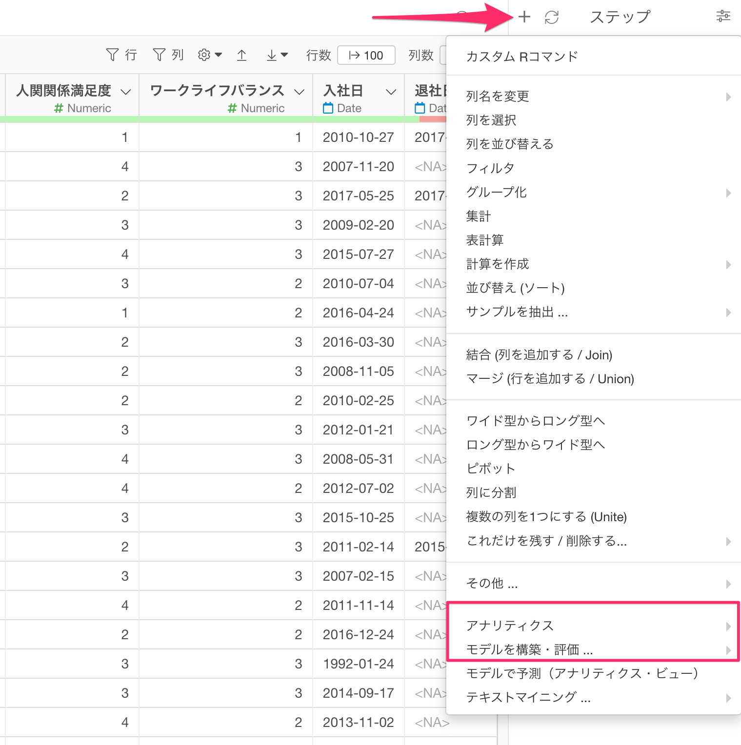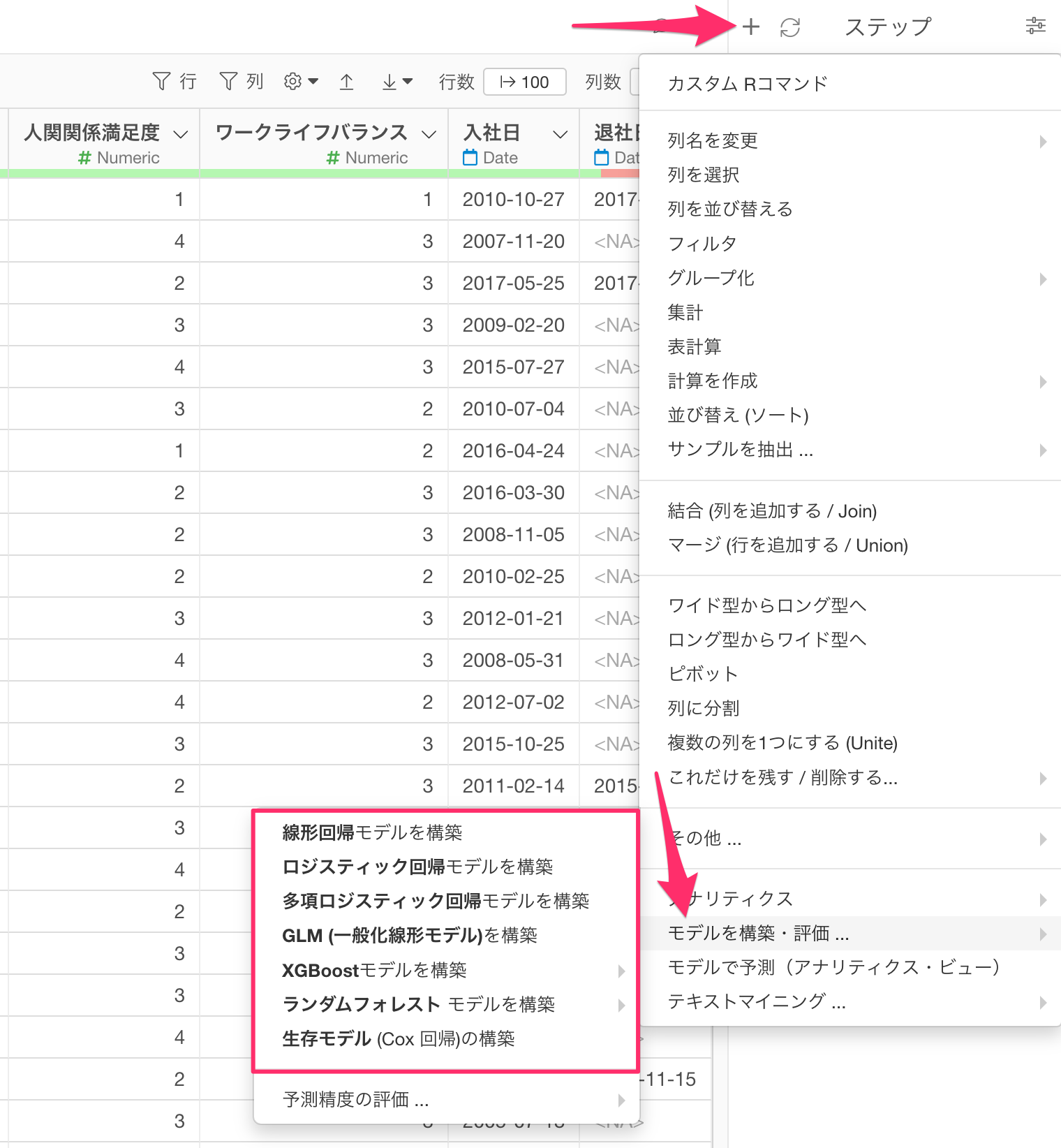 各種アナリティクスは、ステップメニューの「アナリティクス」または「モデルを構築・評価」からもアクセスが可能です。