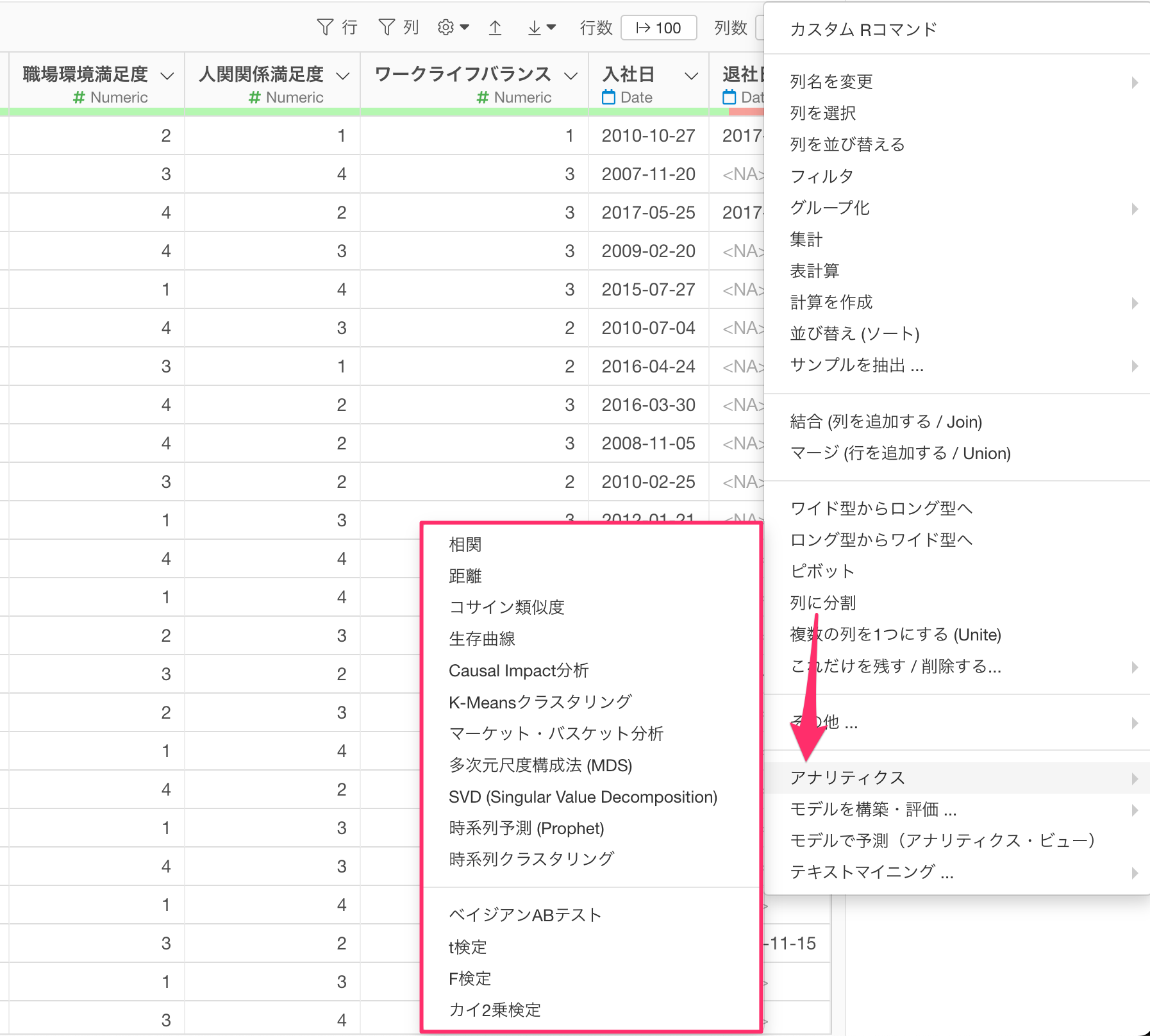 Exploratoryで統計や機械学習の手法を使った分析を行いときには、一般的に「アナリティクス・ビュー」に移動して、利用したいアナリティクスのタイプを選択して、分析を進めることになります。(各アナリティクスの使い方はこちらをご覧ください)