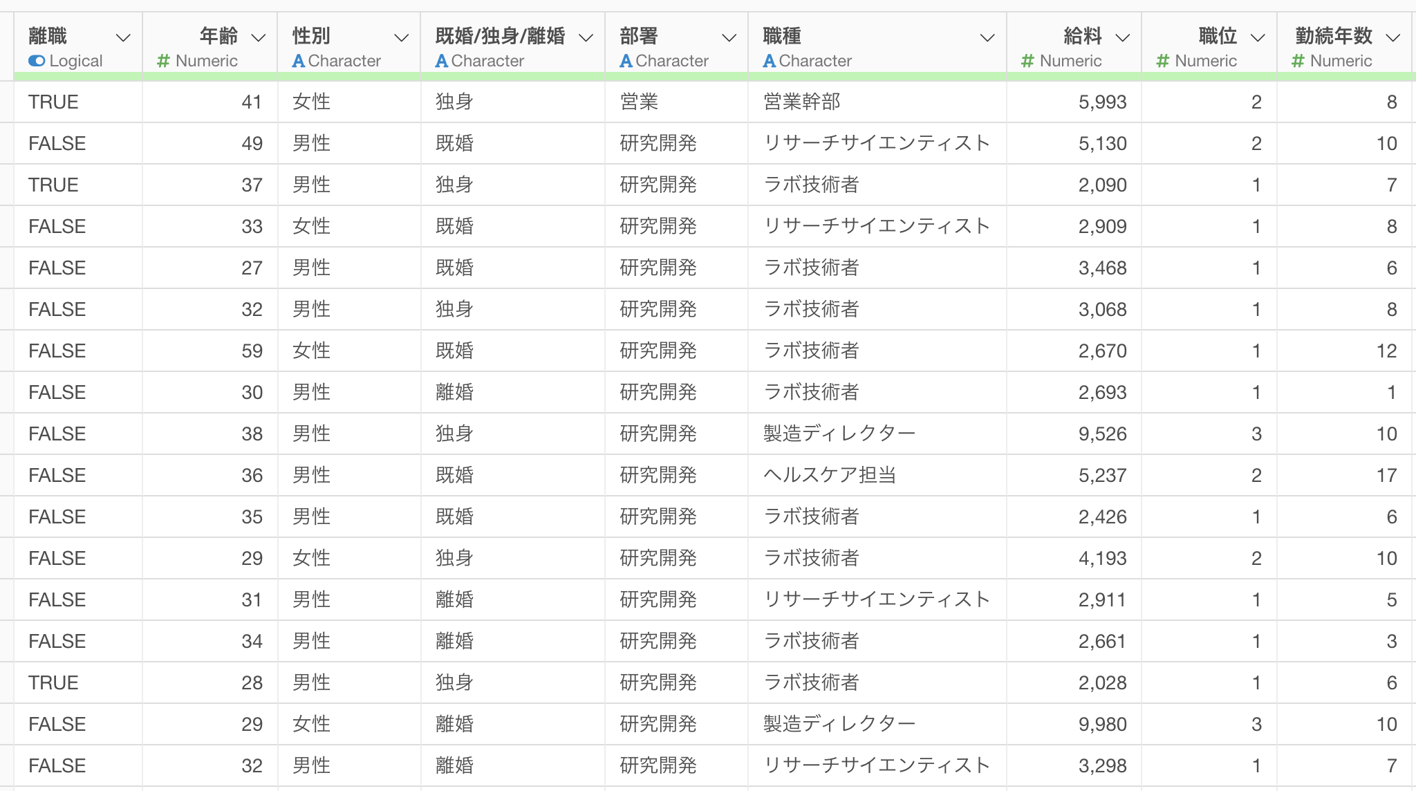 例えば、以下のように、1行が1人の従業員を表し、各従業員の給料などの属性情報を列に持つデータがあったとします。