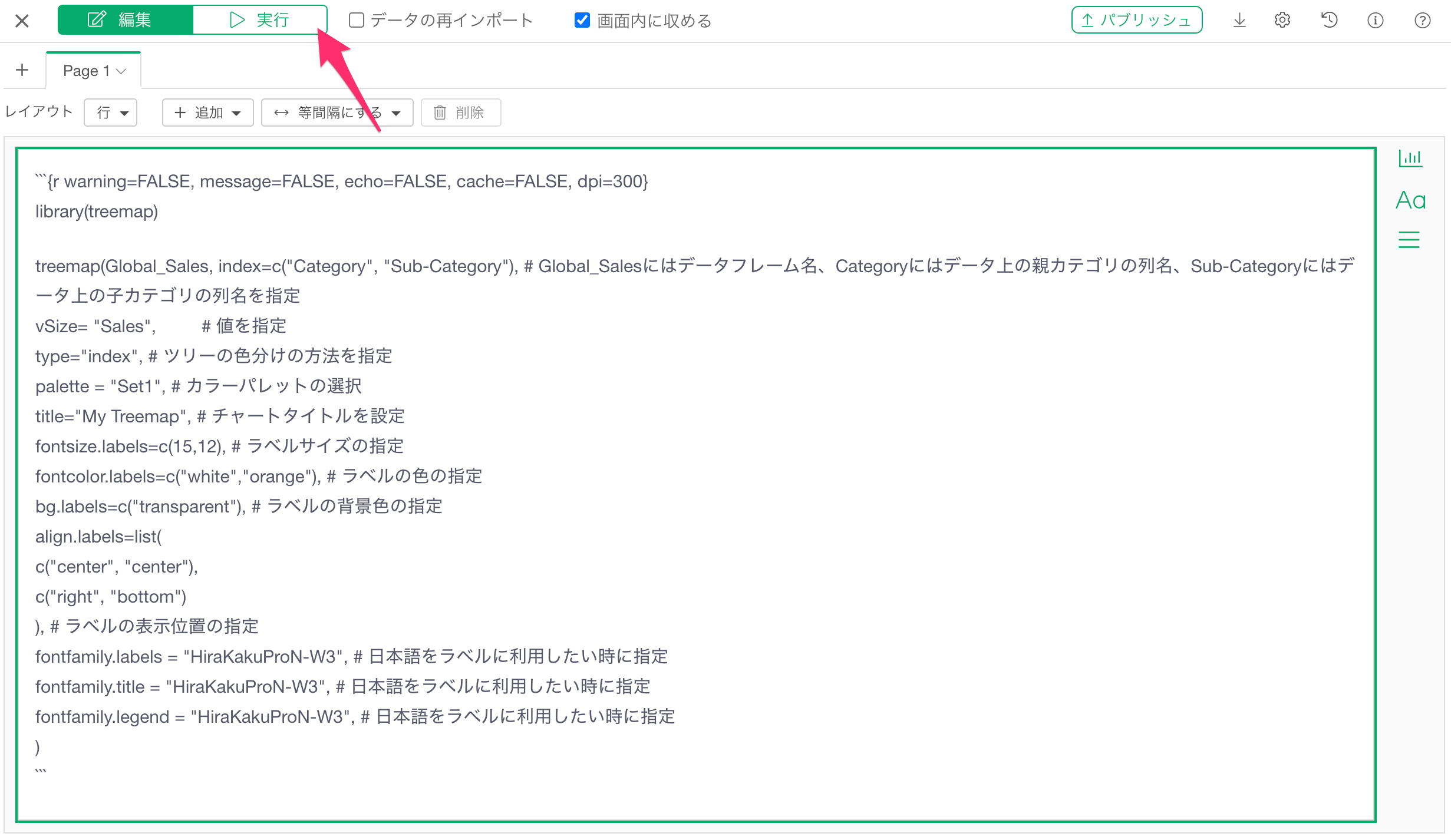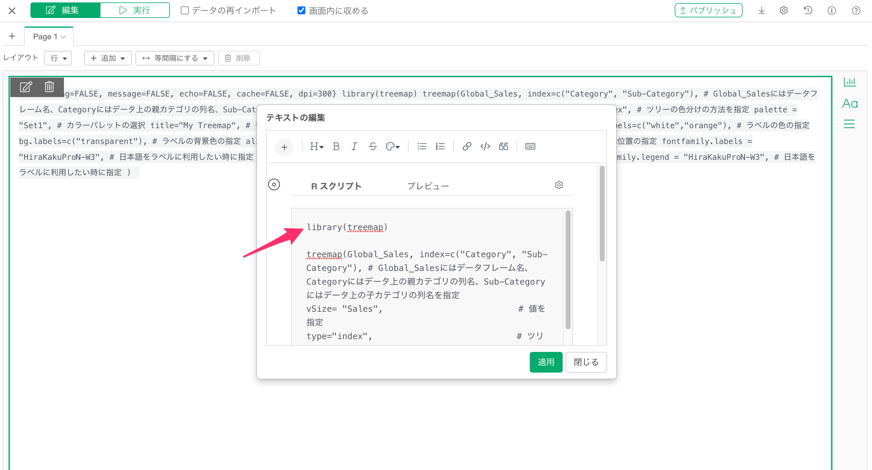先程利用したコードをRスクリプトの入力ダイアログに追加します。