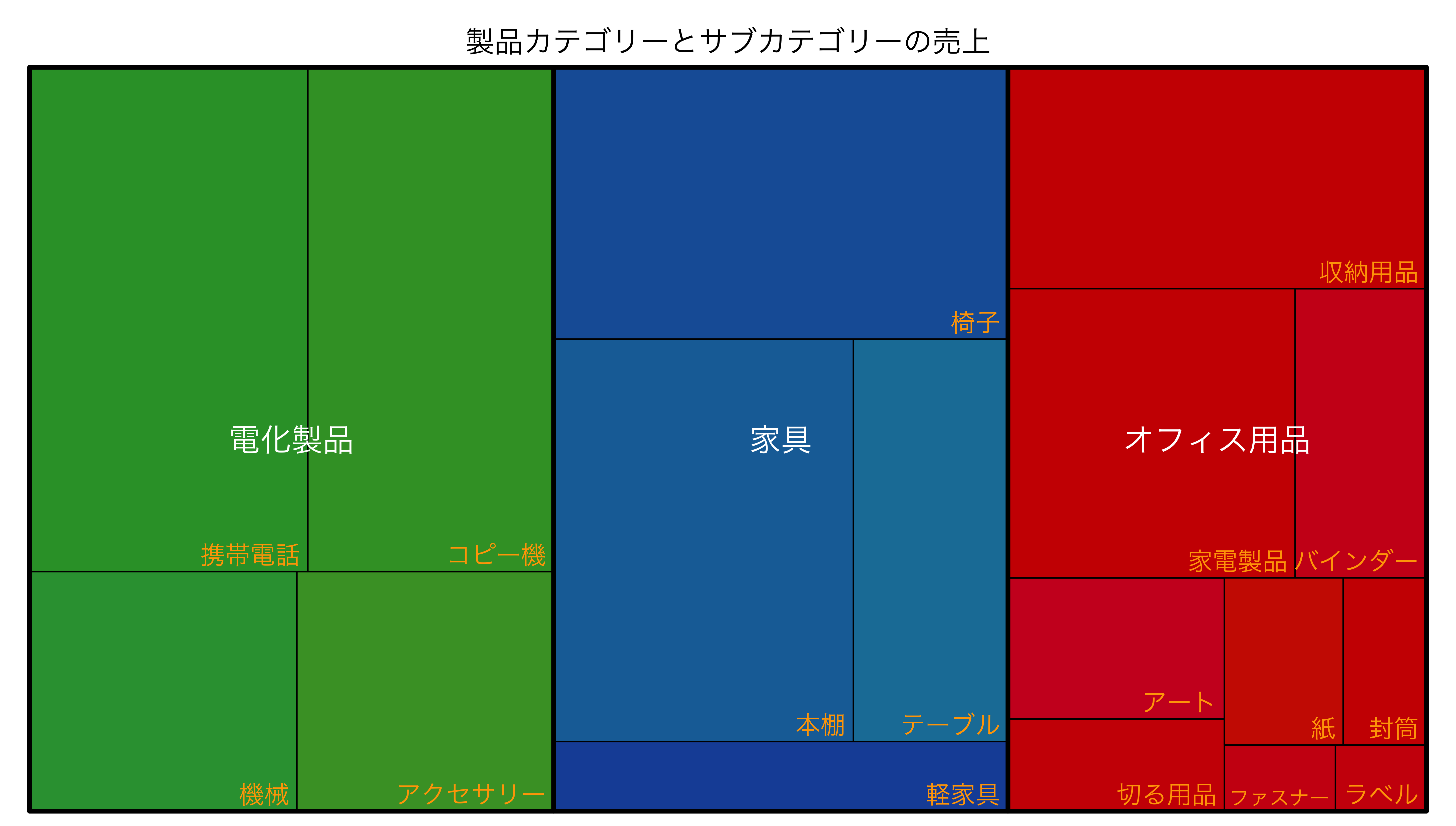 カテゴリー別の売上構成など、「全体の中でどの部分がどの程度を占めているか」を階層ごとに一目で把握したいときに特に有効です。