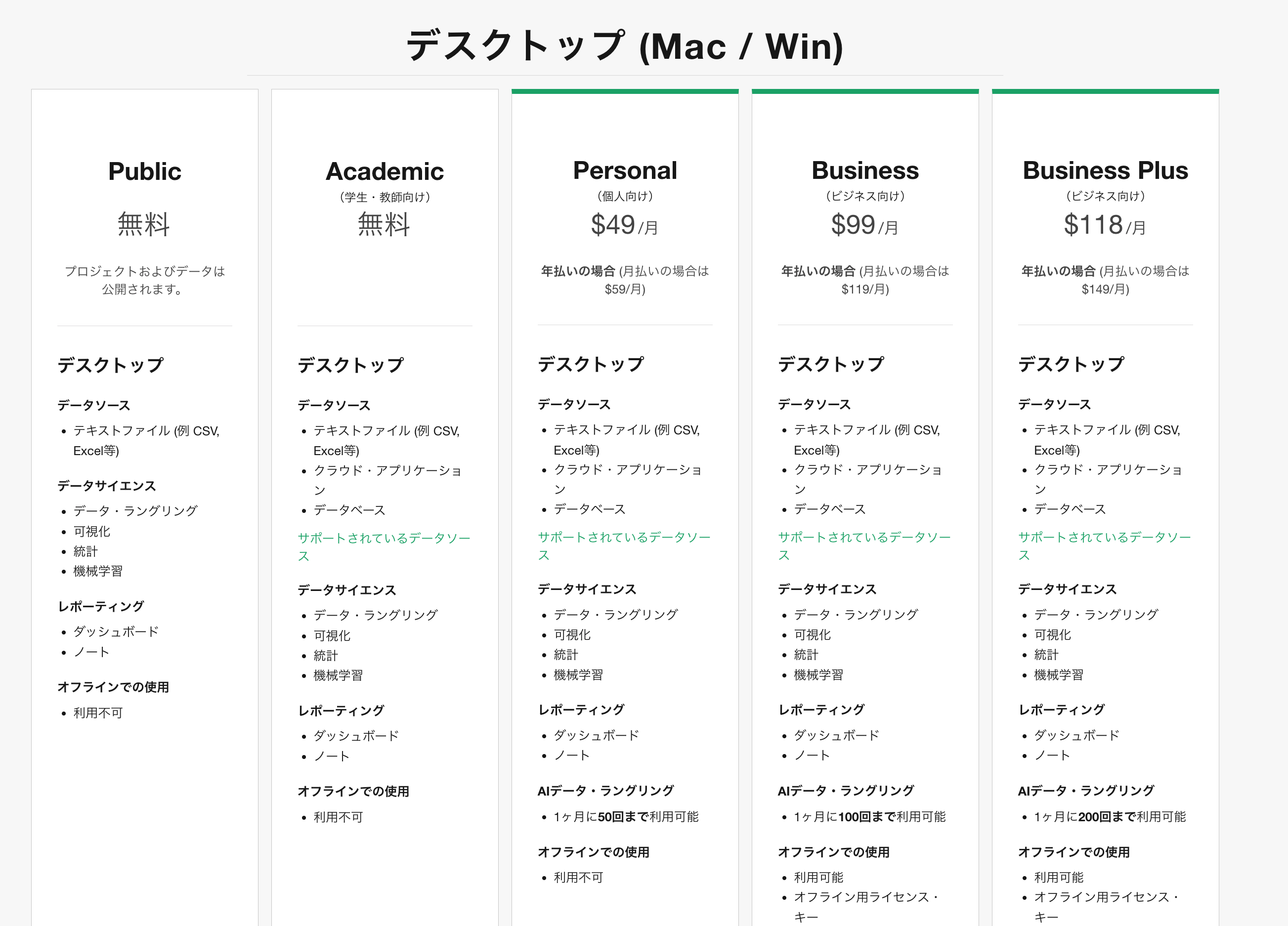 Exploratoryでは、お客様のご利用ニーズに合わせて複数のプランを用意しています。