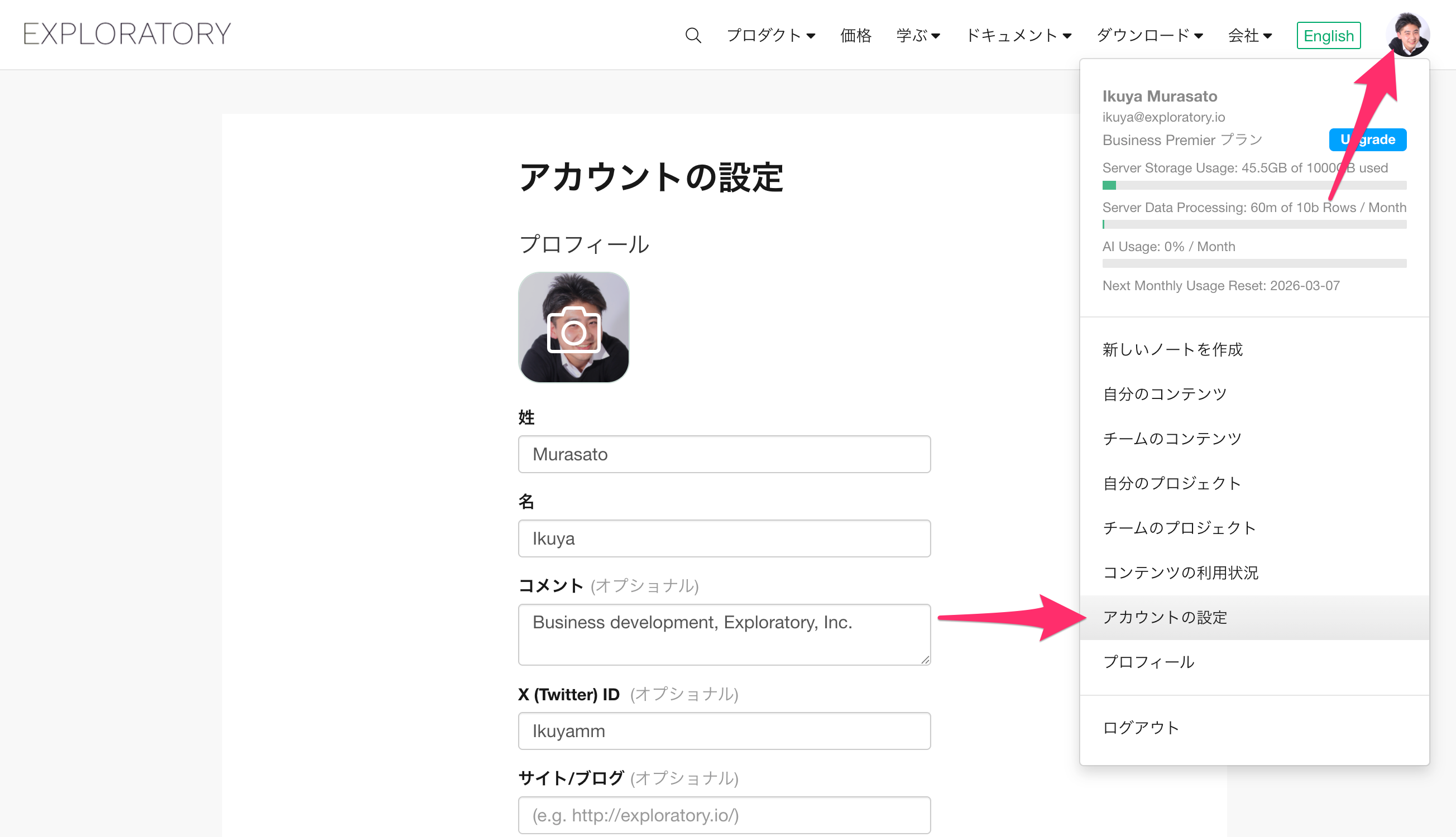 また、Exploratoryを利用いただく過程で、ストレージ容量の増加やAI利用量の拡大などのニーズが生じた場合、ご契約中のプランをアップグレードいただくことが可能です。