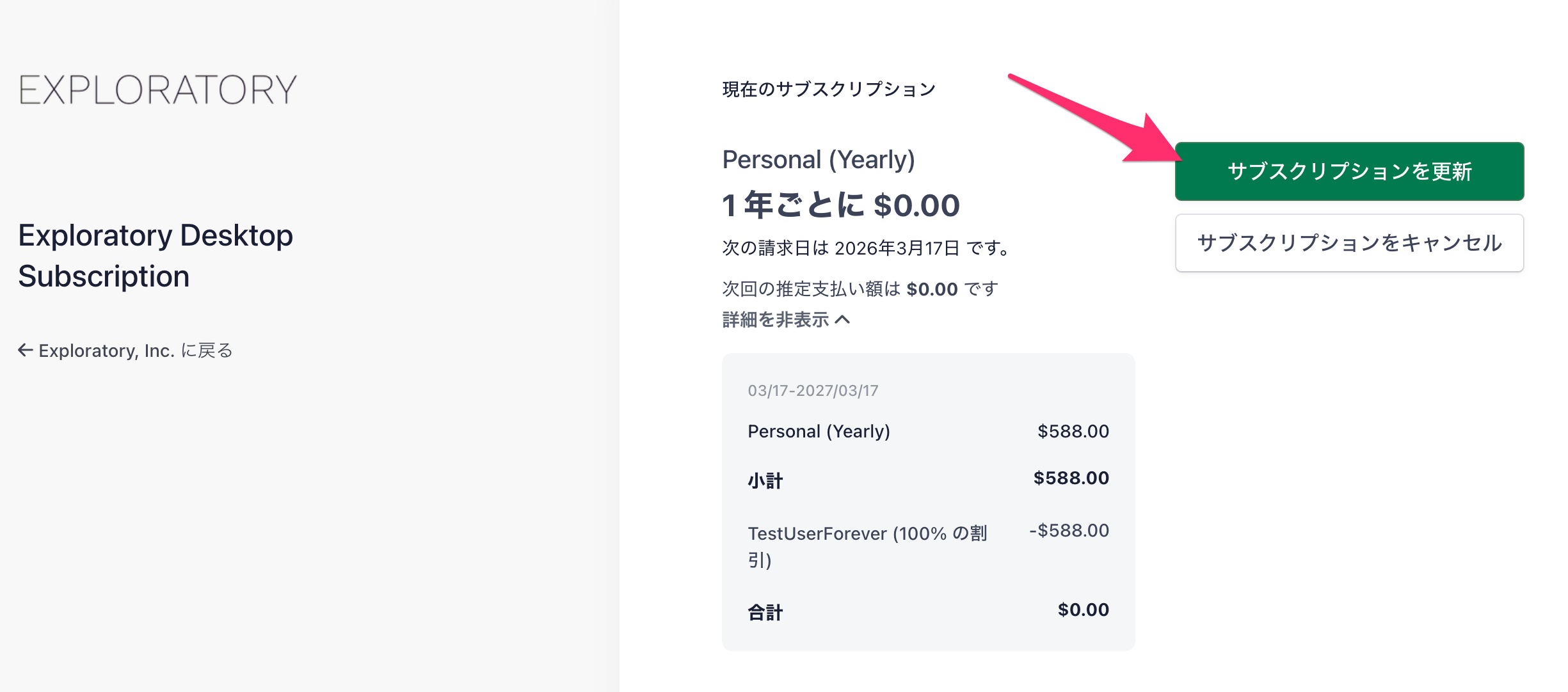 サブスクリプションの管理ページに移動したら、「サブスクリプションを更新」ボタンをクリックします。