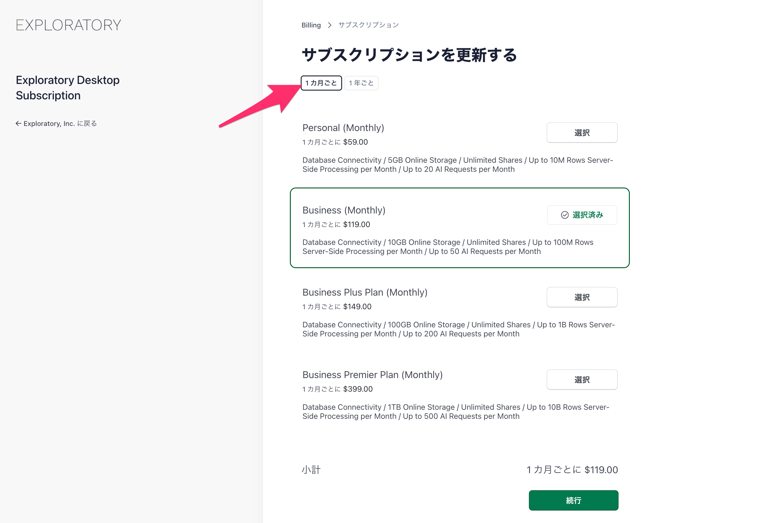 既にExploratoryの有償のプランをご契約中のお客様の場合、ご利用を継続される期間(月額・年額)や、お支払い方法のご希望に応じて、以下のいずれかの方法をお選びください。