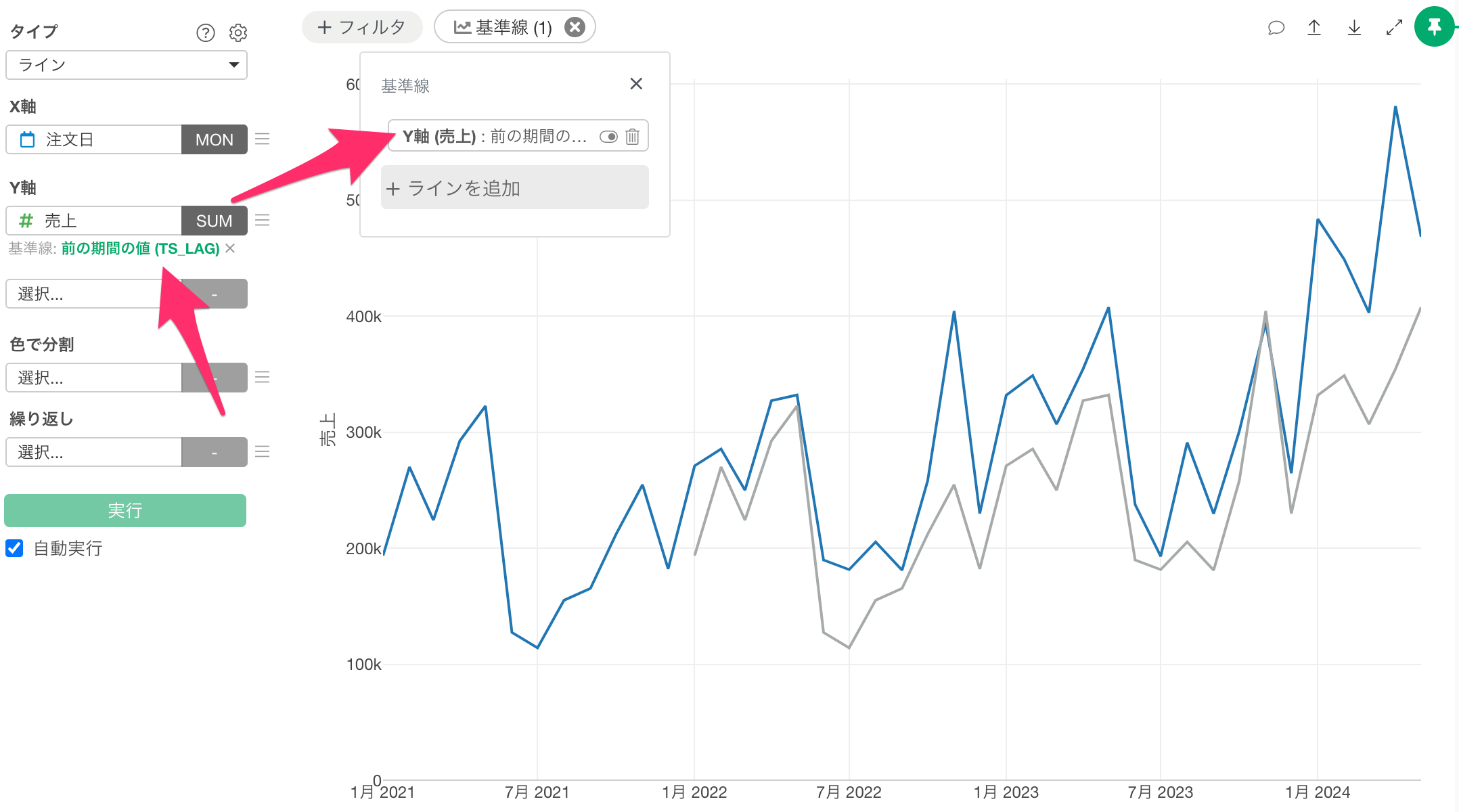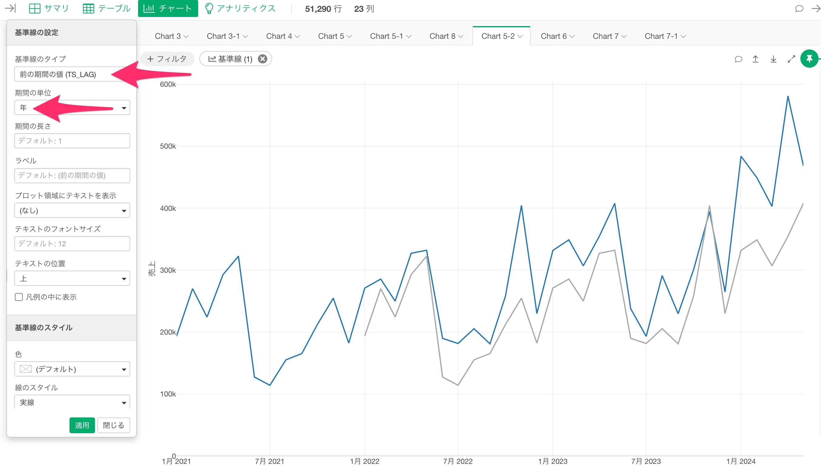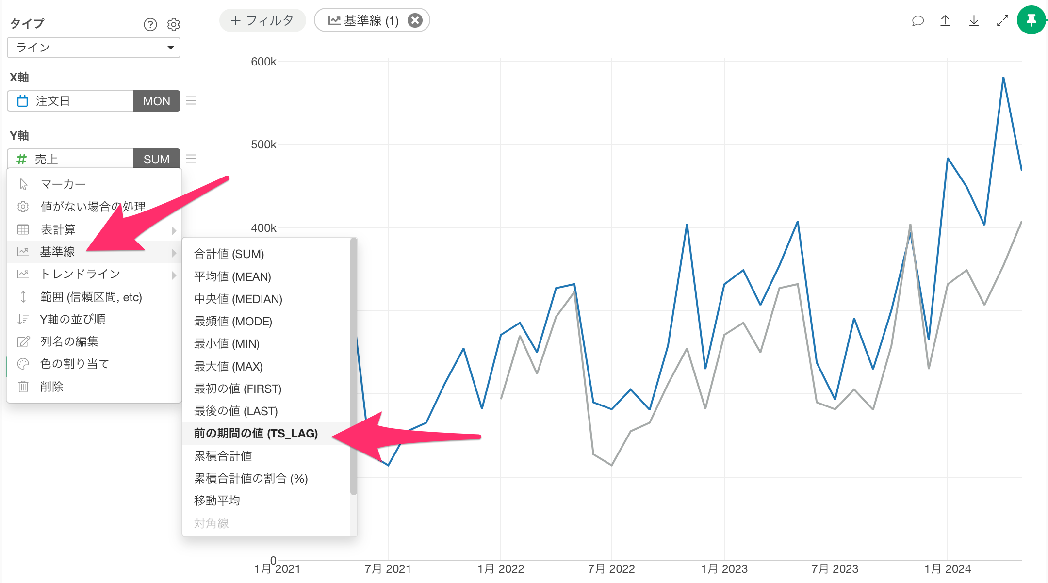 この機能を使うことで、前年や前月の値を基準線として表示することができます。