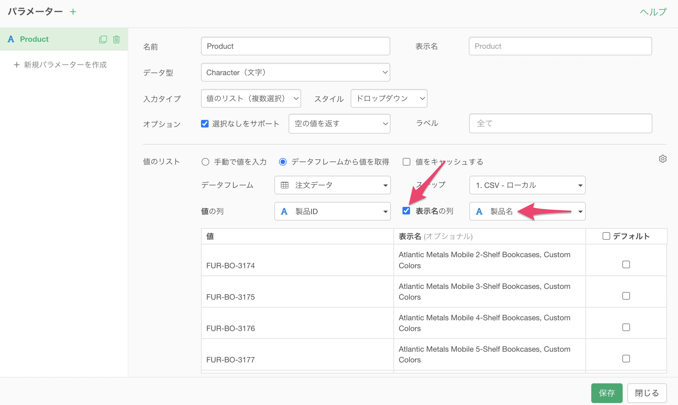 パラメーターの「表示名の列」にチェックをつけ、表示名に「製品名」の列を選択して保存します。