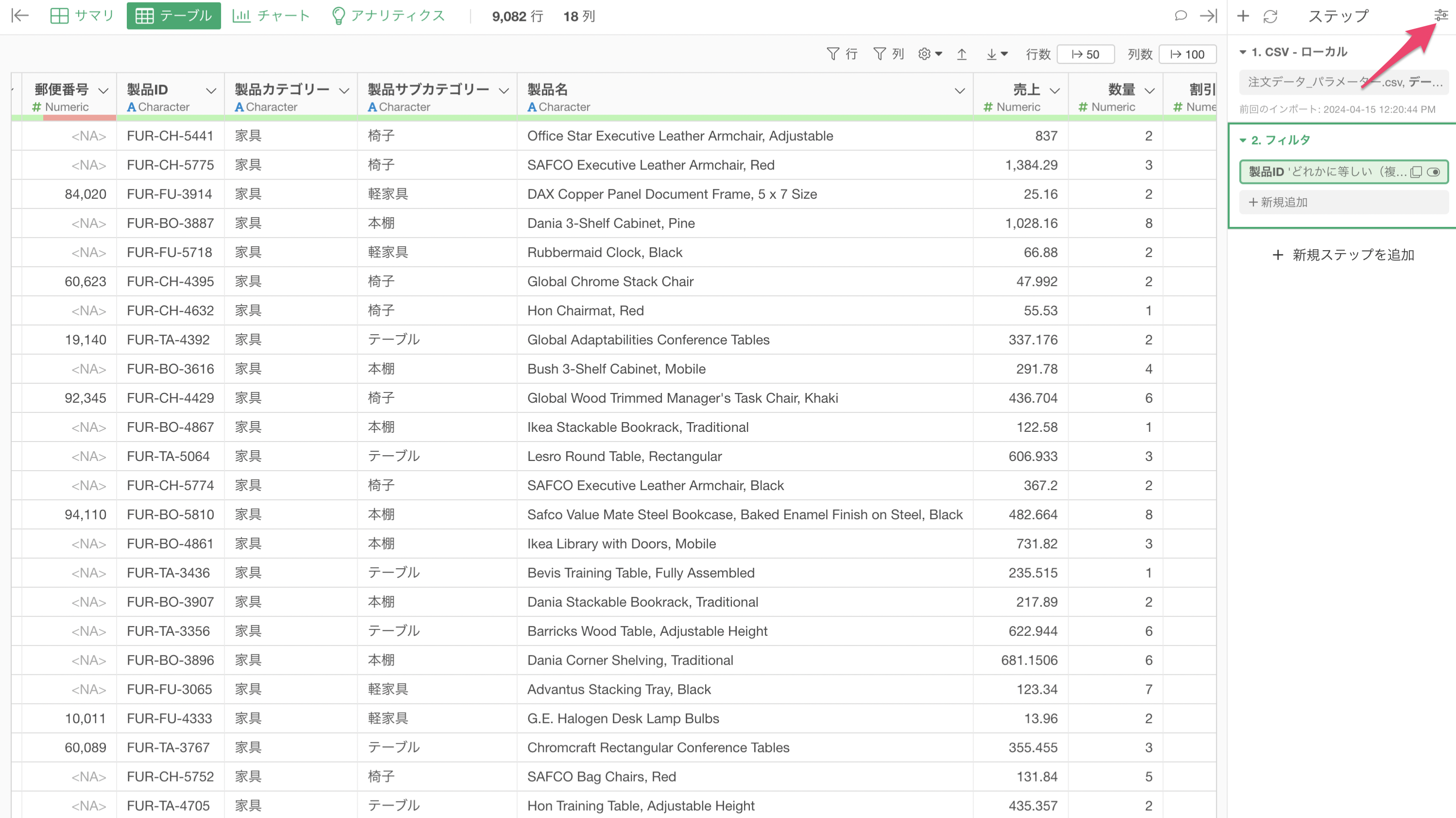 パラメーターの値は、フィルタの対象列である「注文データ」の「製品ID」の列を対象として作成されていることがわかります。