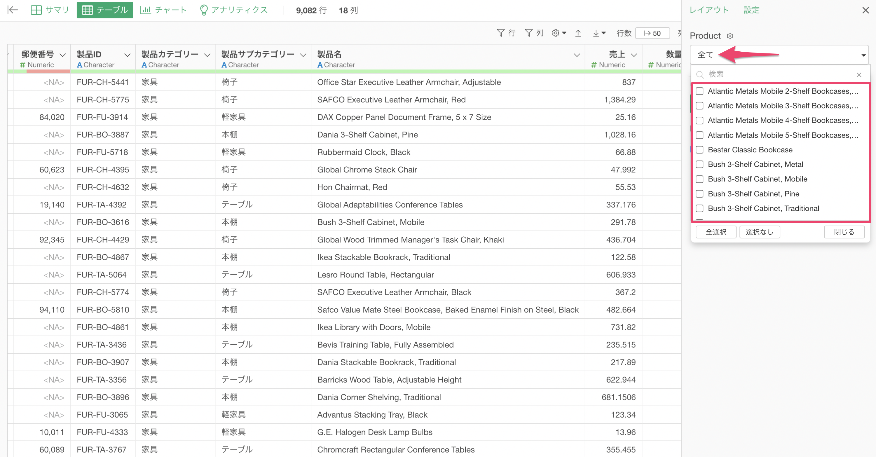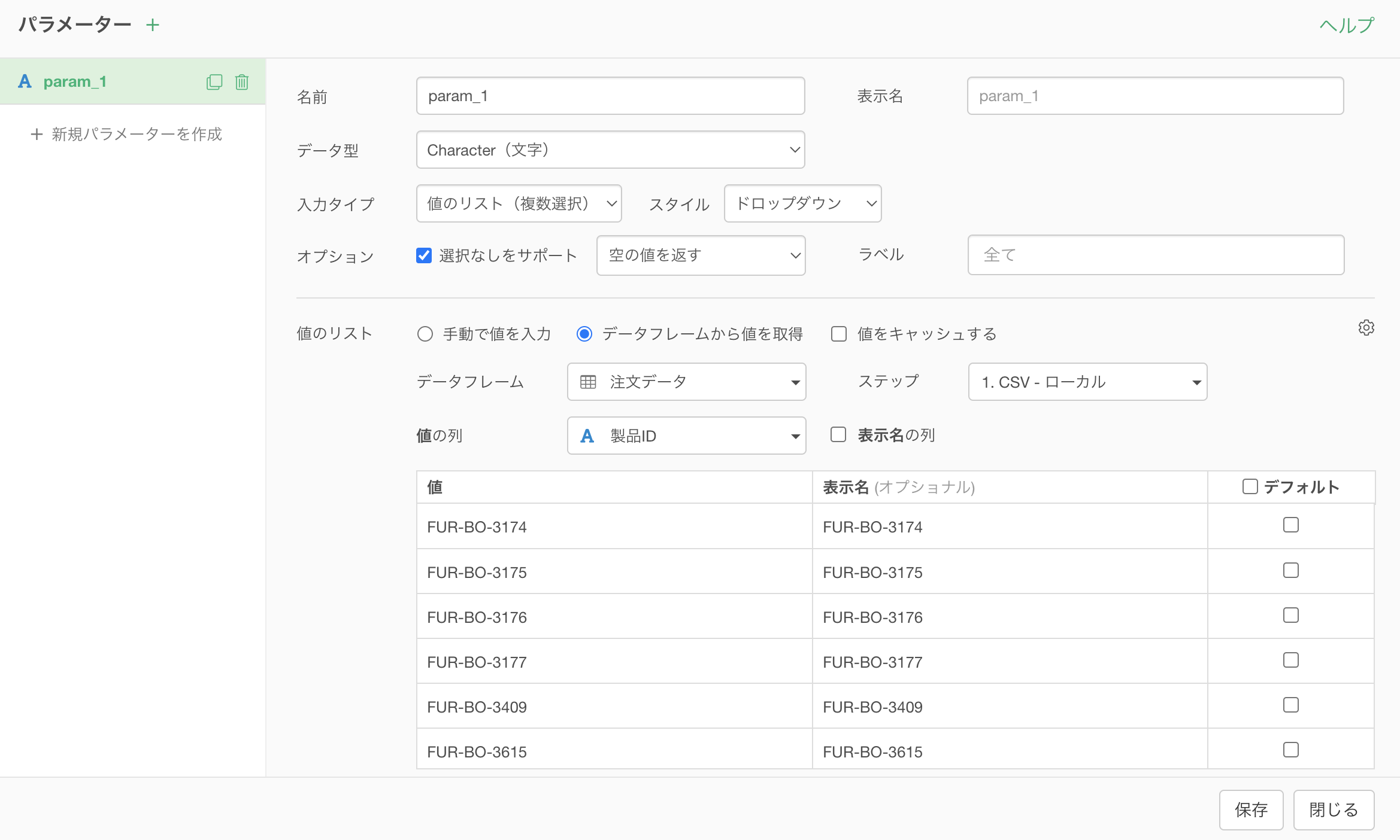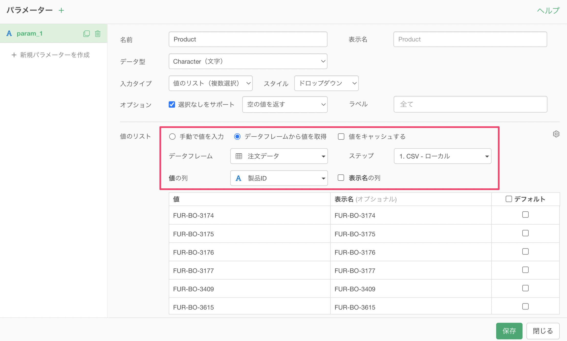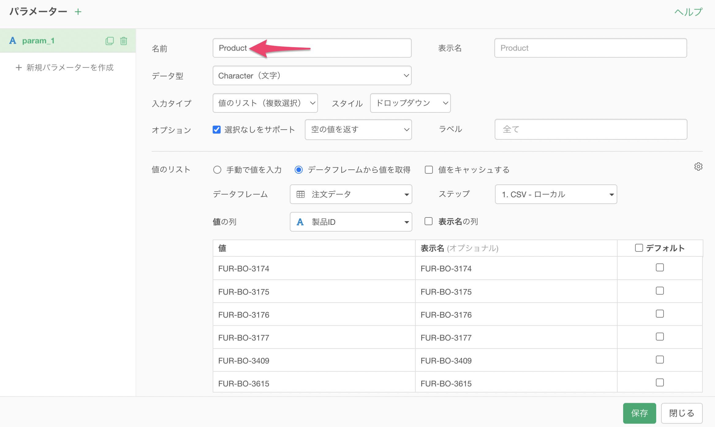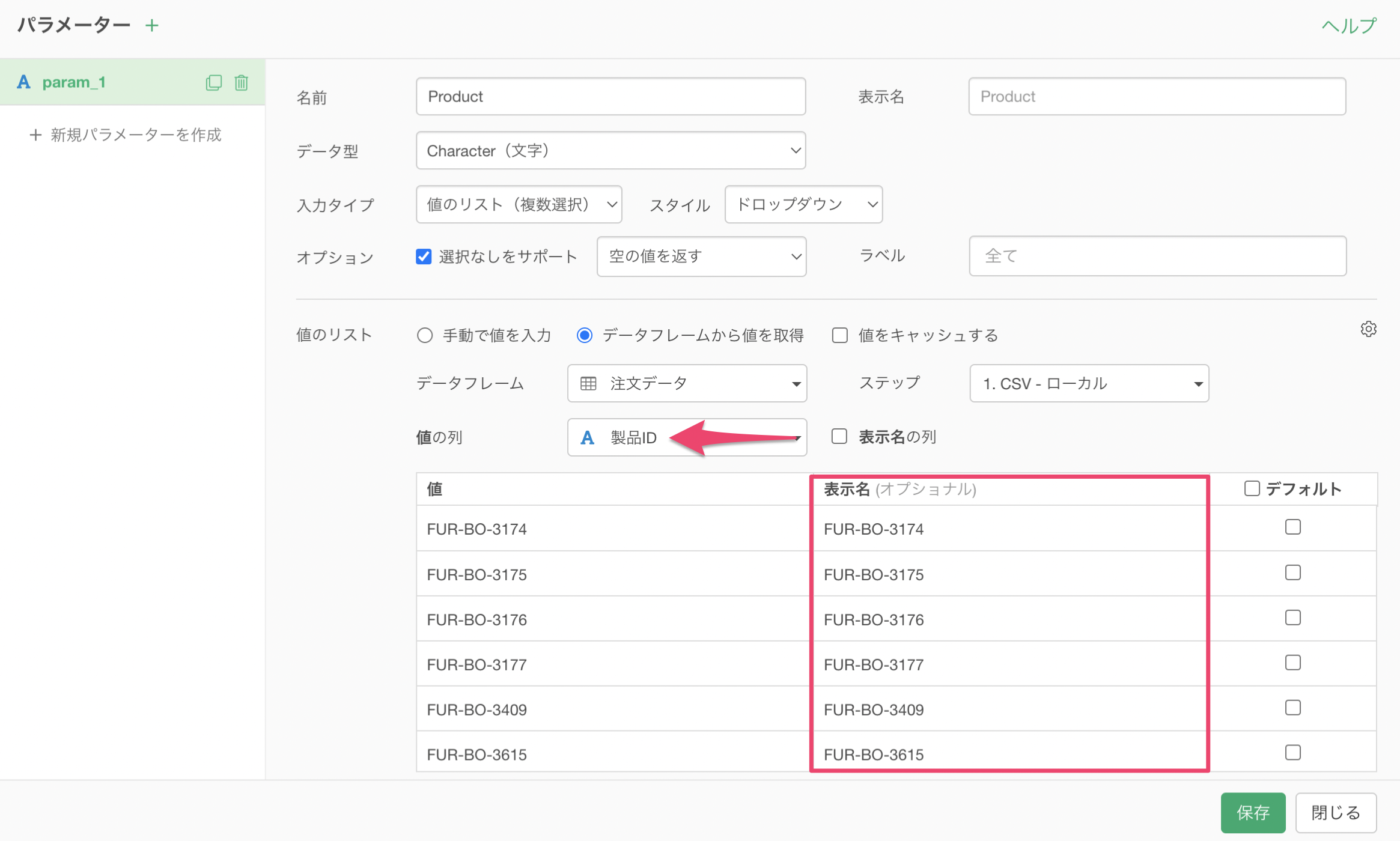 値の列には「製品ID」が使用されているため、パラメーターの値の表示名も「FUR-BO-3174」のように製品IDがそのまま表示されます。
