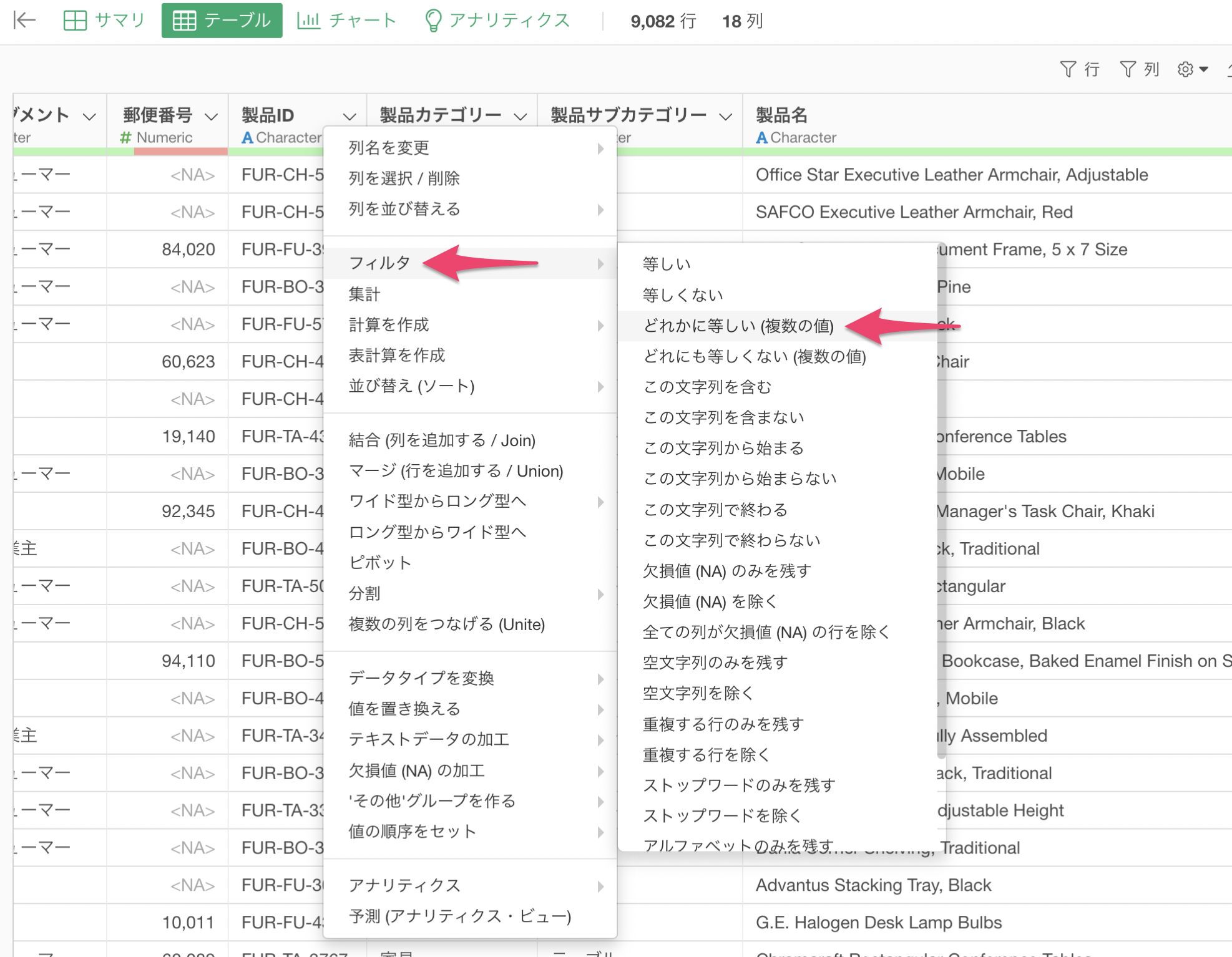 製品IDの列から「フィルタ」の「どれかに等しい(複数の値)」を選択します。