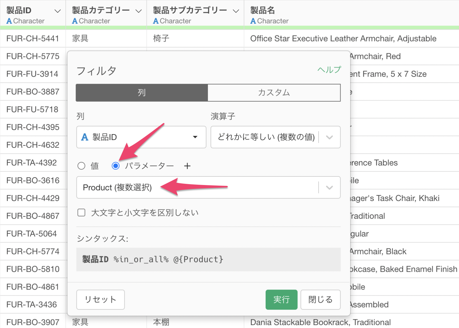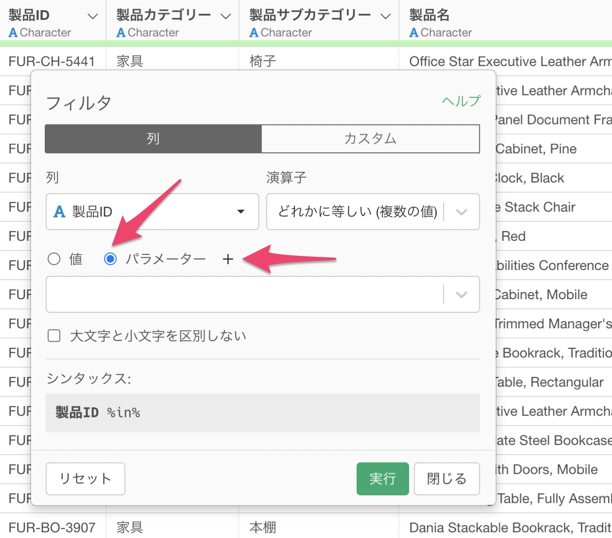 先ほどの製品IDに対するフィルタのダイアログにて、先ほど作成をしたパラメーターを指定して実行します。