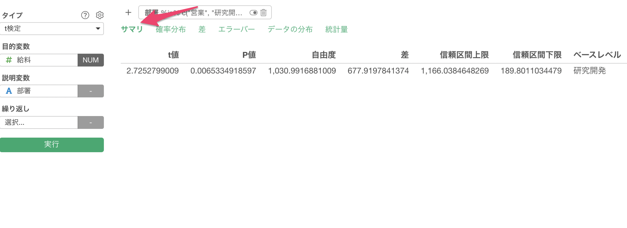 「サマリ」タブでは、検定の結果が有意かどうかを確認できます。2つのグループ間に差がないことを前提とした時に、この結果が得られる確率を表すP値から有意かどうか判断ができ、一般的には0.05(5%)を下回ると有意であると言われています。