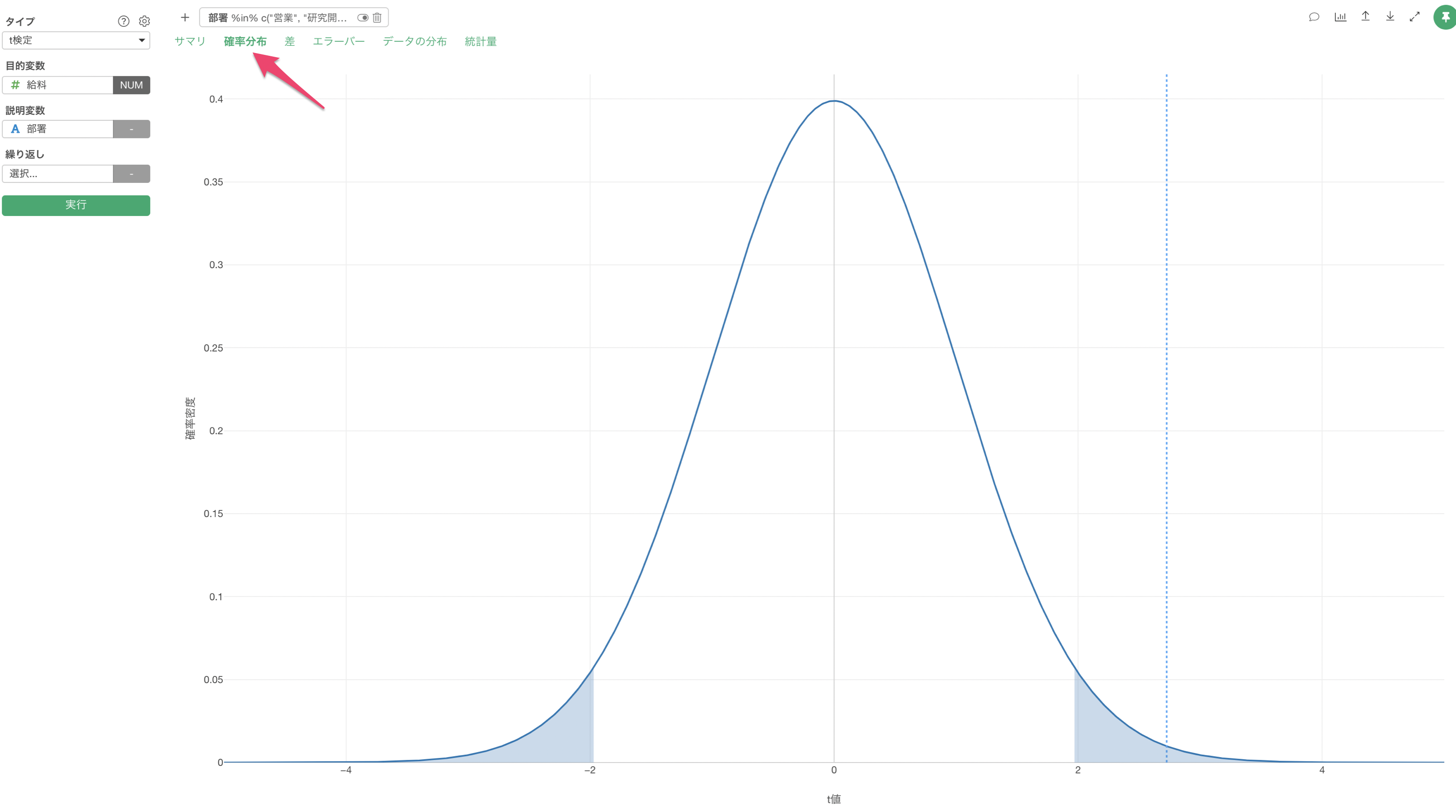 「確率分布」タブでは、使用したデータの自由度を元に、t検定で使用する確率分布である「t分布」を描き、今回の結果である「t値」がt分布の中でどの位置にあるのかを点線として表示されます。