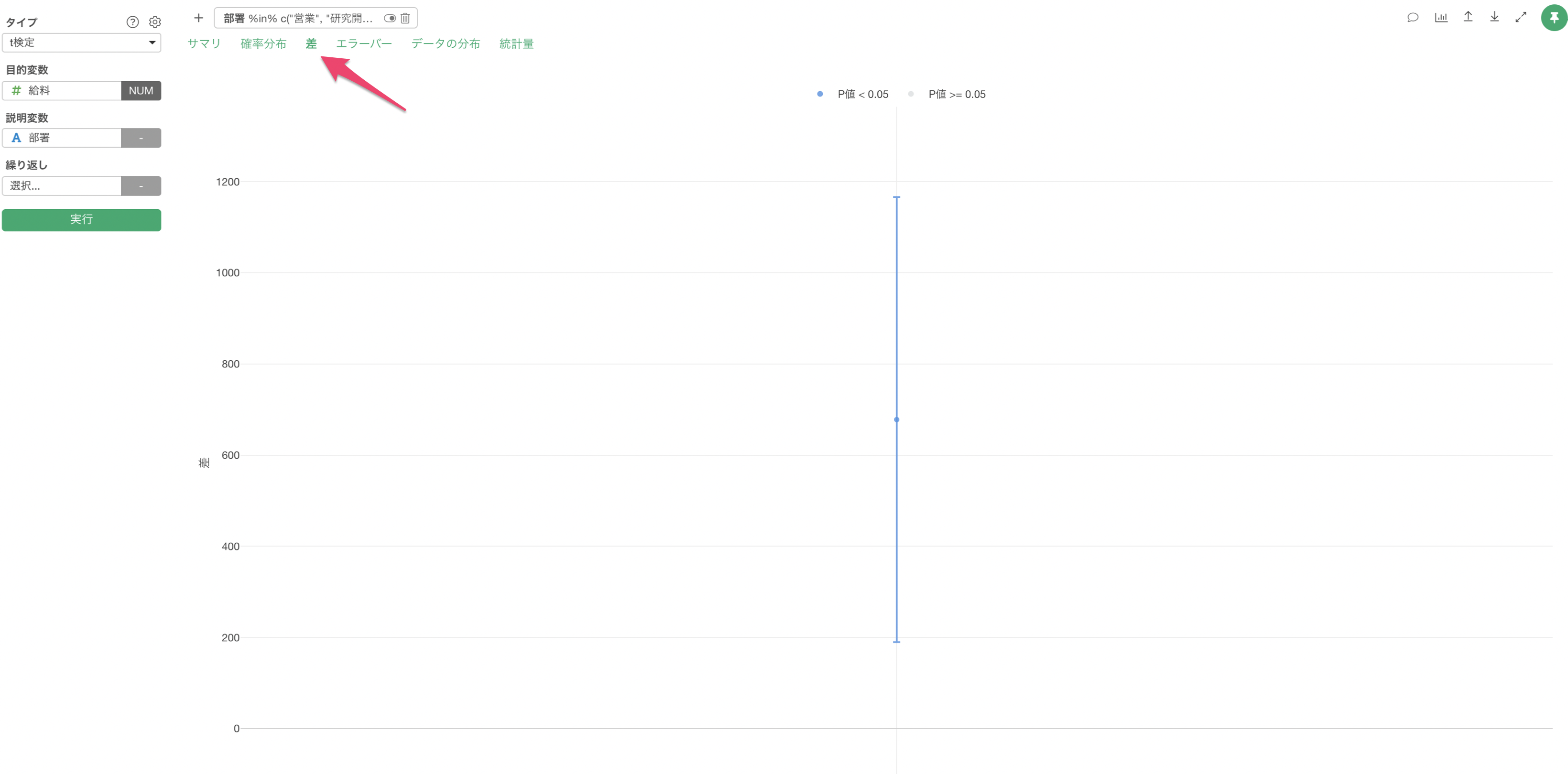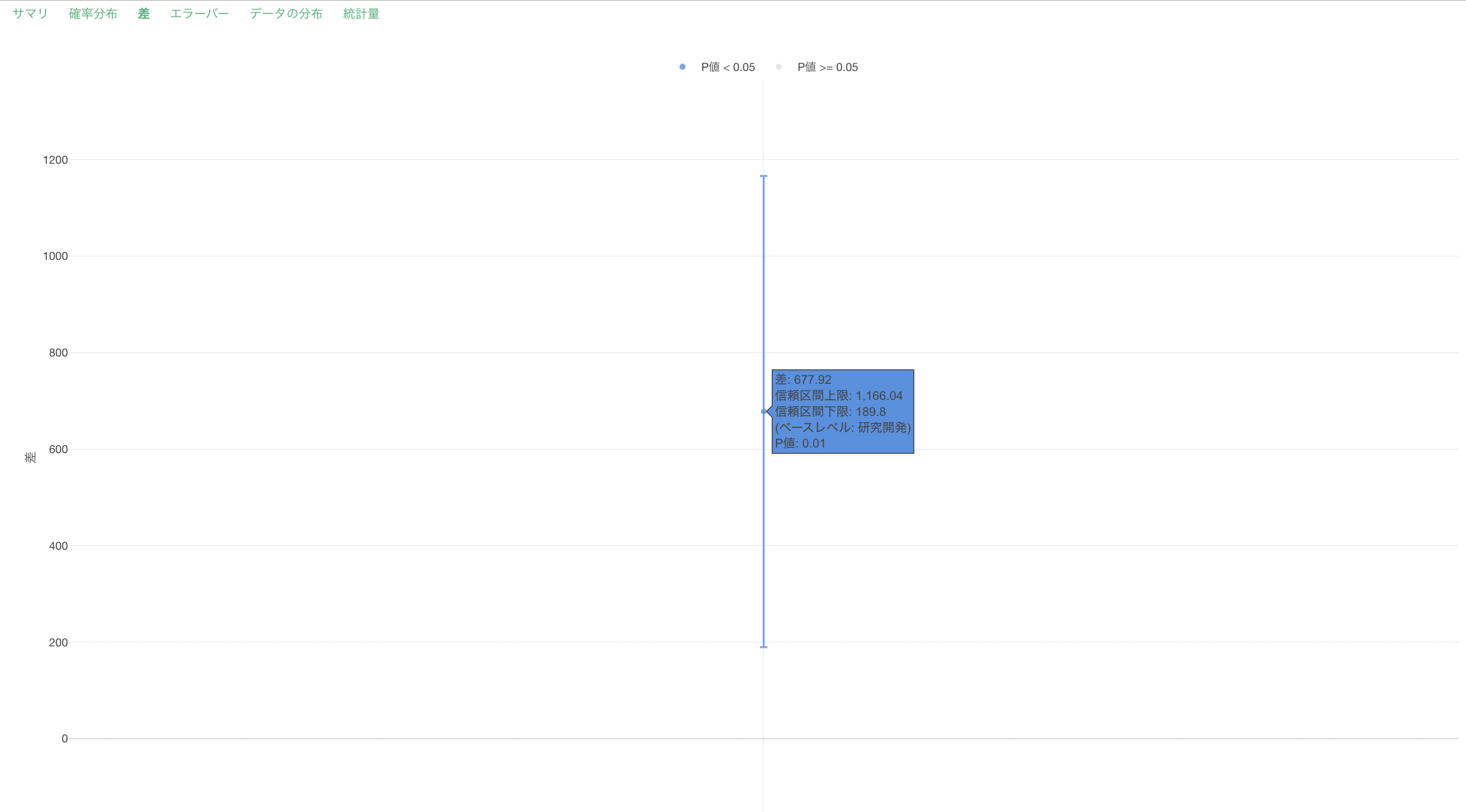 「差」のタブでは、グループ間の平均値の差とその信頼区間がエラーバーとして可視化されます。