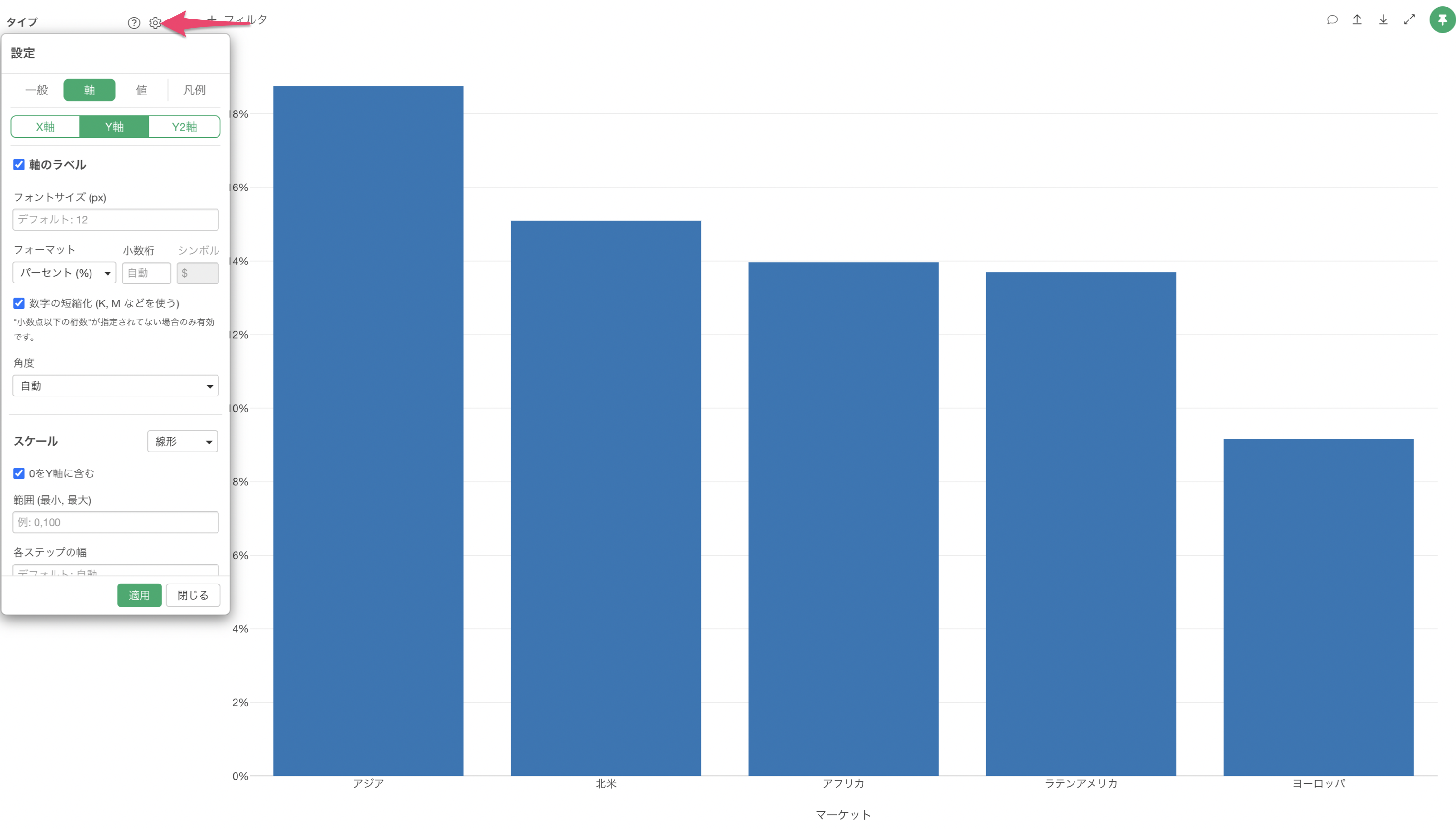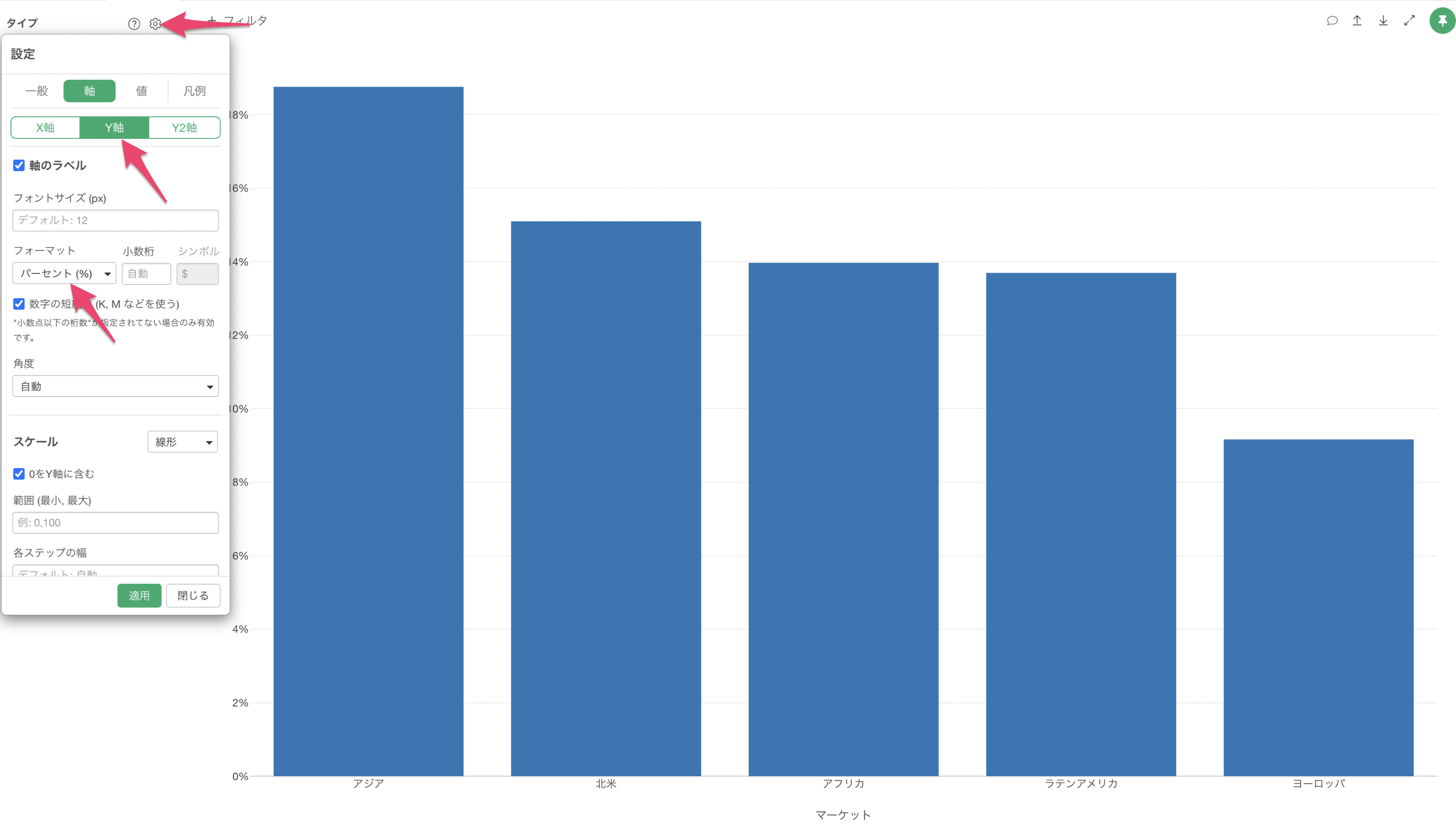 Exploratoryでチャートの「小数点以下の桁数」やY軸での「通貨記号」や「割合」などの数値のフォーマットに関する設定方法を紹介いたします。