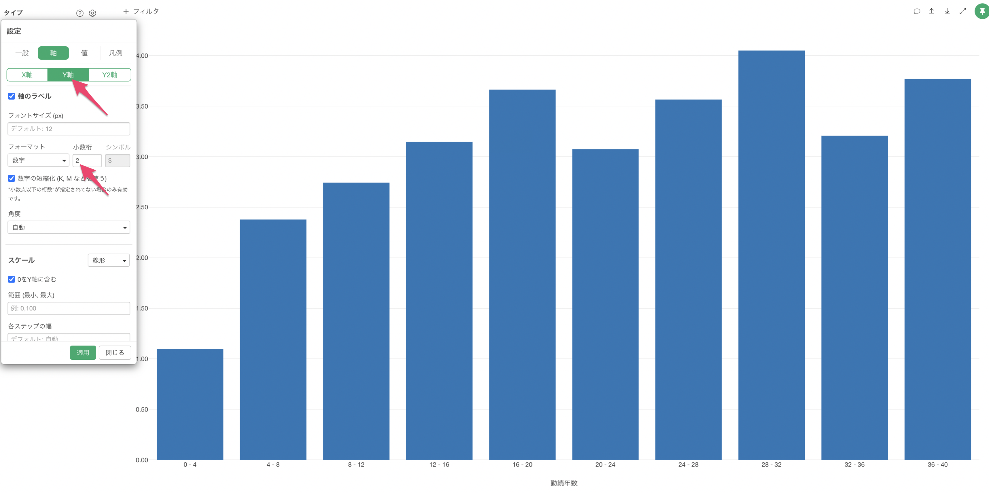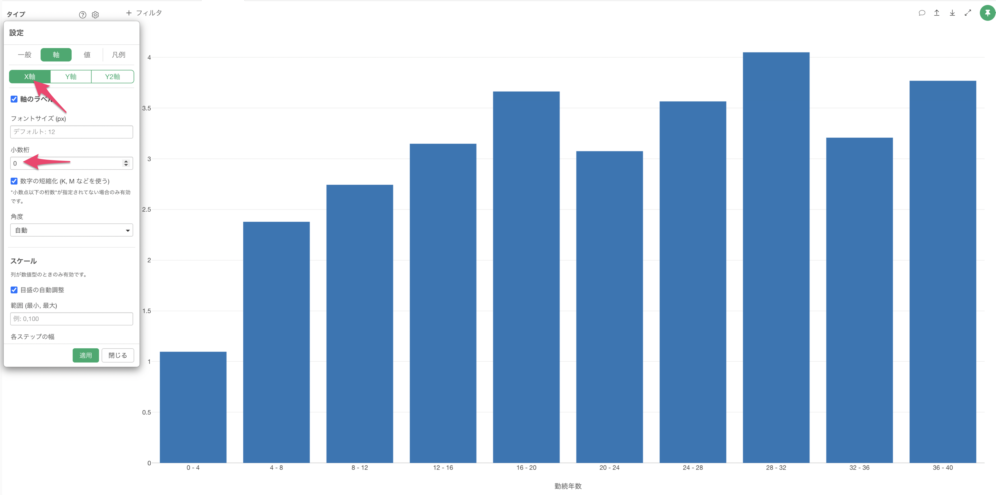 これにより、X軸の「勤続年数」のみで小数点以下の桁数が設定されていることがわかります。
