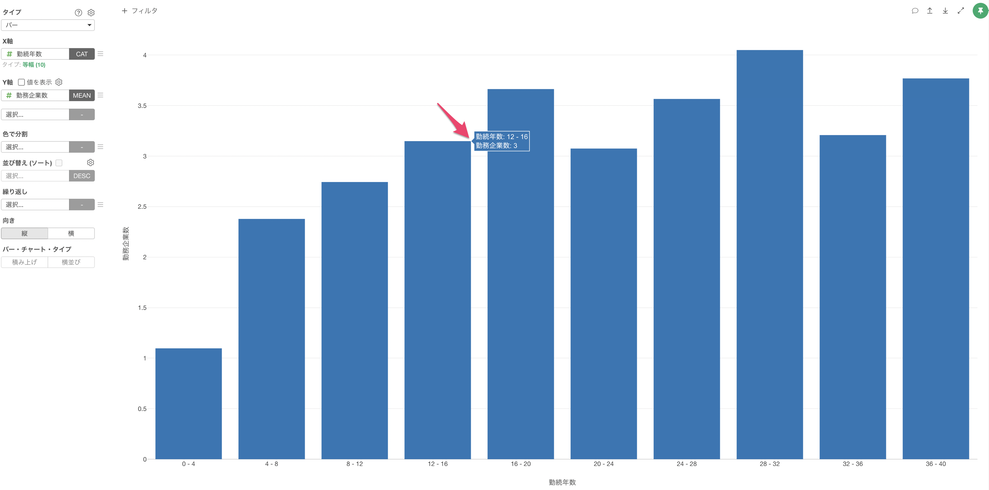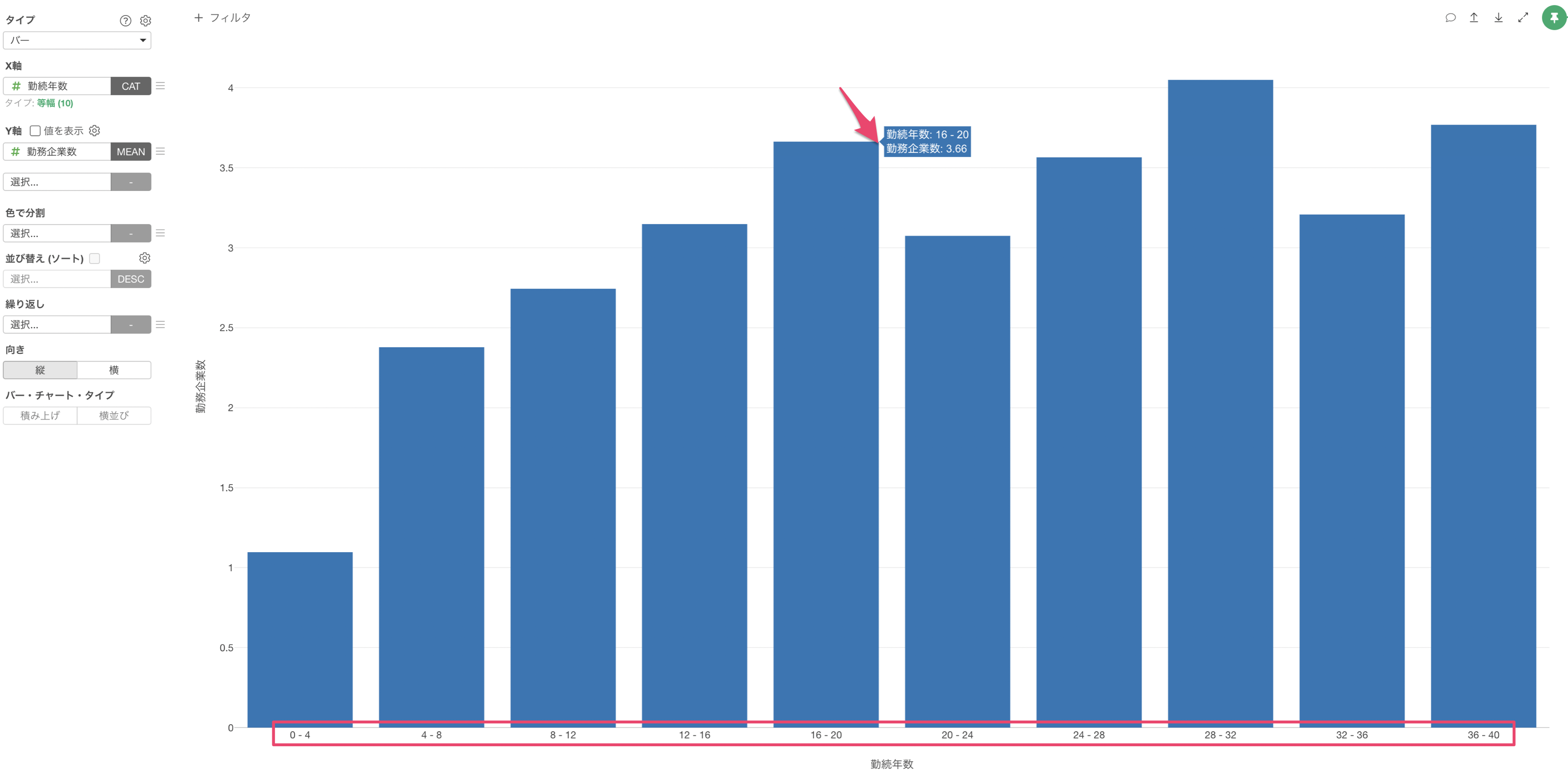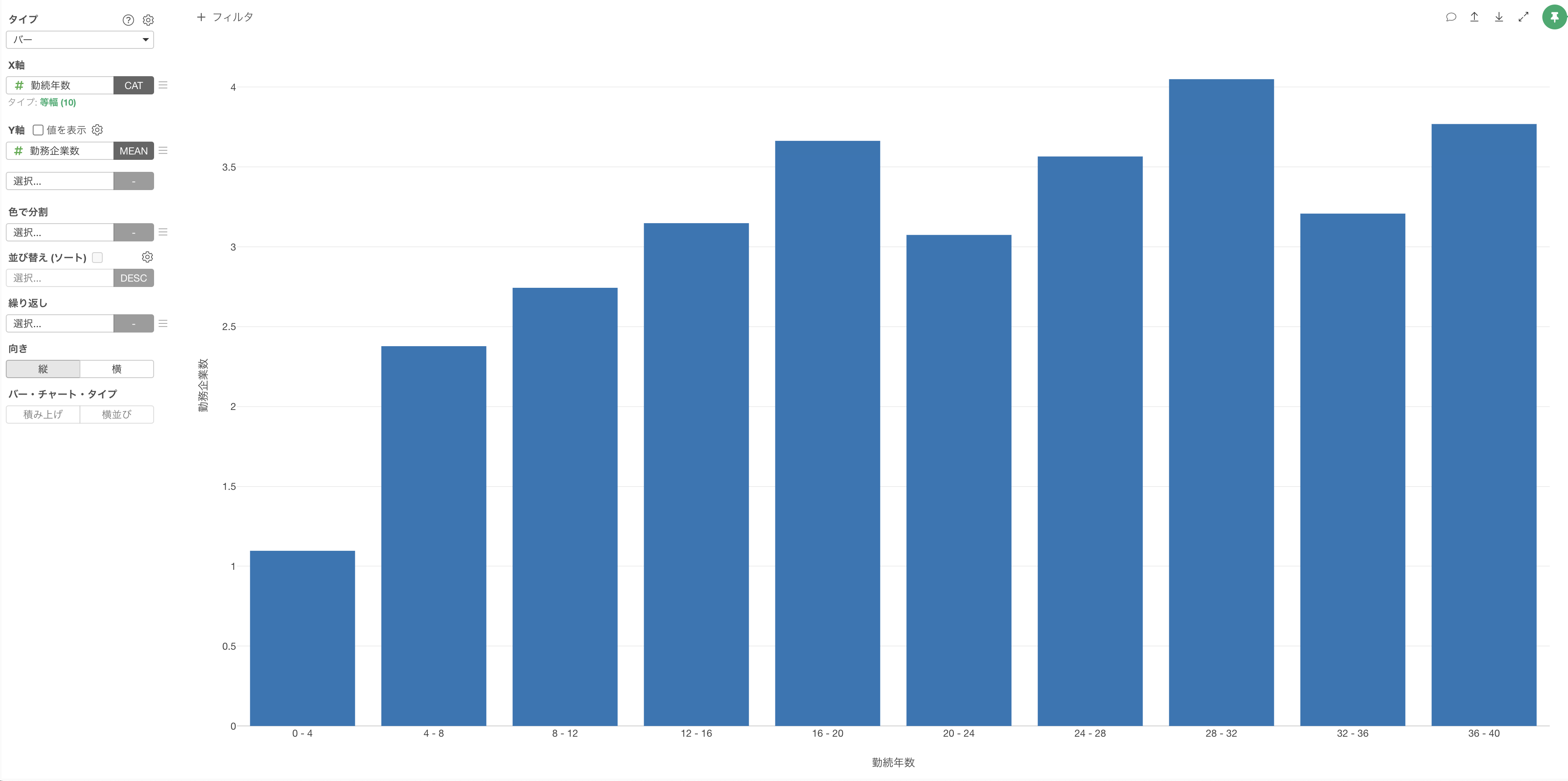 例えば、「勤続年数」ごとに「勤務企業数」の平均値を可視化したバーチャートがあったとします。