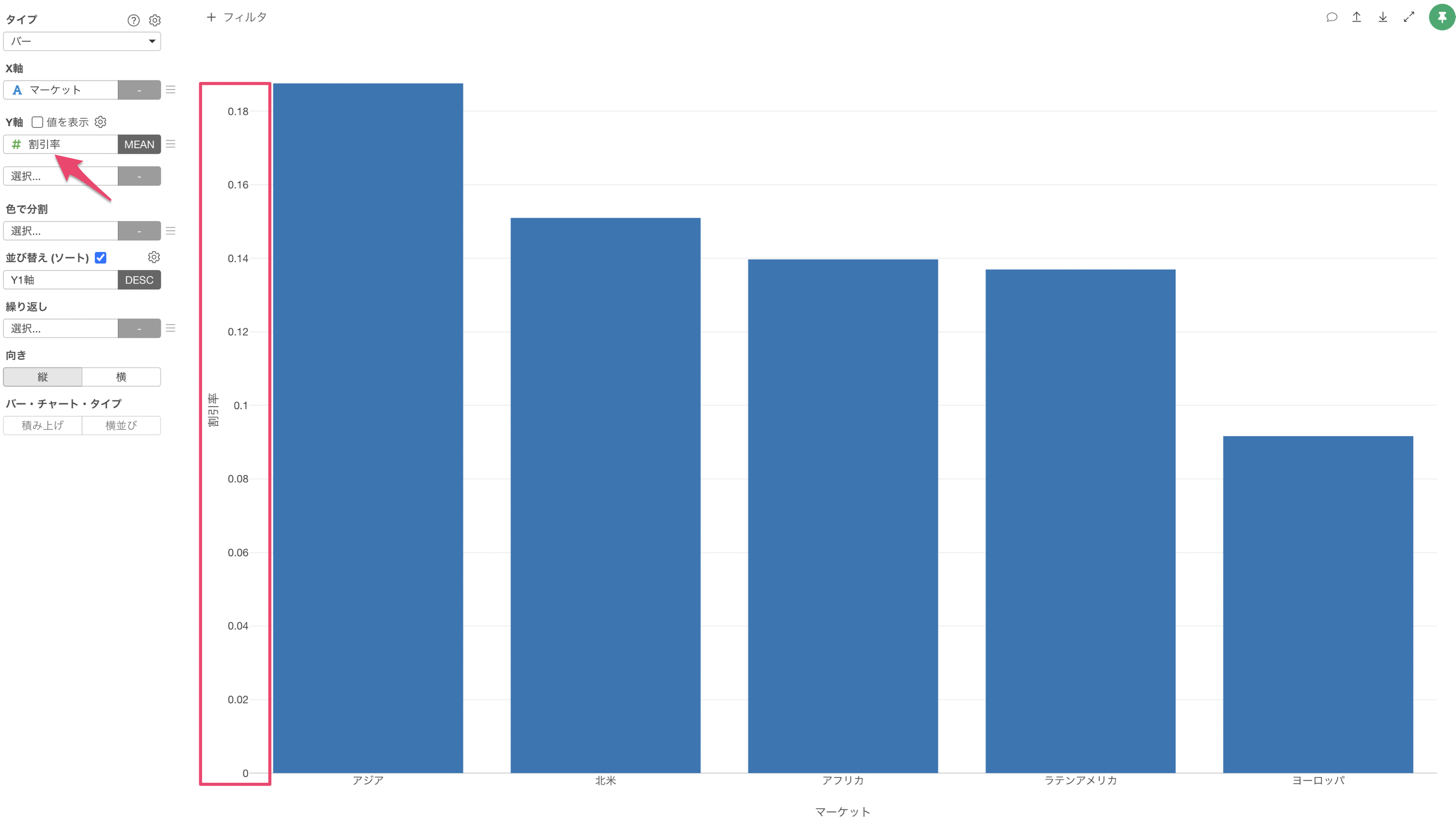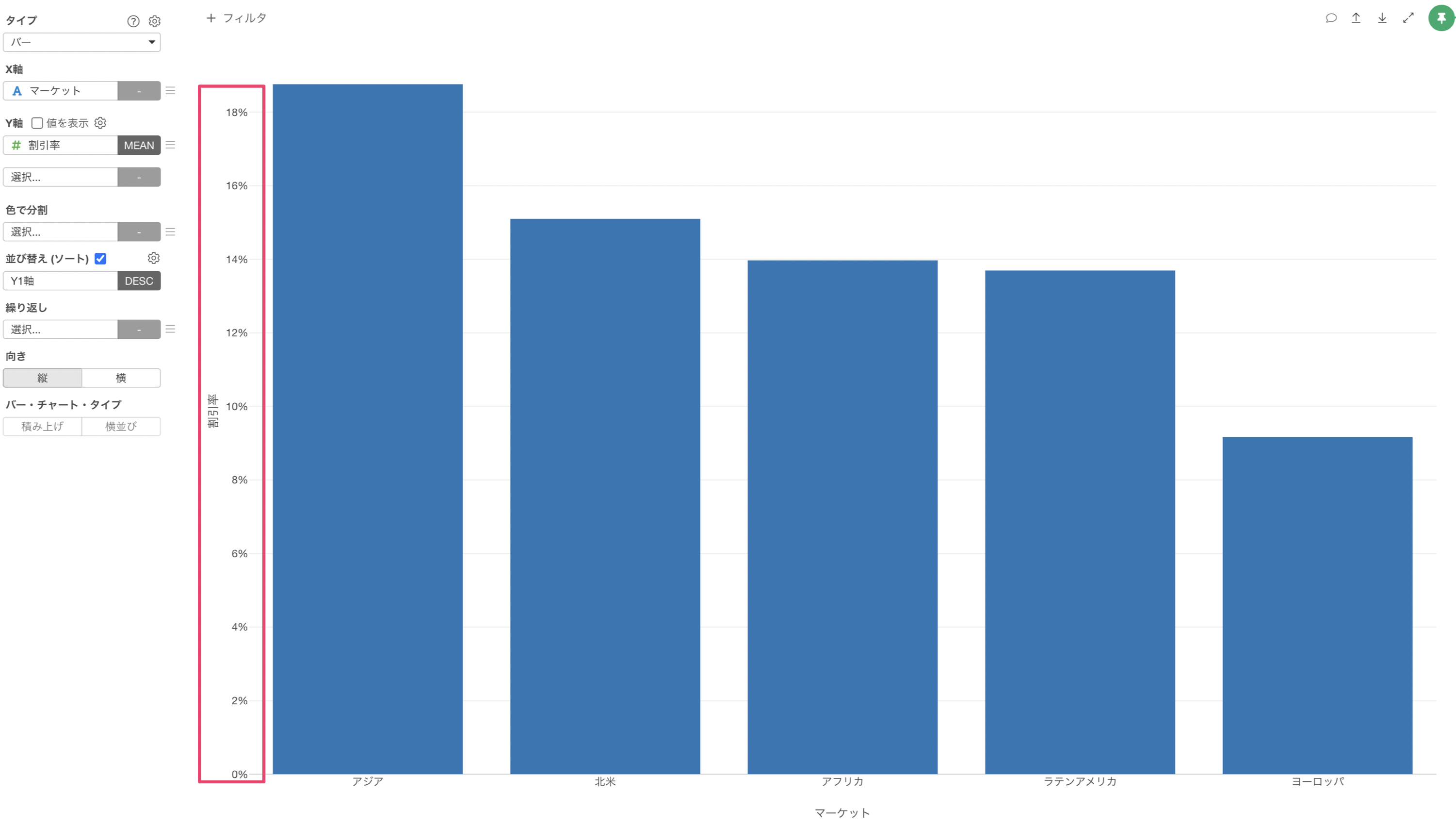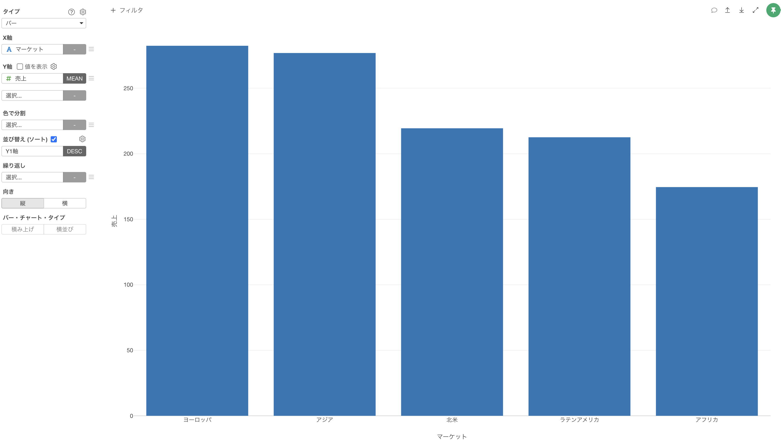 例えば、「マーケット」ごとに「売上」の平均値を可視化したバーチャートがあったとします。