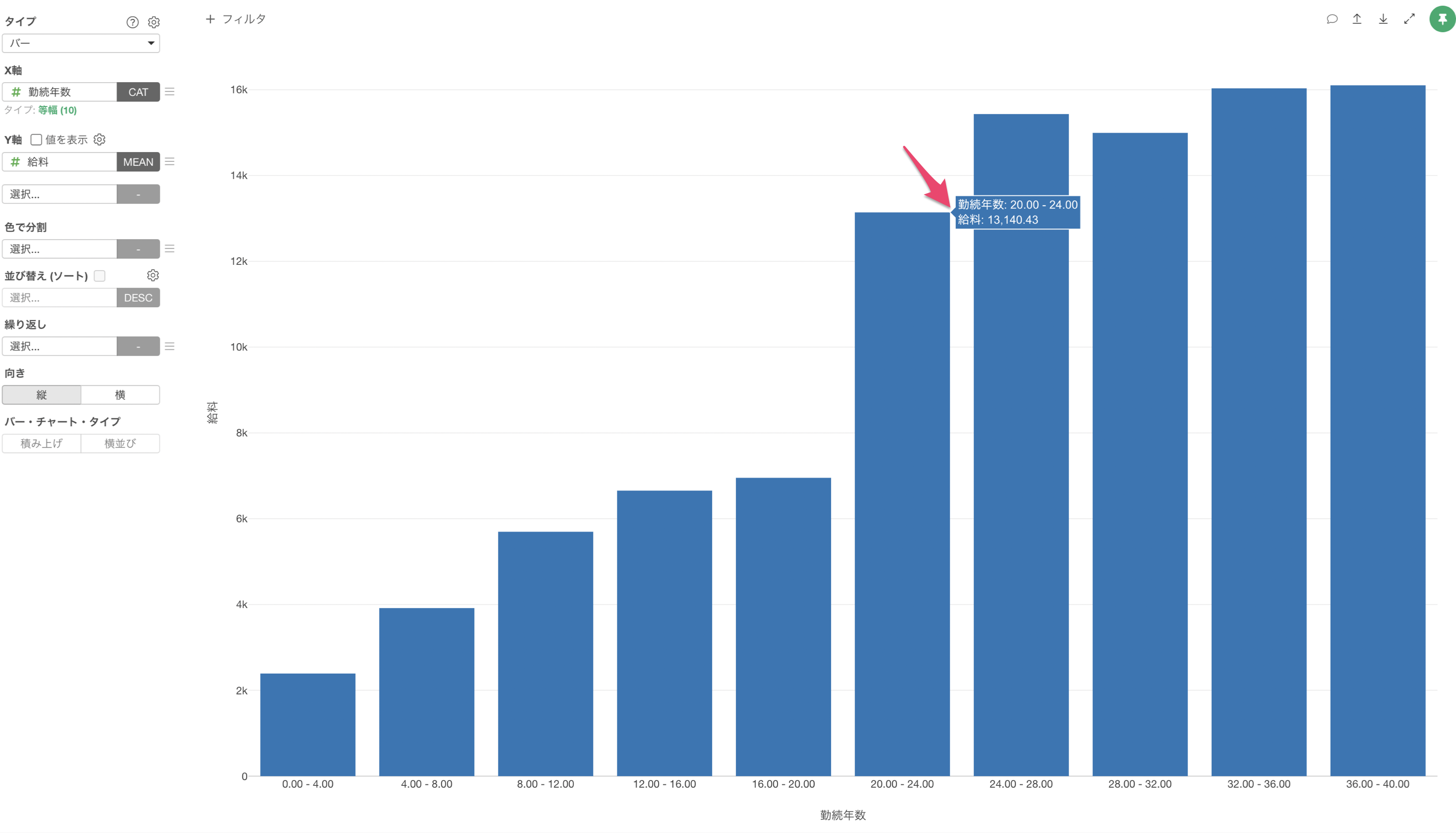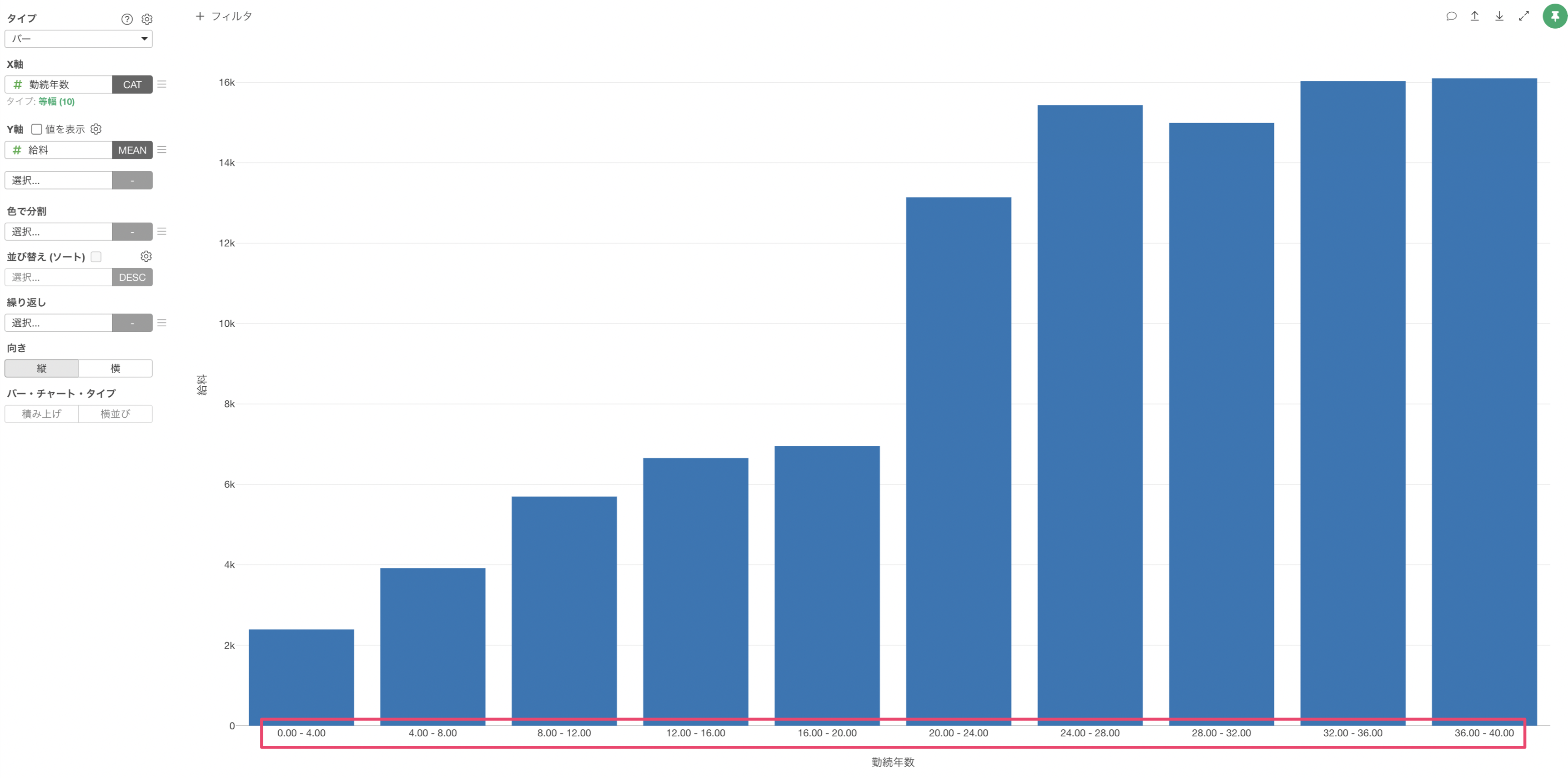 例えば、「勤続年数」ごとに「給料」の平均値を可視化したバーチャートがあったとします。