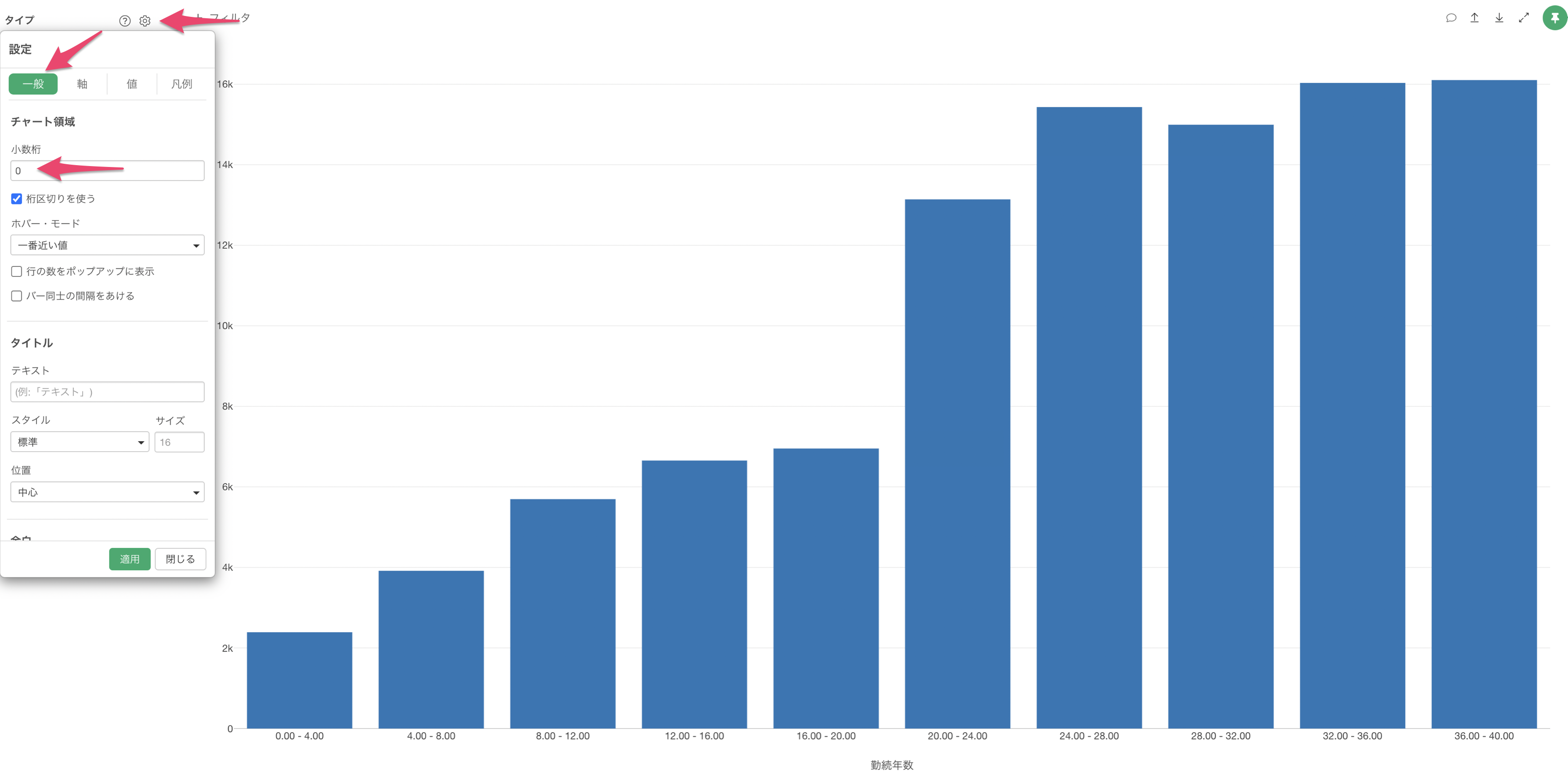 先ほど紹介した「一般」の「チャート領域」にある「小数桁」で「0」を設定して適用をしてしまうと、X軸の勤続年数は整数値のため問題ありませんが、ポップアップで表示される勤務企業数の値が整数値で四捨五入されてしまいます。