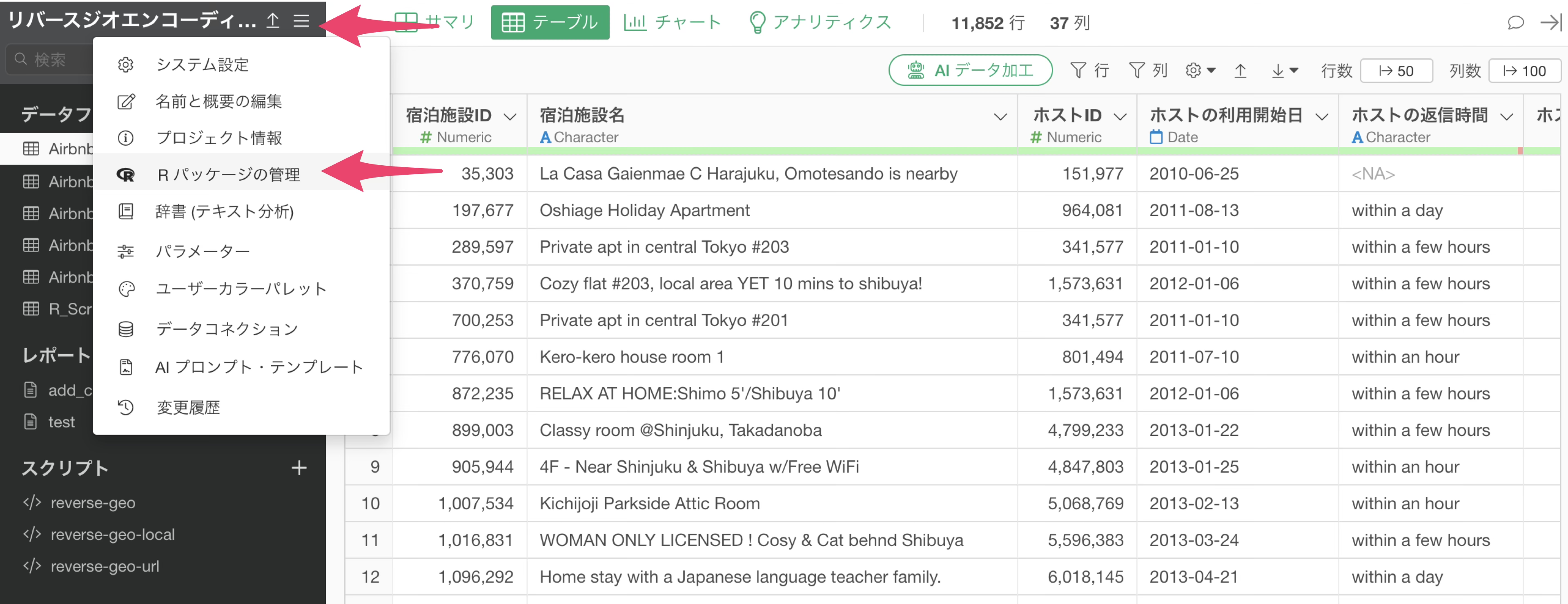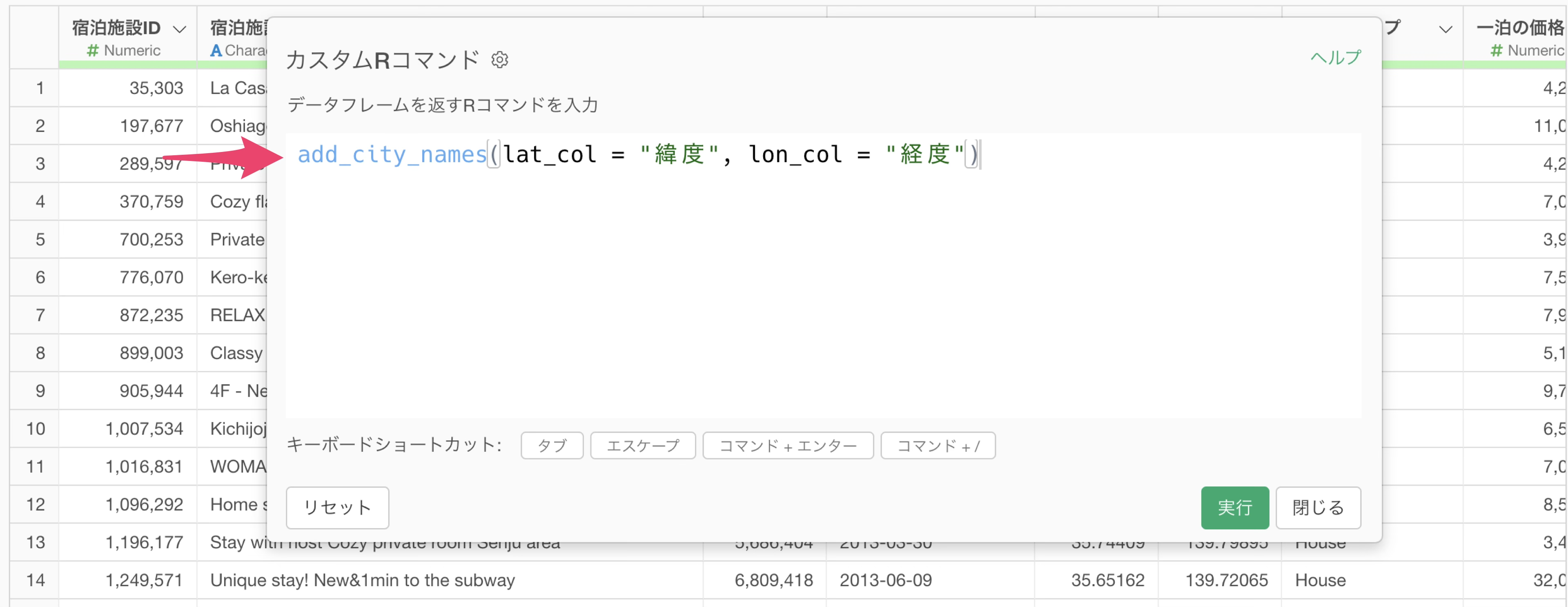 ここからは、先程作成した関数を使って、緯度・経度から都道府県・市区町村の情報を追加する手順を説明いたします。