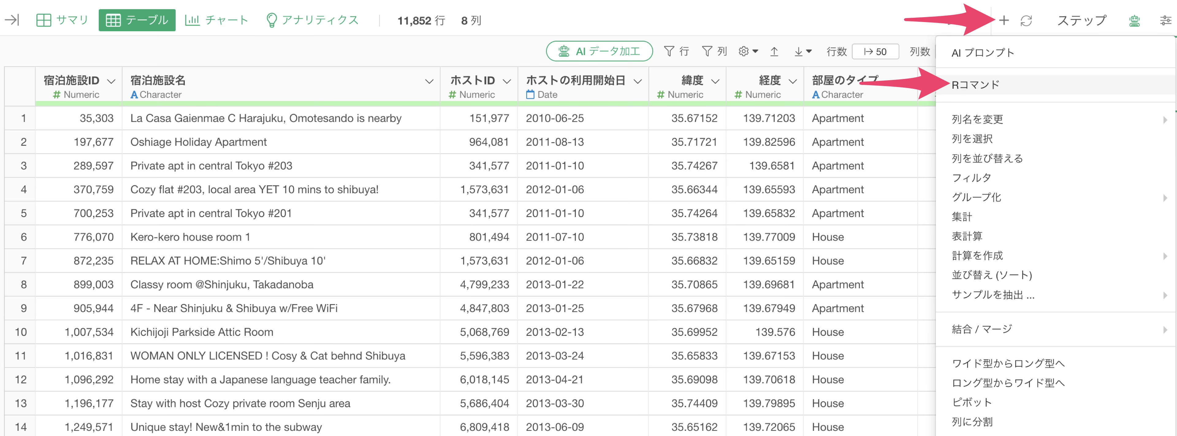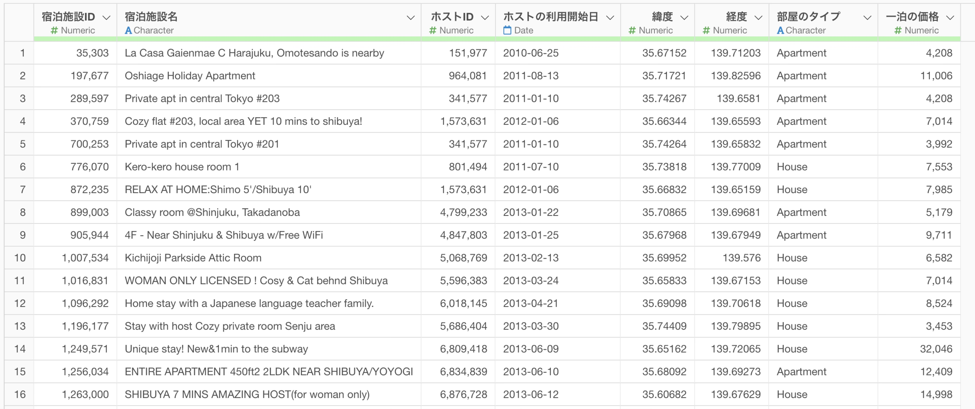 使用するデータは、1行が1つの物件(宿泊施設)を表しており、物件の緯度や経度の列が含まれています。
