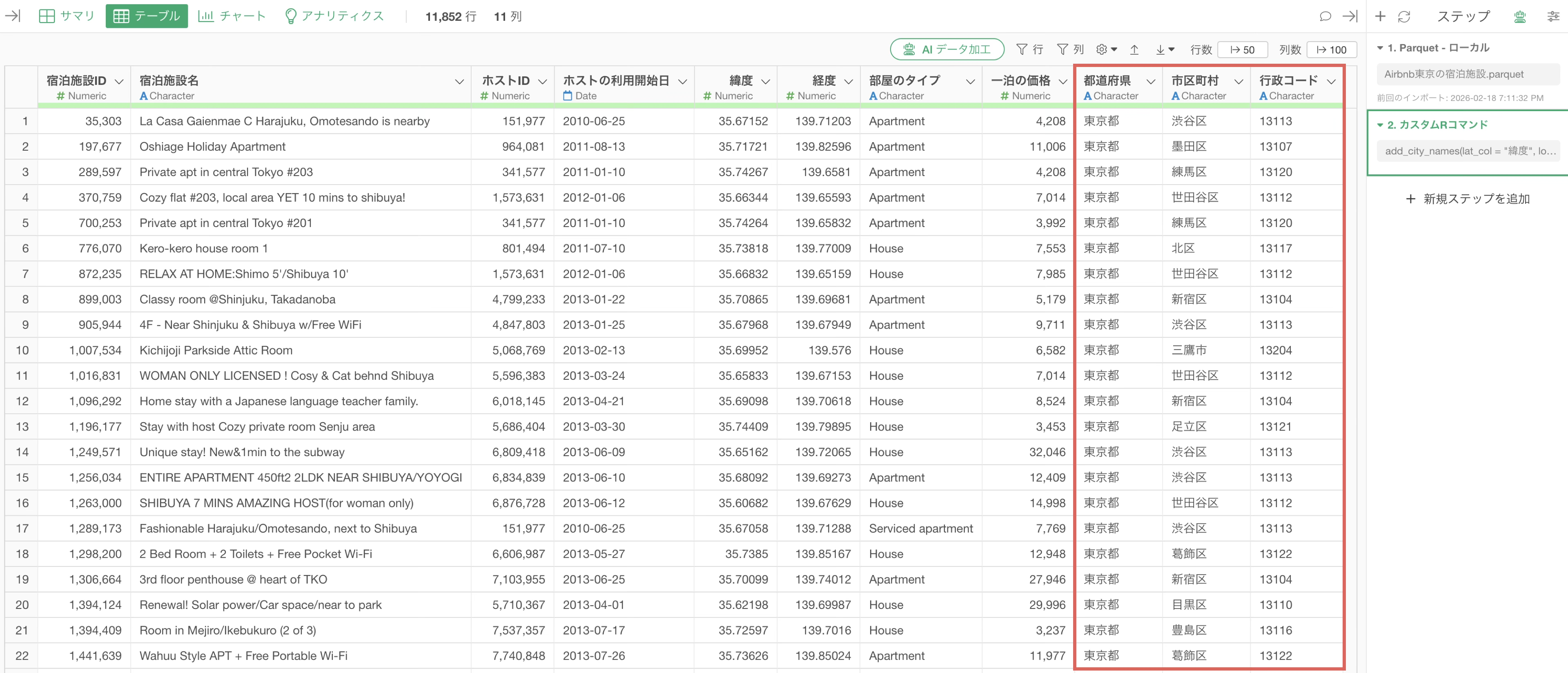 「実行」ボタンをクリックすると、ステップが追加され、データの最後に「都道府県」「市区町村」「行政コード」の3列が新しく追加されます。