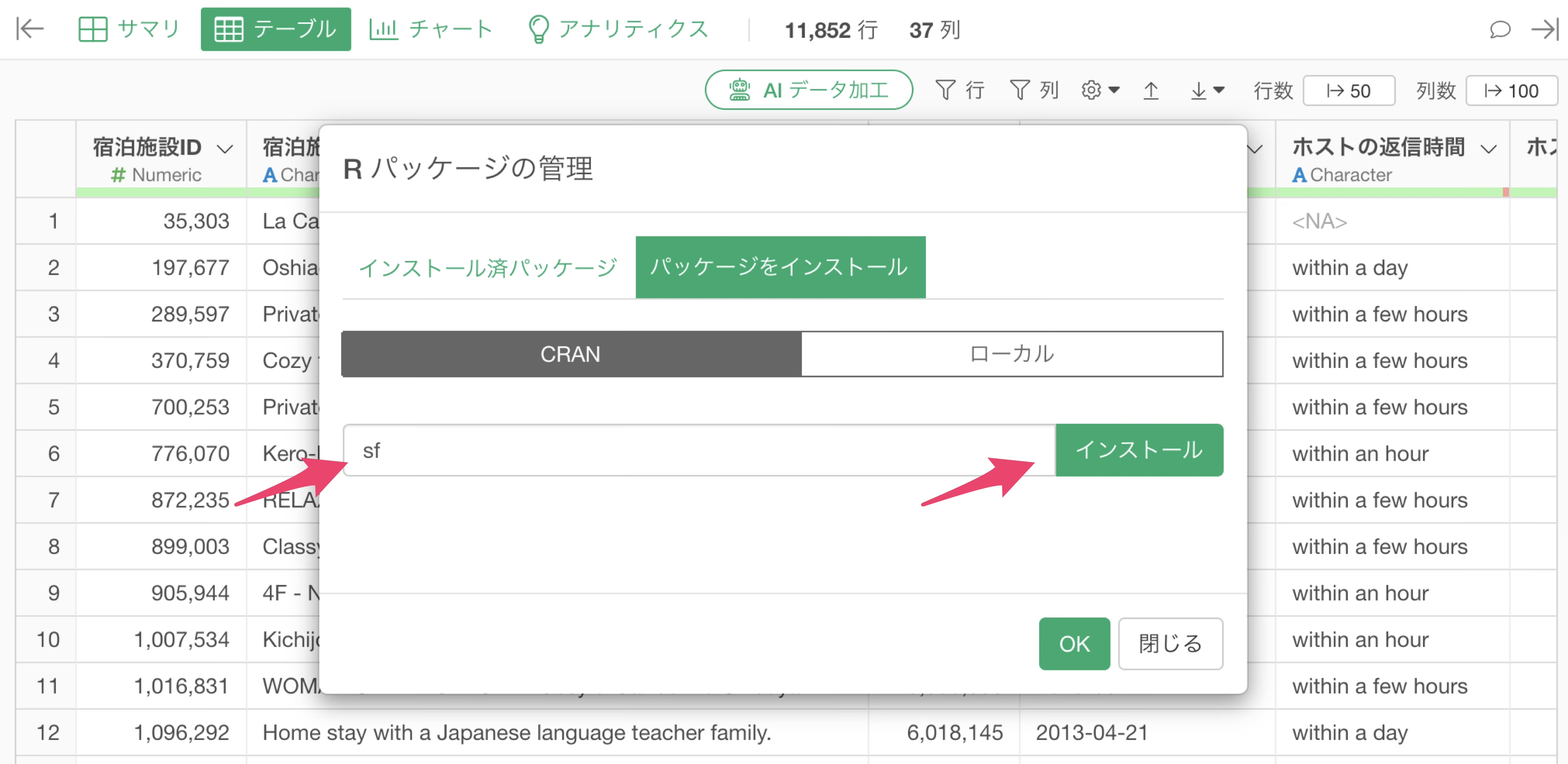 Rパッケージの管理のダイアログが表示されるため、「パッケージをインストール」タブをクリックしてから sfパッケージをインストールしてください。