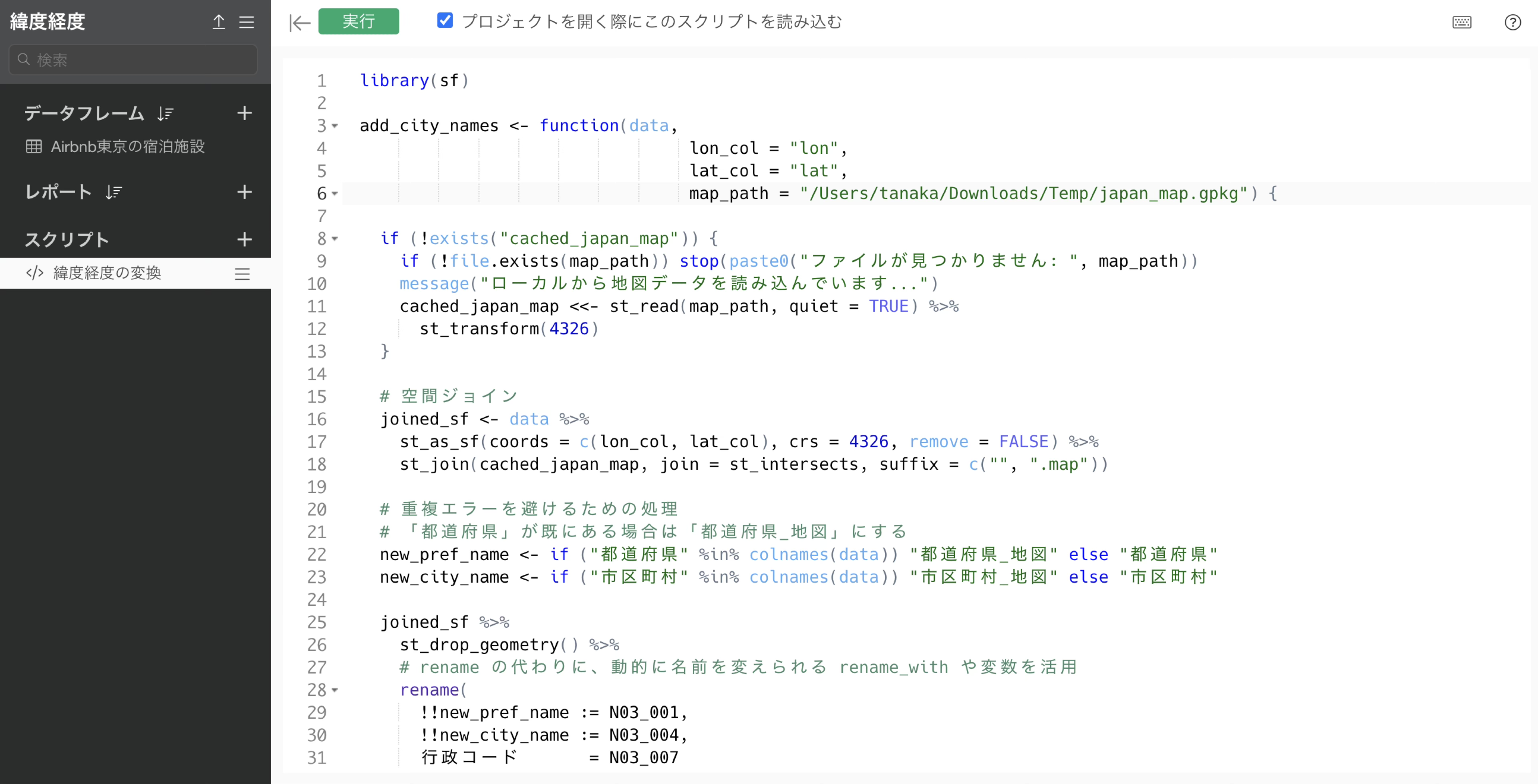 次に、市区町村情報を追加するための関数をExploratoryにRスクリプトとして登録します。