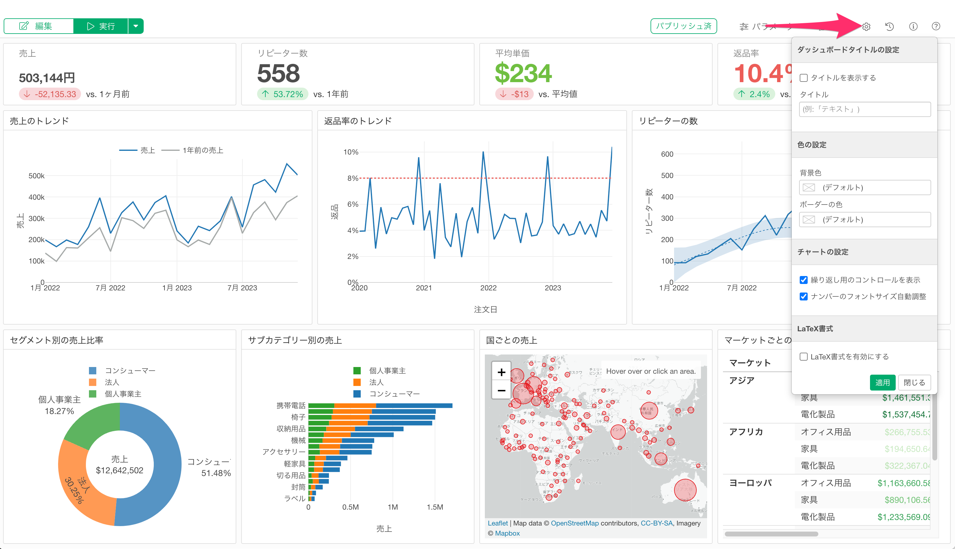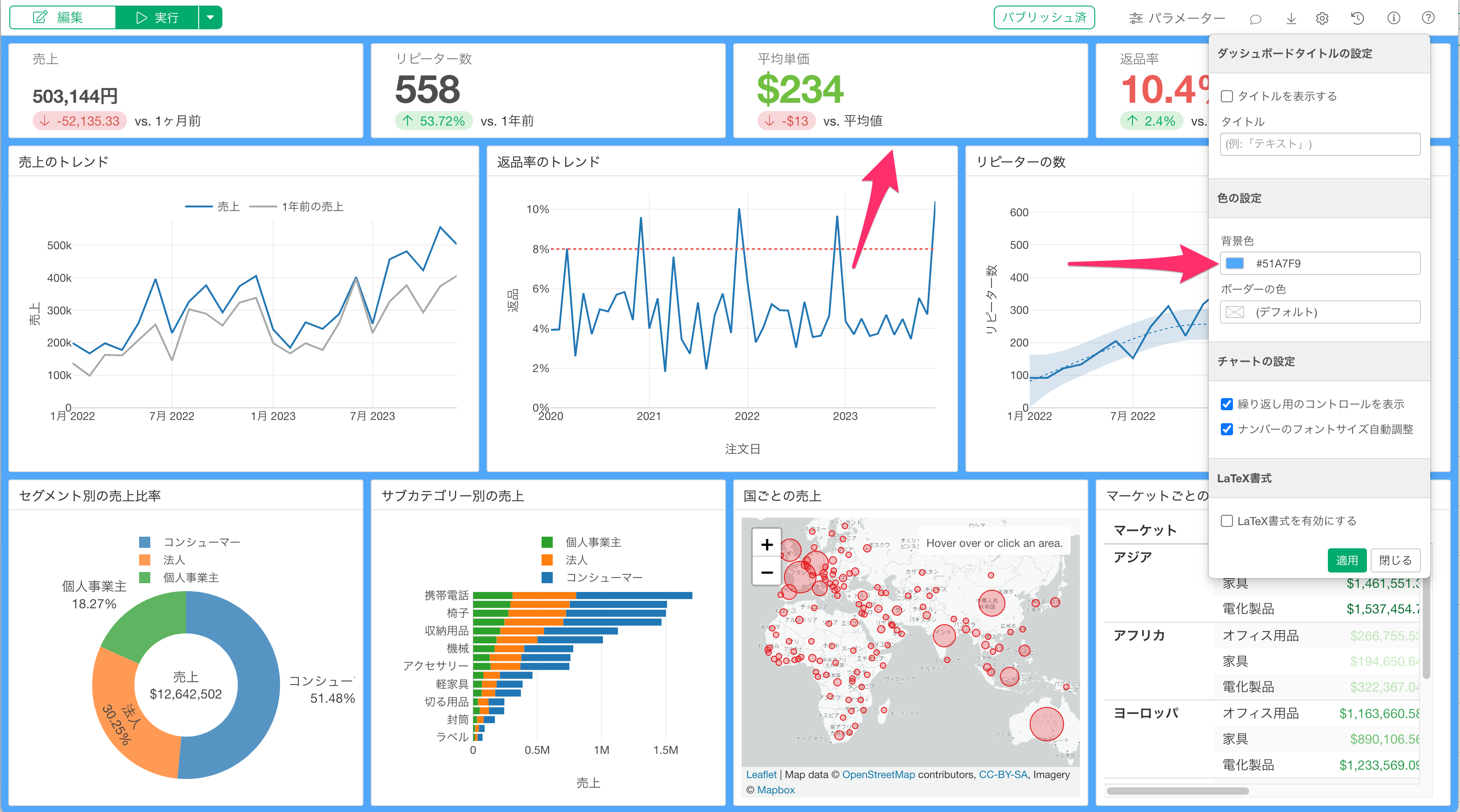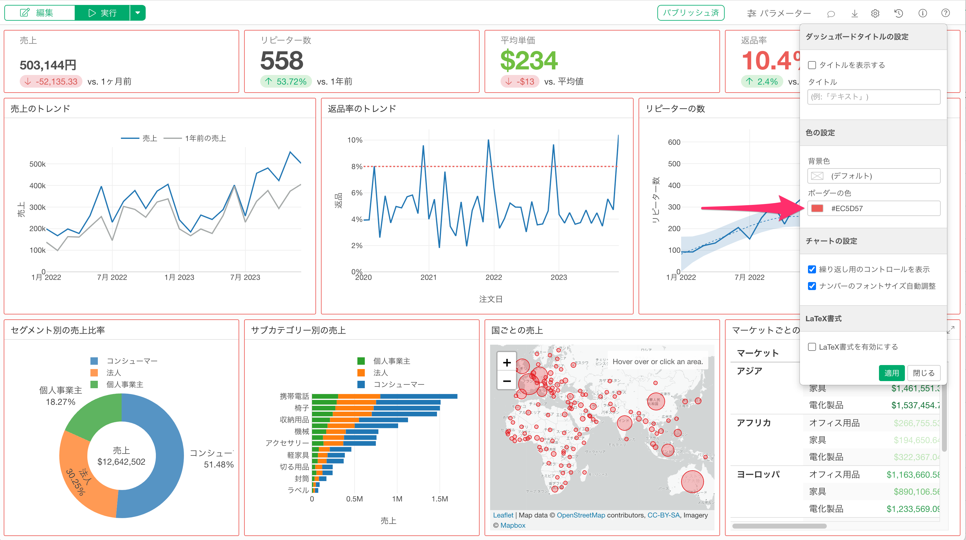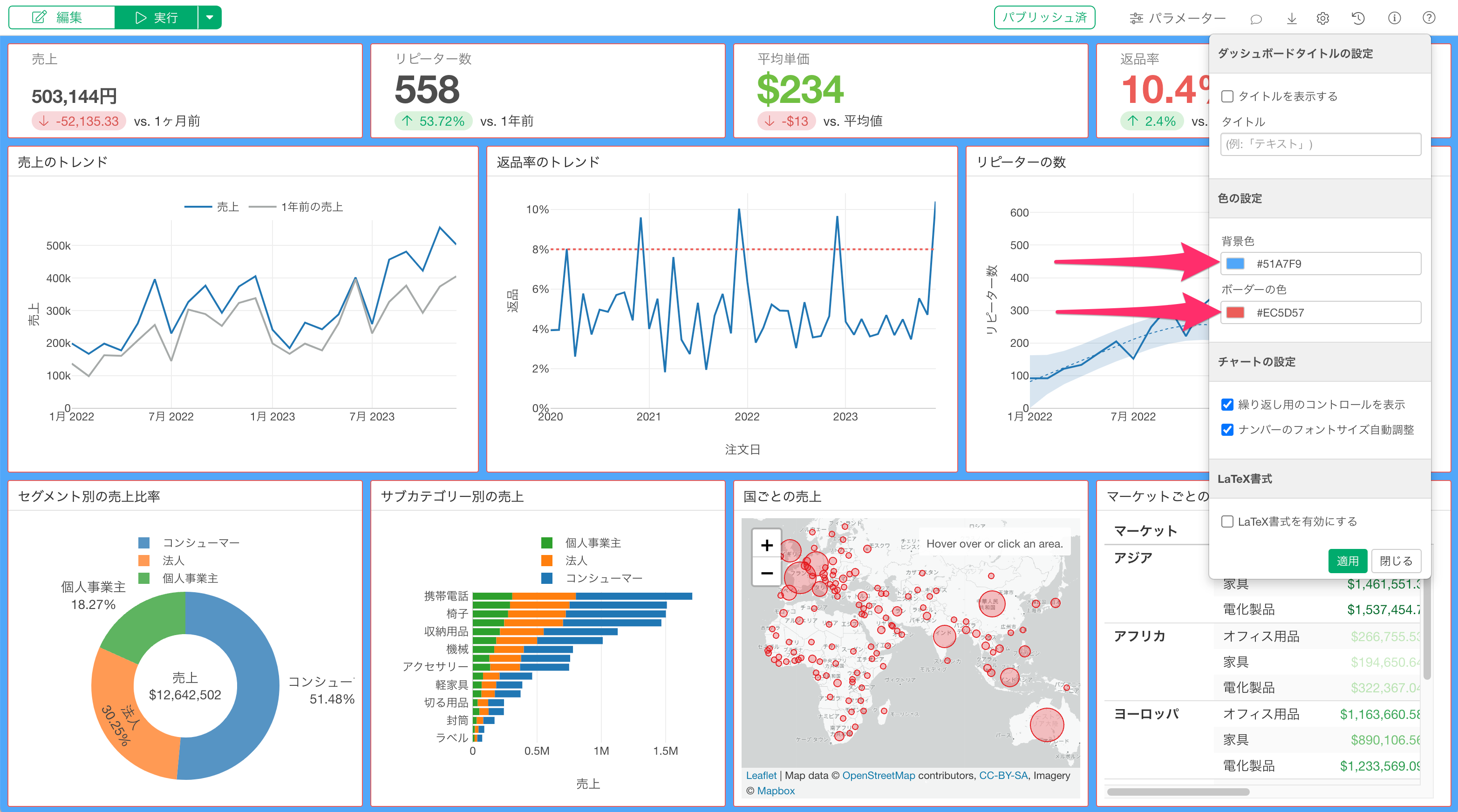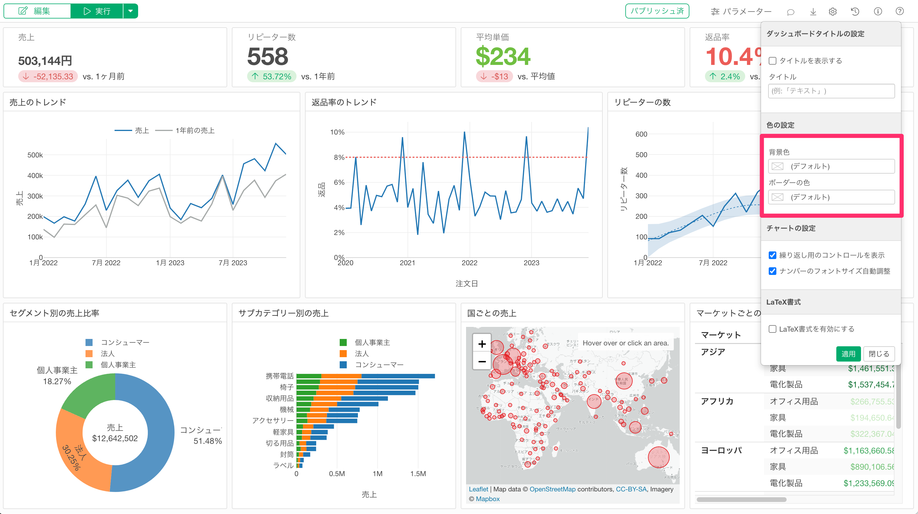 Exploratory デスクトップのv14.5から、ダッシュボードの設定ダイアログから背景色とコンテンツのボーダー色を変更できるようになりました。