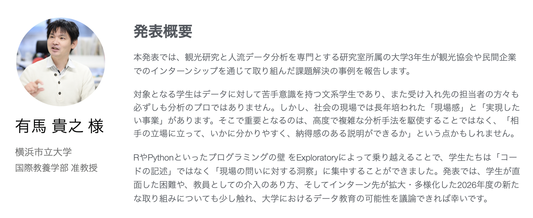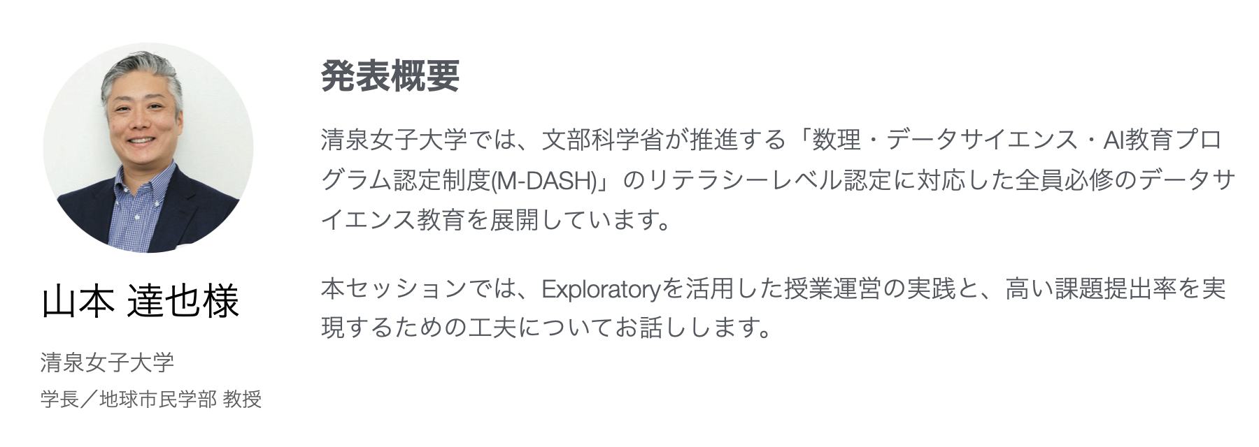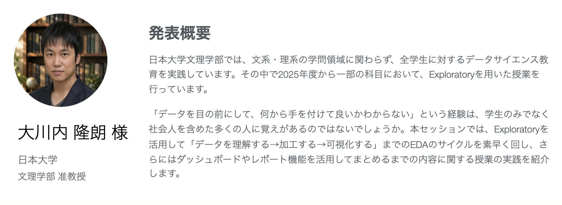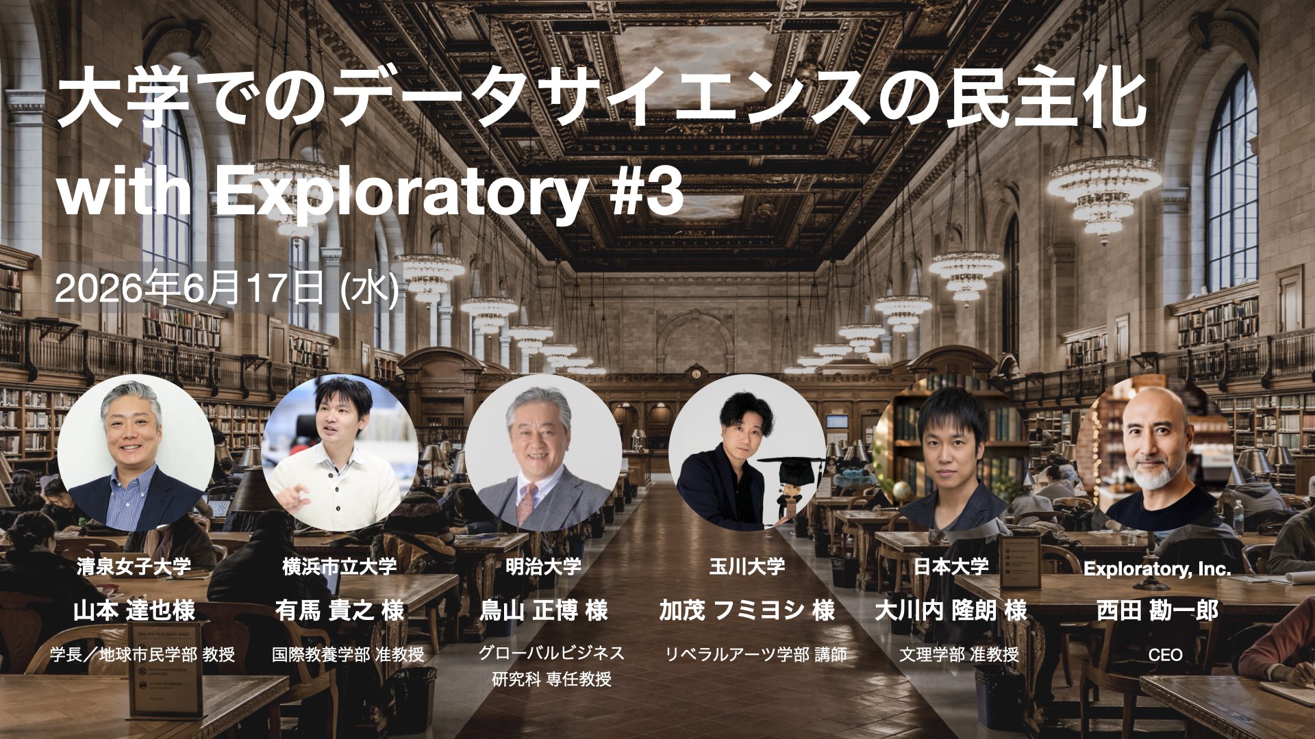 そこで、大学にてExploratoryを使って授業を実施している先生方の生の声をお届けするために、カリキュラム設計や授業を実施する上での注意しているポイントなどをお話しいただく「大学でのデータサイエンスの民主化 with Exploratory」のセミナーを東京で実施することとなりました。