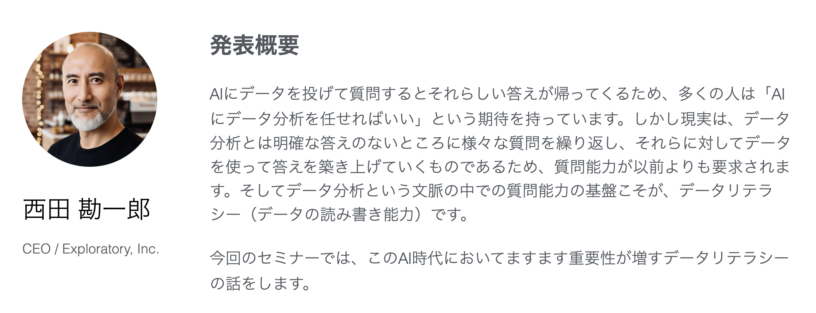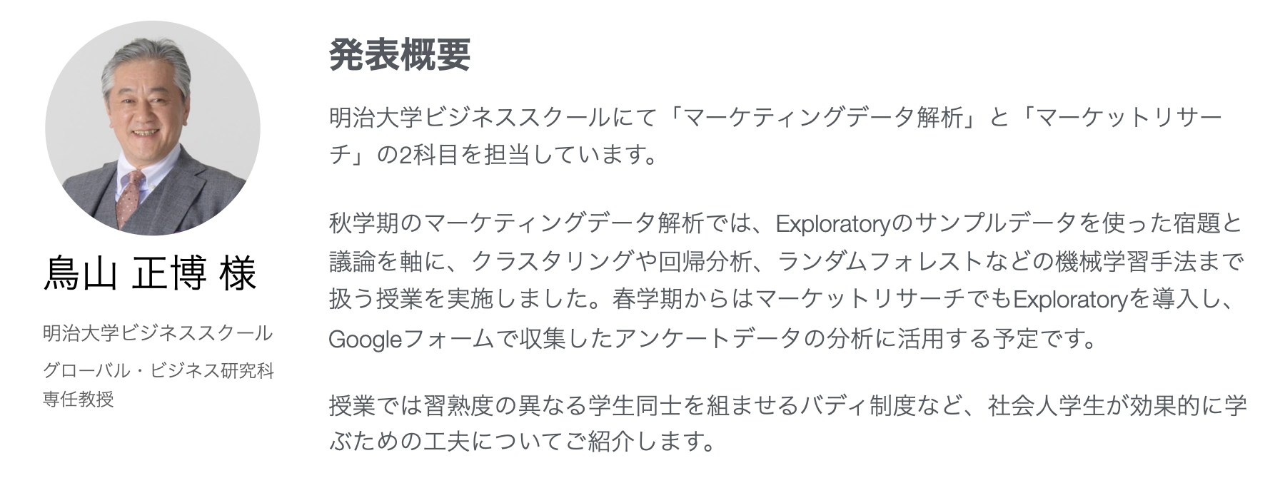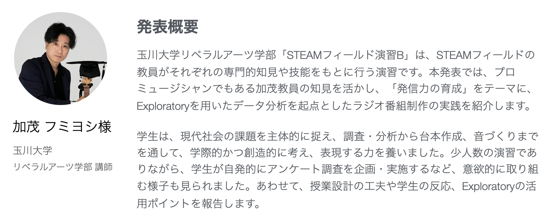 そこで、大学にてExploratoryを使って授業を実施している先生方の生の声をお届けするために、カリキュラム設計や授業を実施する上での注意しているポイントなどをお話しいただく「大学でのデータサイエンスの民主化 with Exploratory」のセミナーを東京で実施することとなりました。