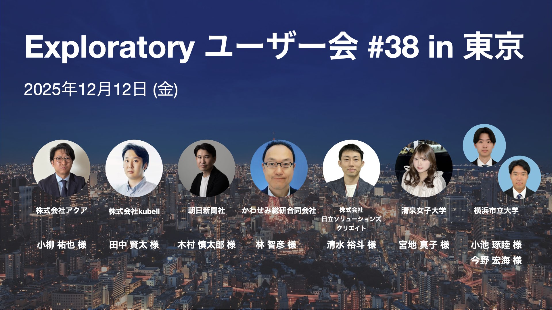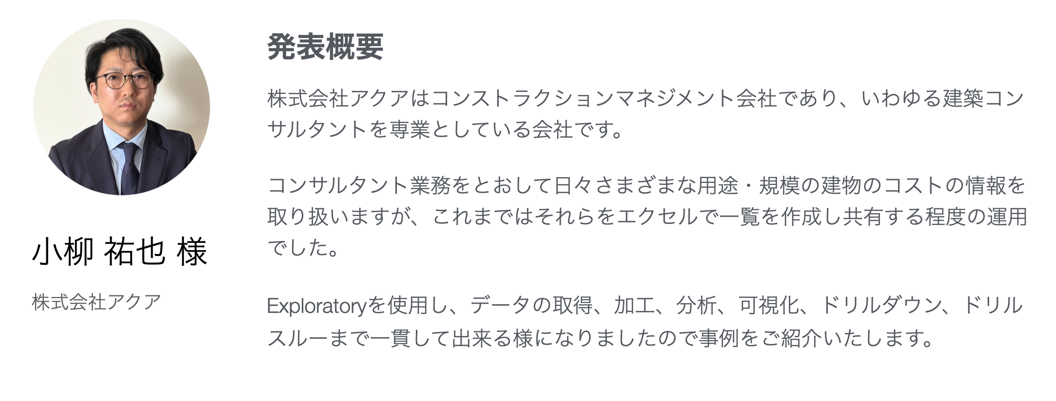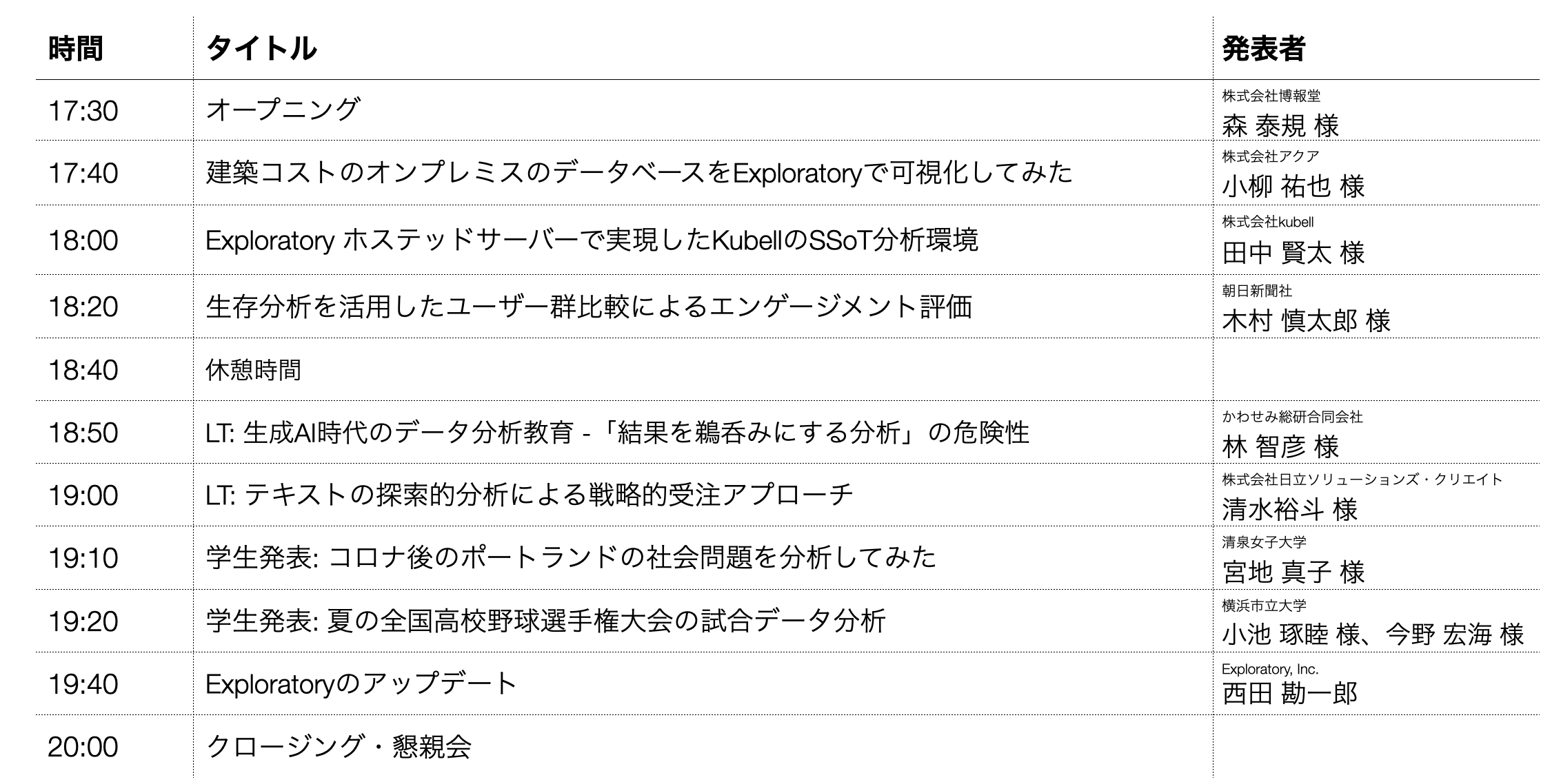Exploratoryユーザー会では、Exploratoryのユーザー様より活用事例や分析手法などの発表をしていただきます。