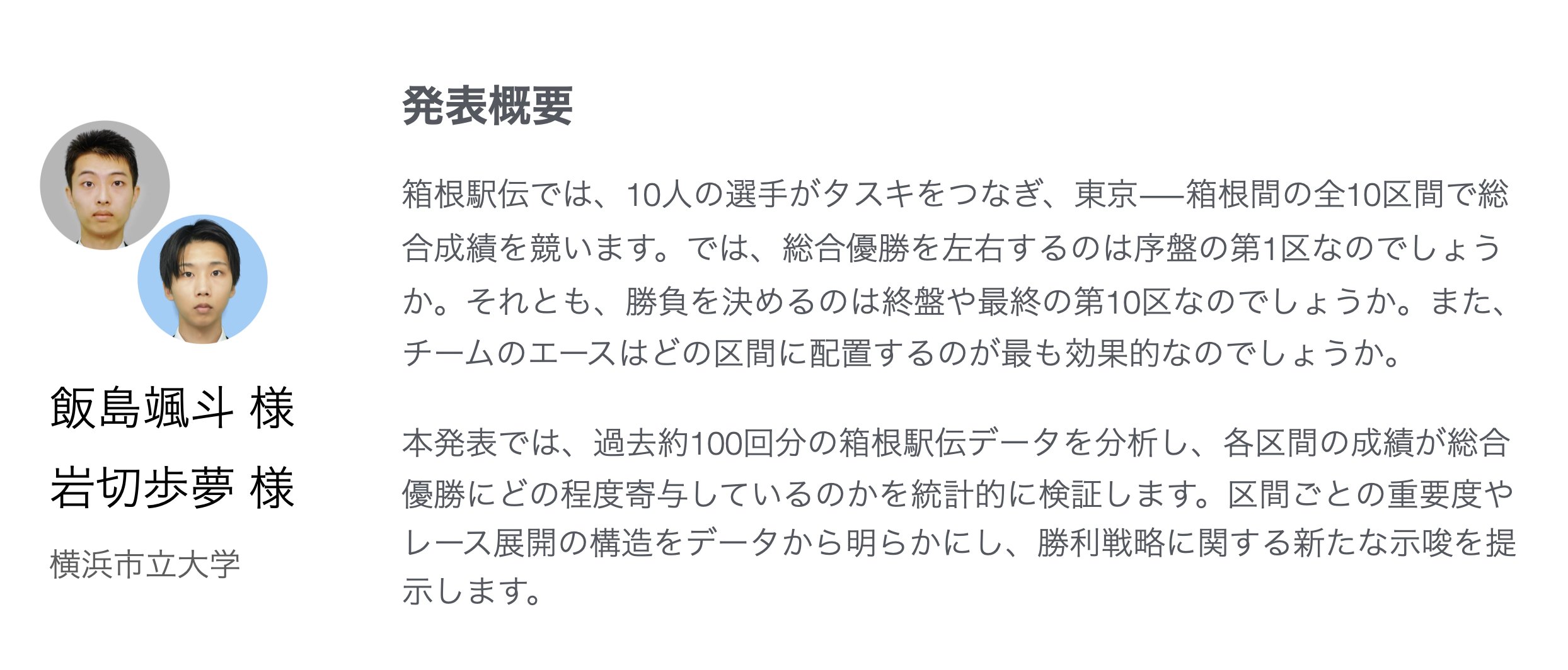 過去約100回分の箱根駅伝データをもとに、総合優勝に影響する区間や効果的な選手配置を統計的に分析した事例を紹介します。