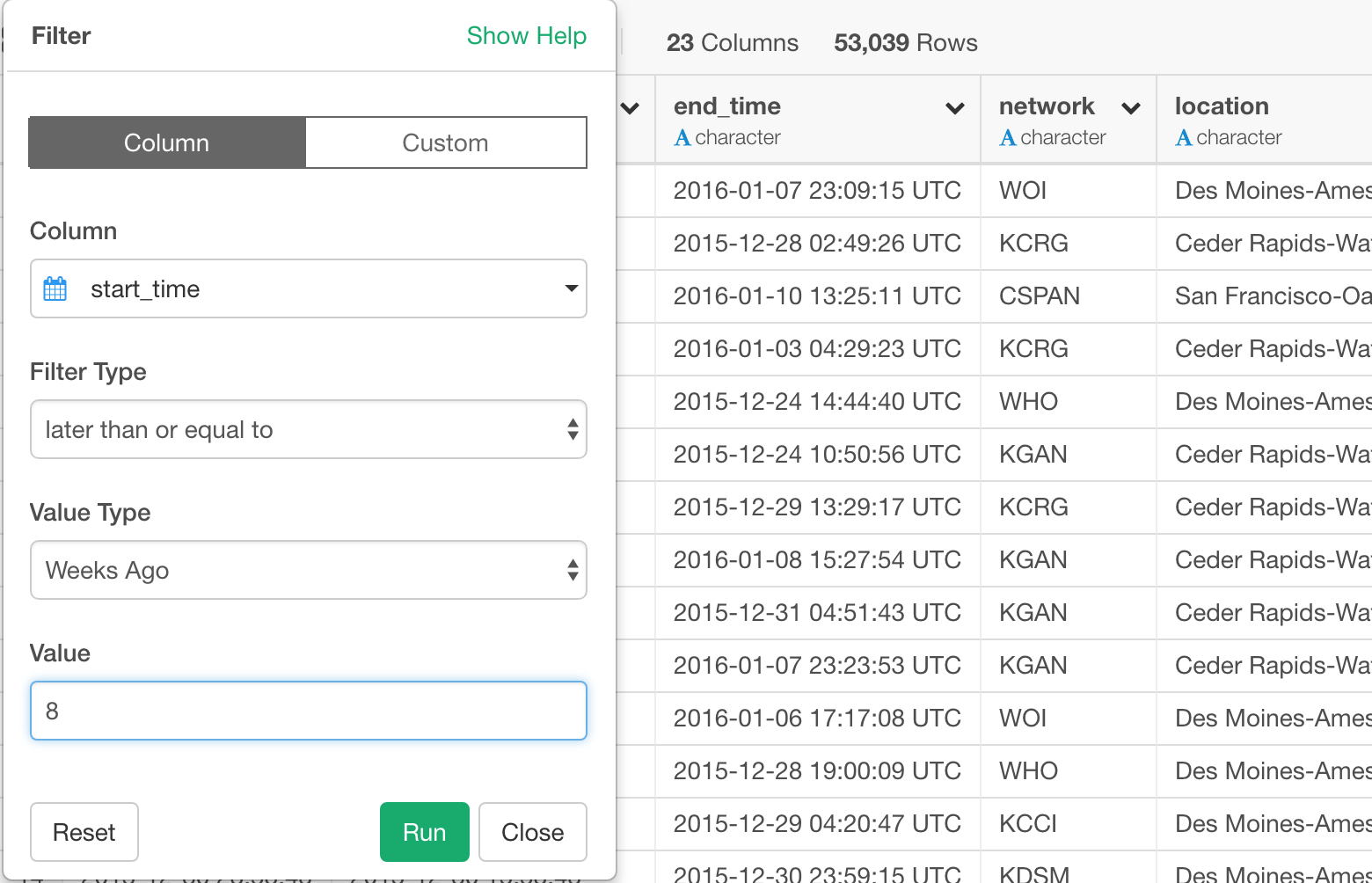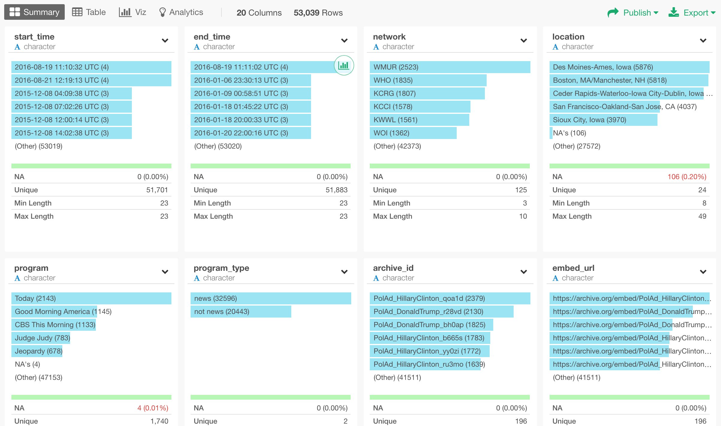 We’ll use the 2016 US Election TV Advertisement Campaign data, which was originally hosted at Political Ad Archive and I have cleaned up and shared it here. You can download it as either CSV or EDF (Exploratory Data Format) and import it into Exploratory.