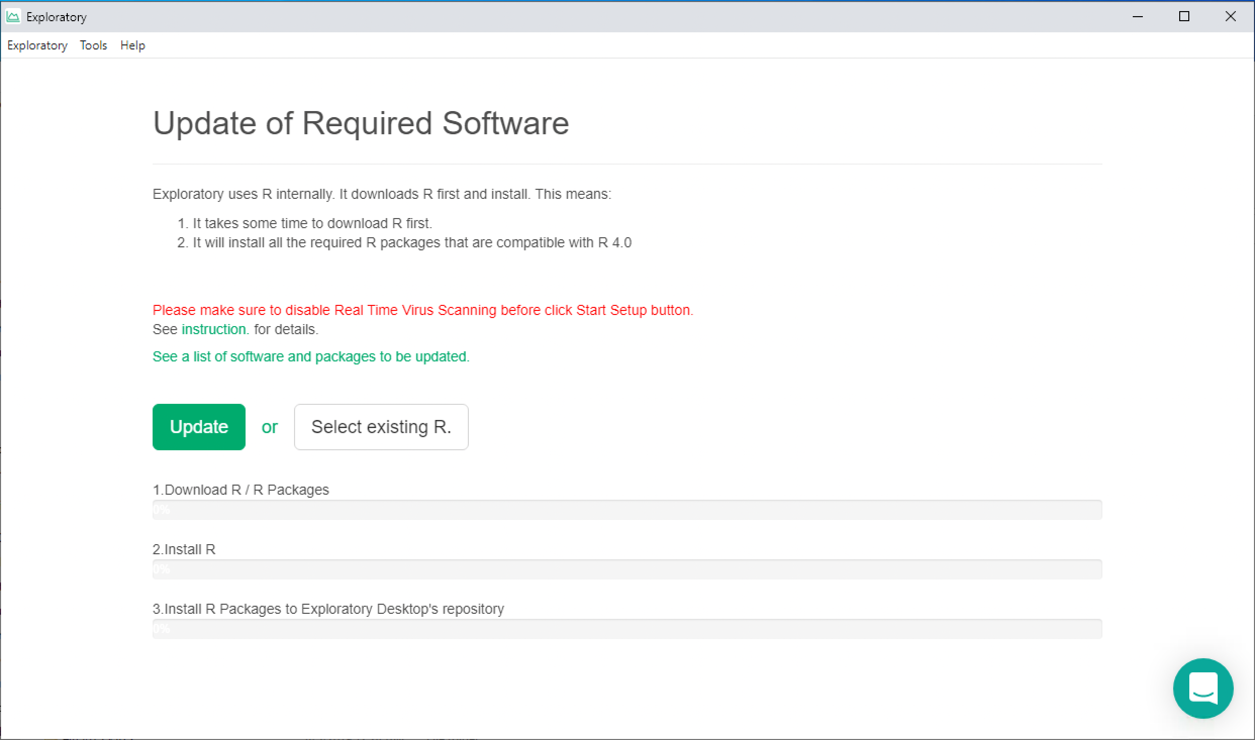 After the R was uninstalled, restart Exploratory Desktop. It will detect that R is missing, and shows the screen that looks like following.