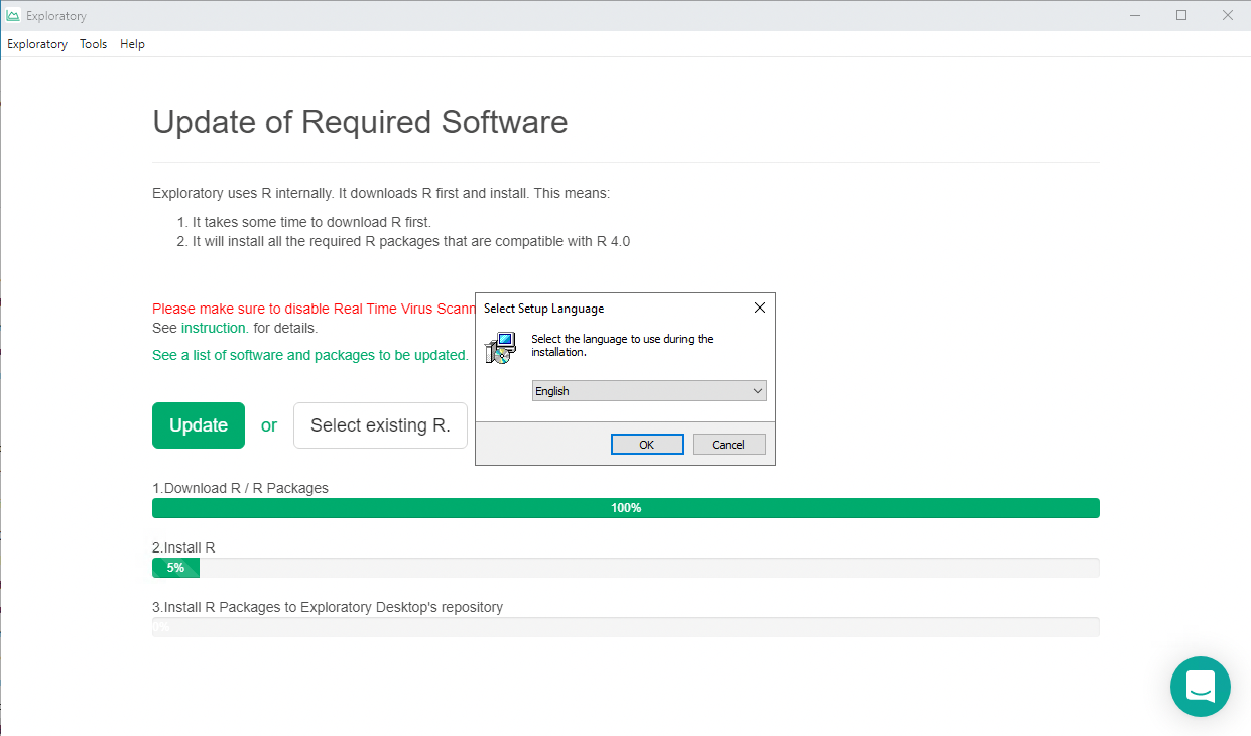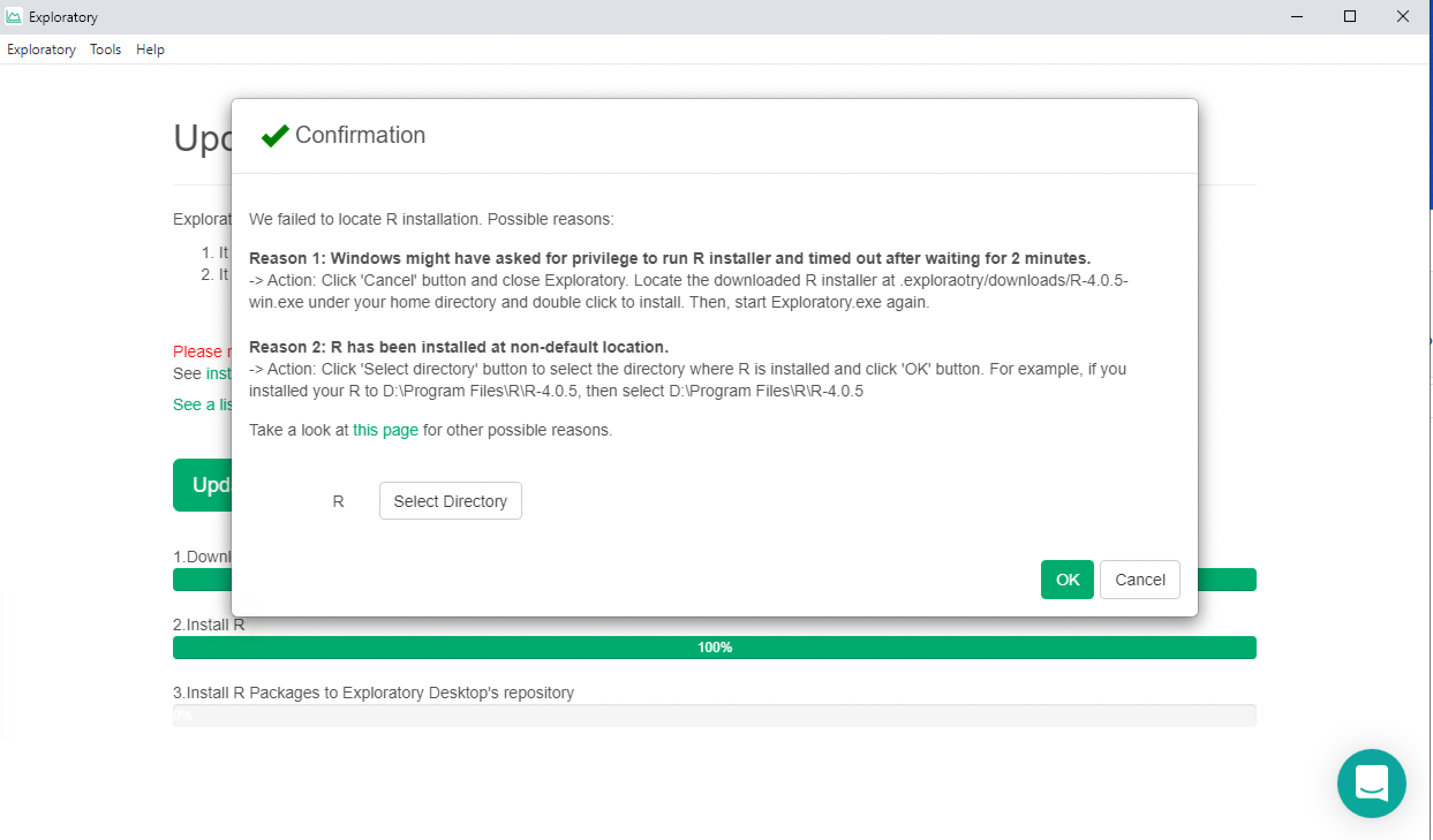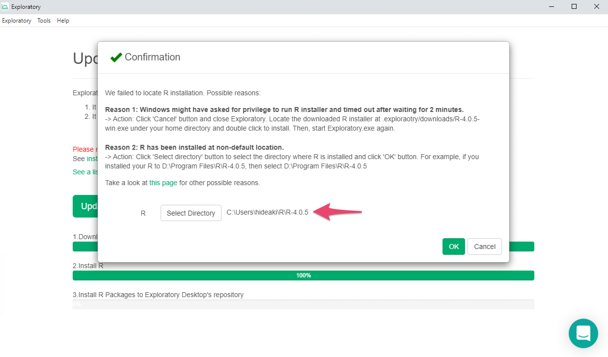 Then click OK. Exploratory will finish the rest of the reinstallation process, and will start working with the R installed at the new location.