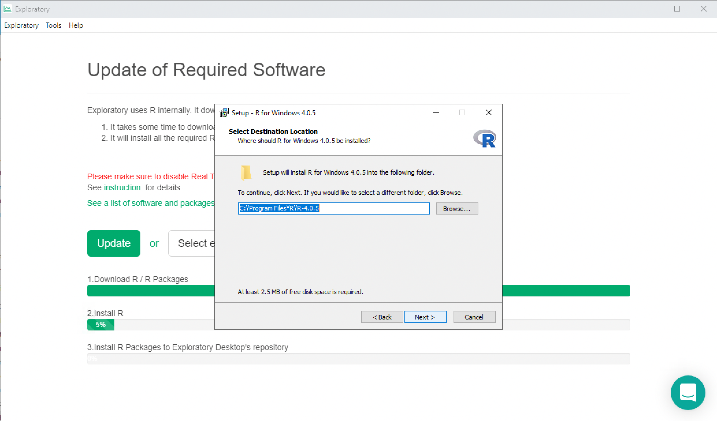 If you don't have R installed at the new location yet, click the "Update" button. It will download the R installer and starts it like the following screenshot.