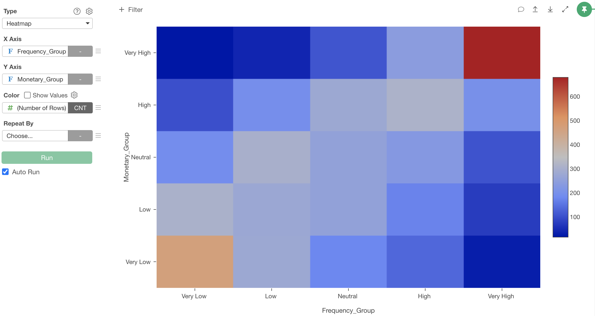 Next, you can visualize the customer segmentation results using a “Heat Map” chart to see which segments have the highest concentration of customers.
