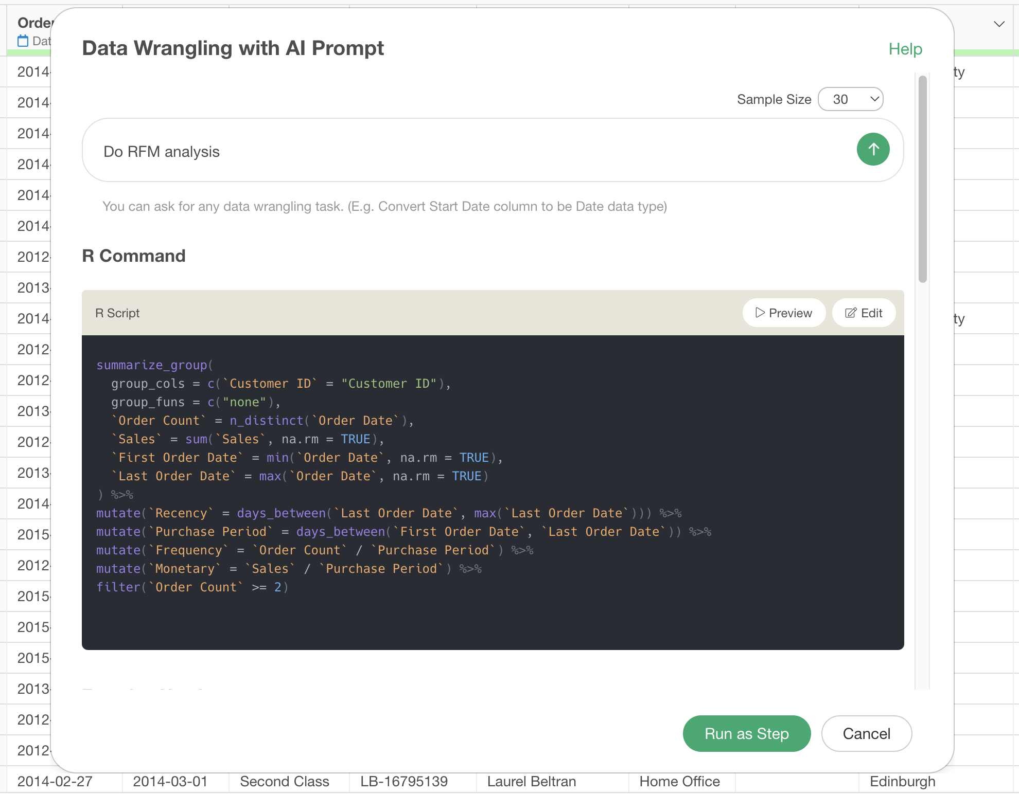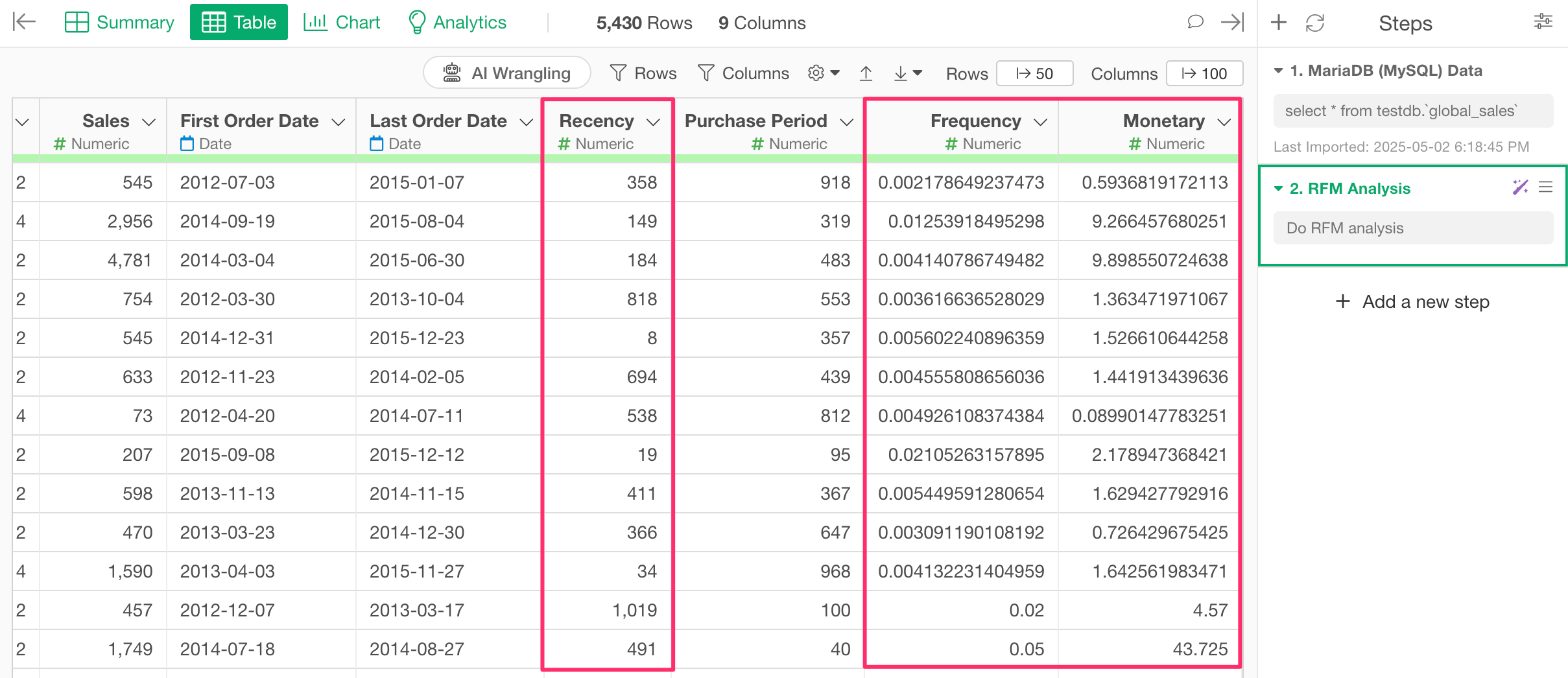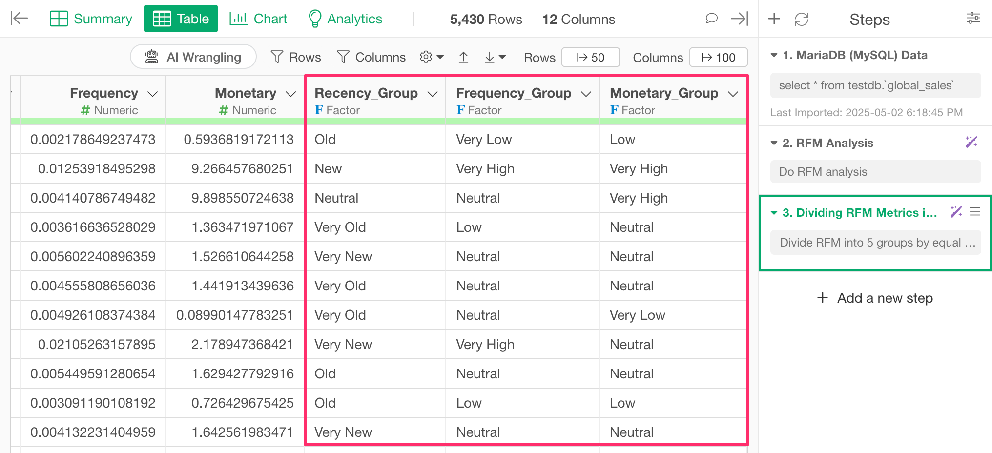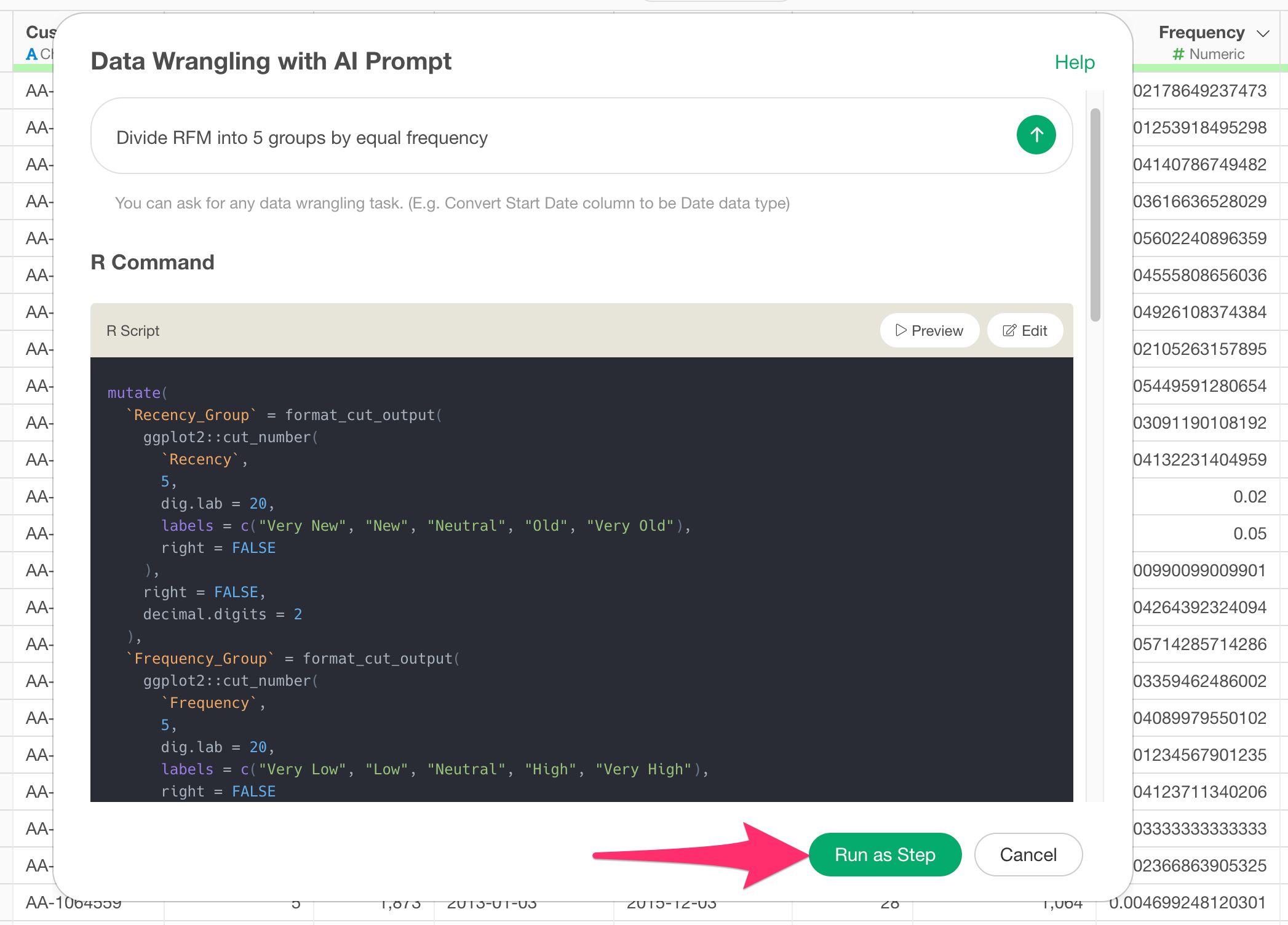 Previously, implementing RFM analysis required knowledge of data processing methods and the skills to put them into practice. With Exploratory, you can easily execute RFM analysis simply by giving instructions in natural language!