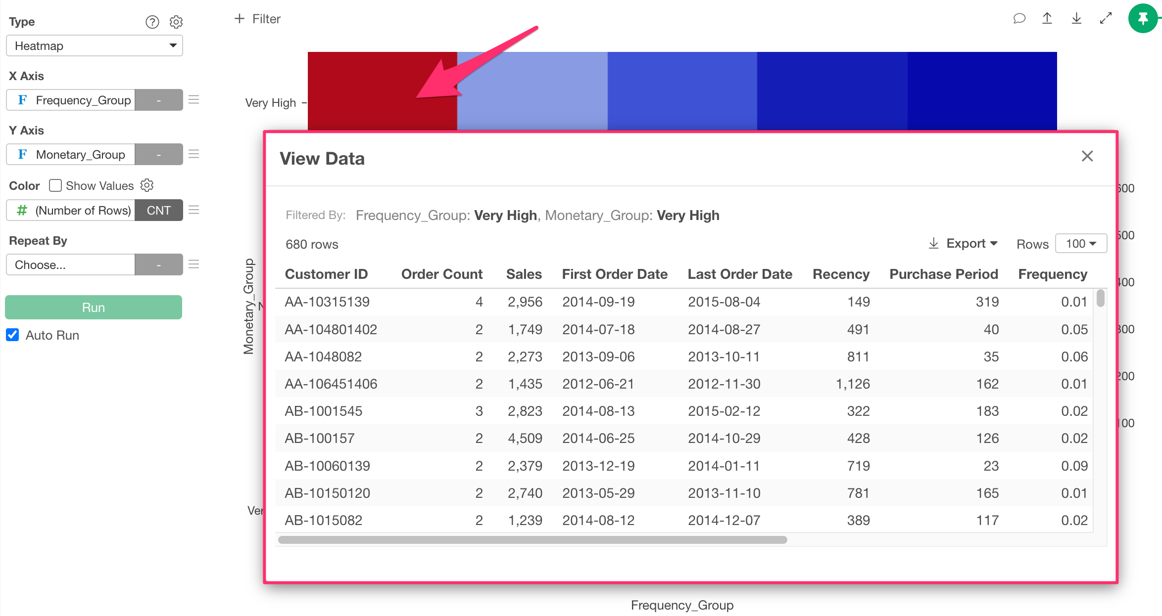 Furthermore, by clicking on each segment, you can check the information of customers in that segment or export the data.