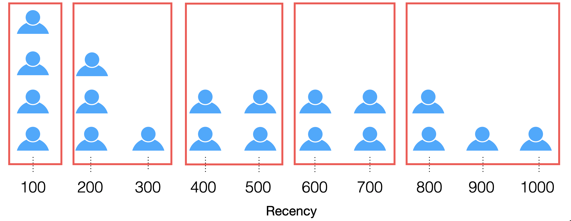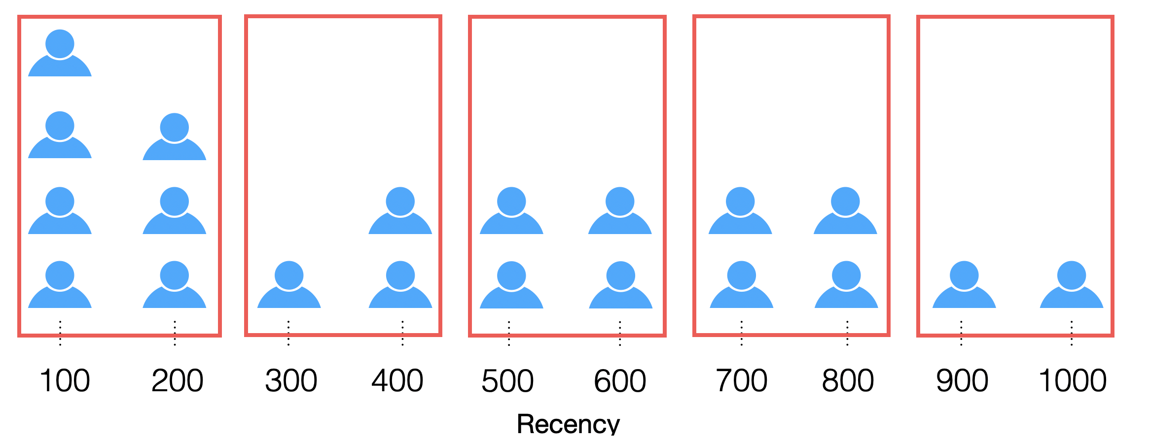 There are methods for dividing groups, such as equal width or equal frequency. (Depending on the data, customers may concentrate in areas with low purchase frequency or amount, so dividing groups by equal frequency tends to segment customers more evenly.)