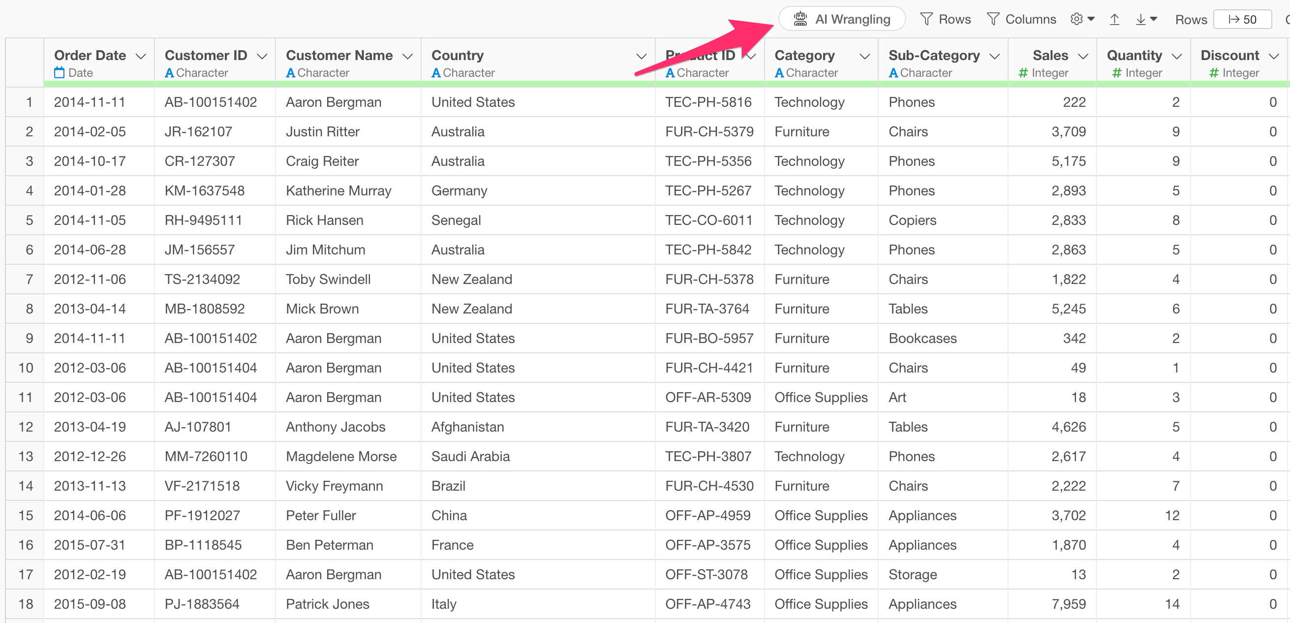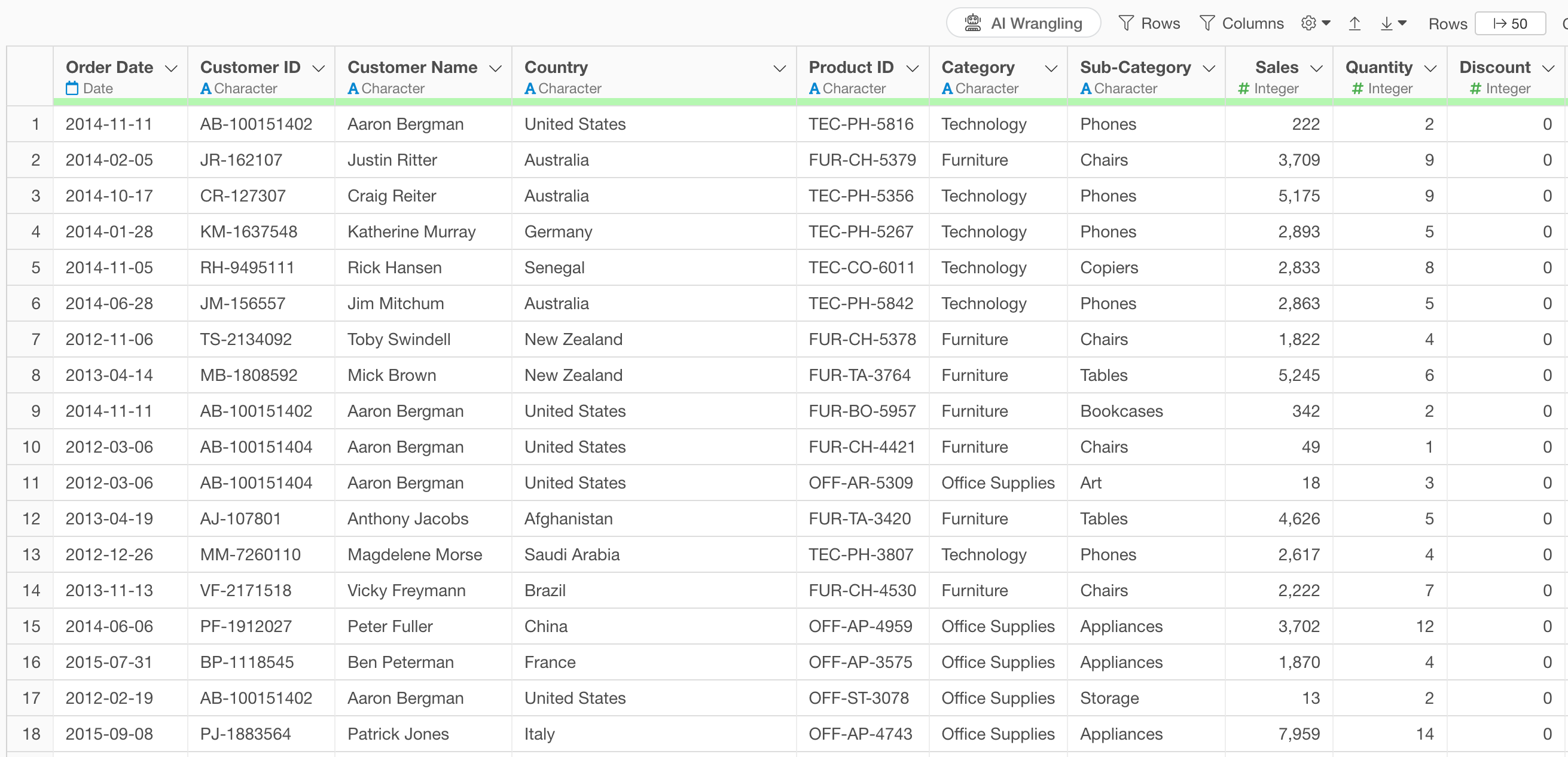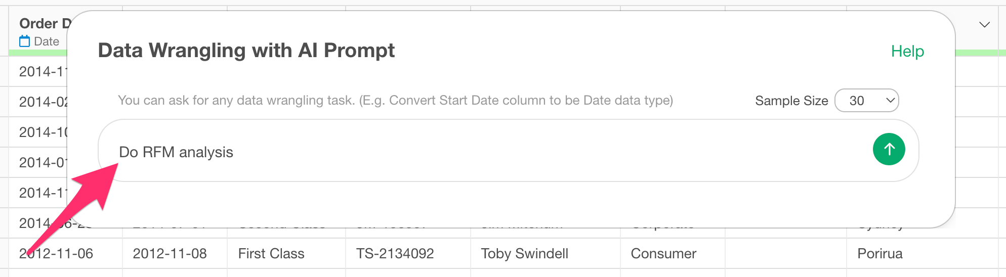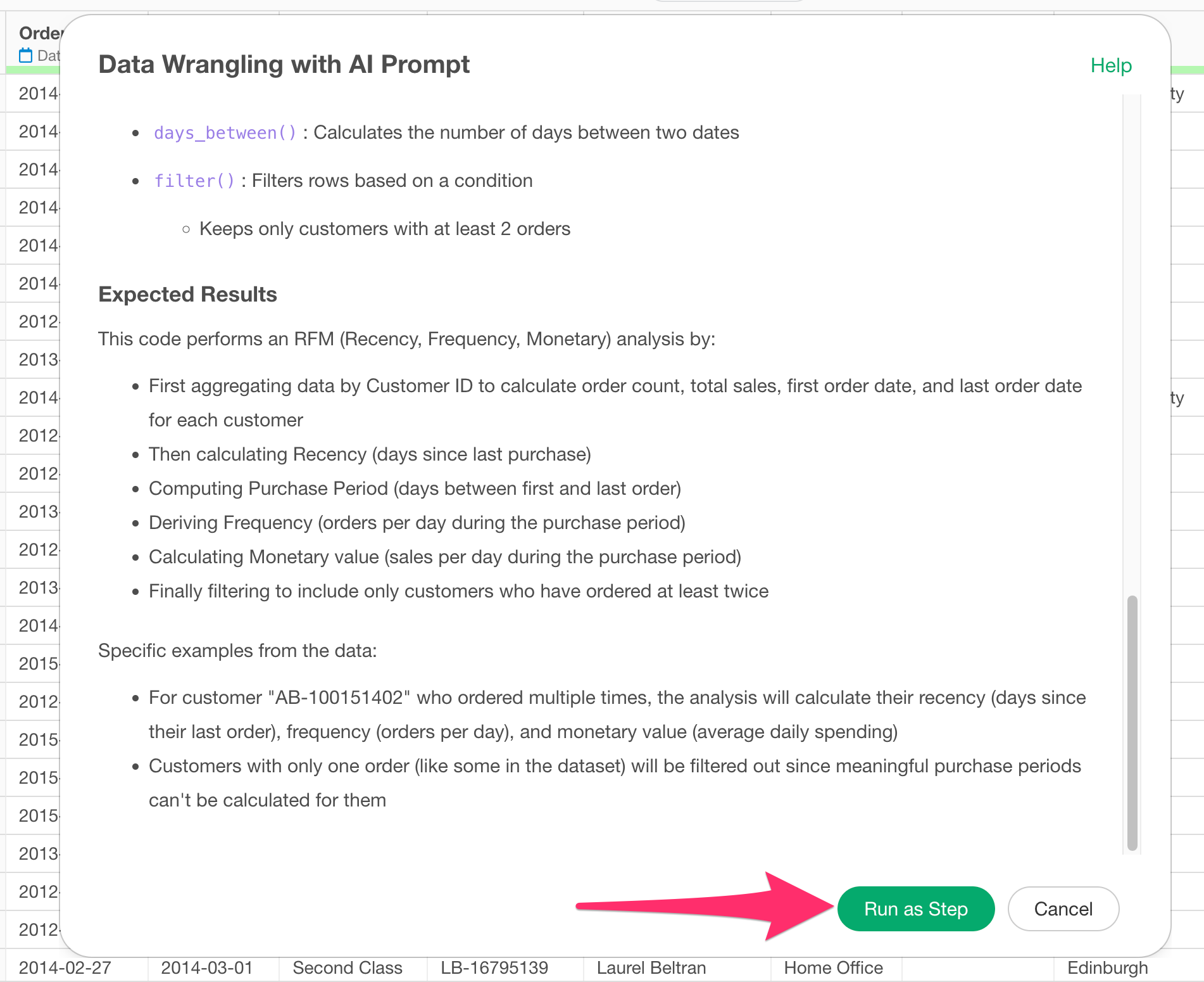 In this example, we’ll execute RFM analysis using AI Prompt on data where each row represents one order detail.
