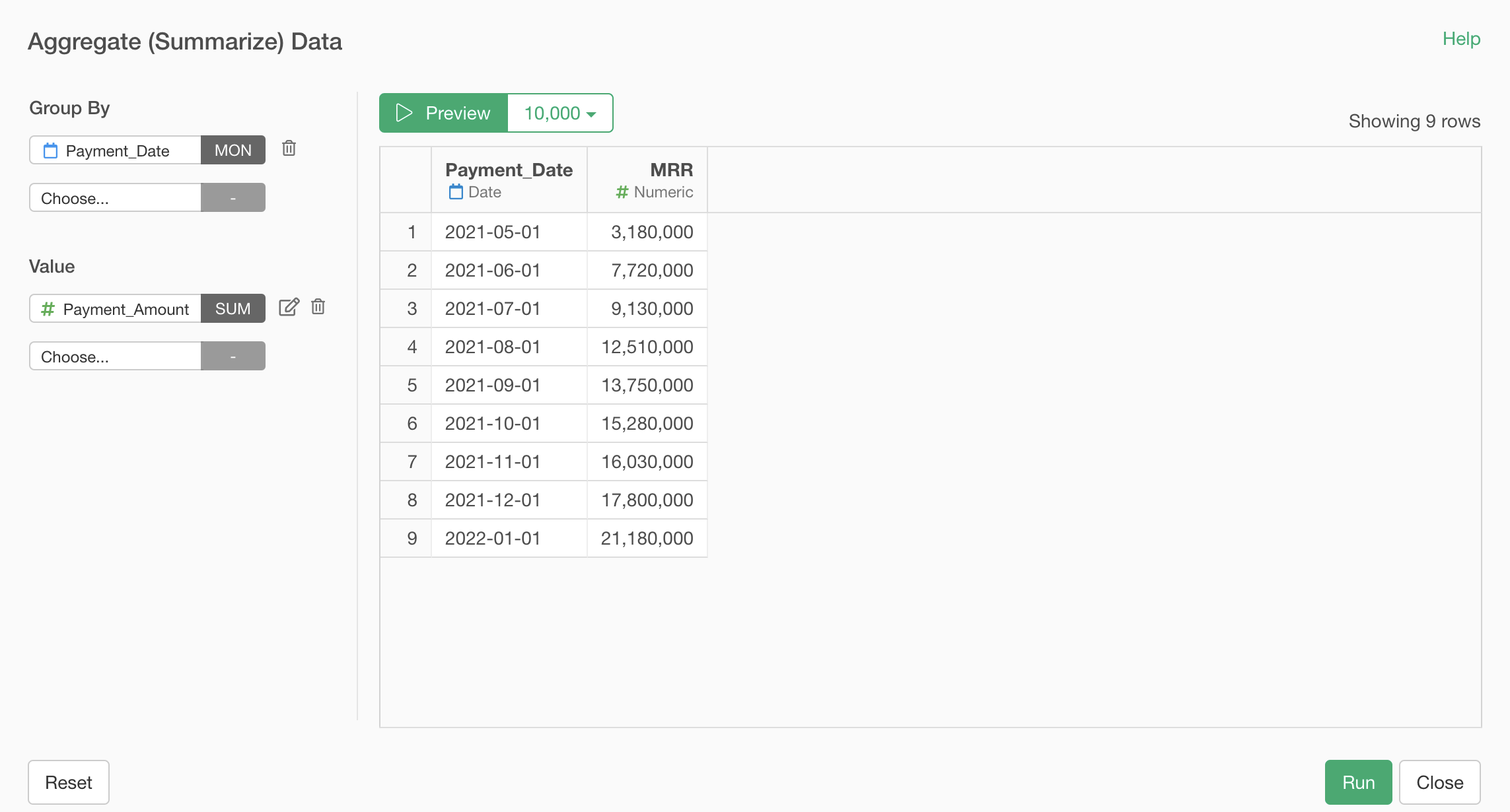 Finally, change the column name to “MRR” and click the preview button. When calculating annual ARPU, change the column name to “ARR”.